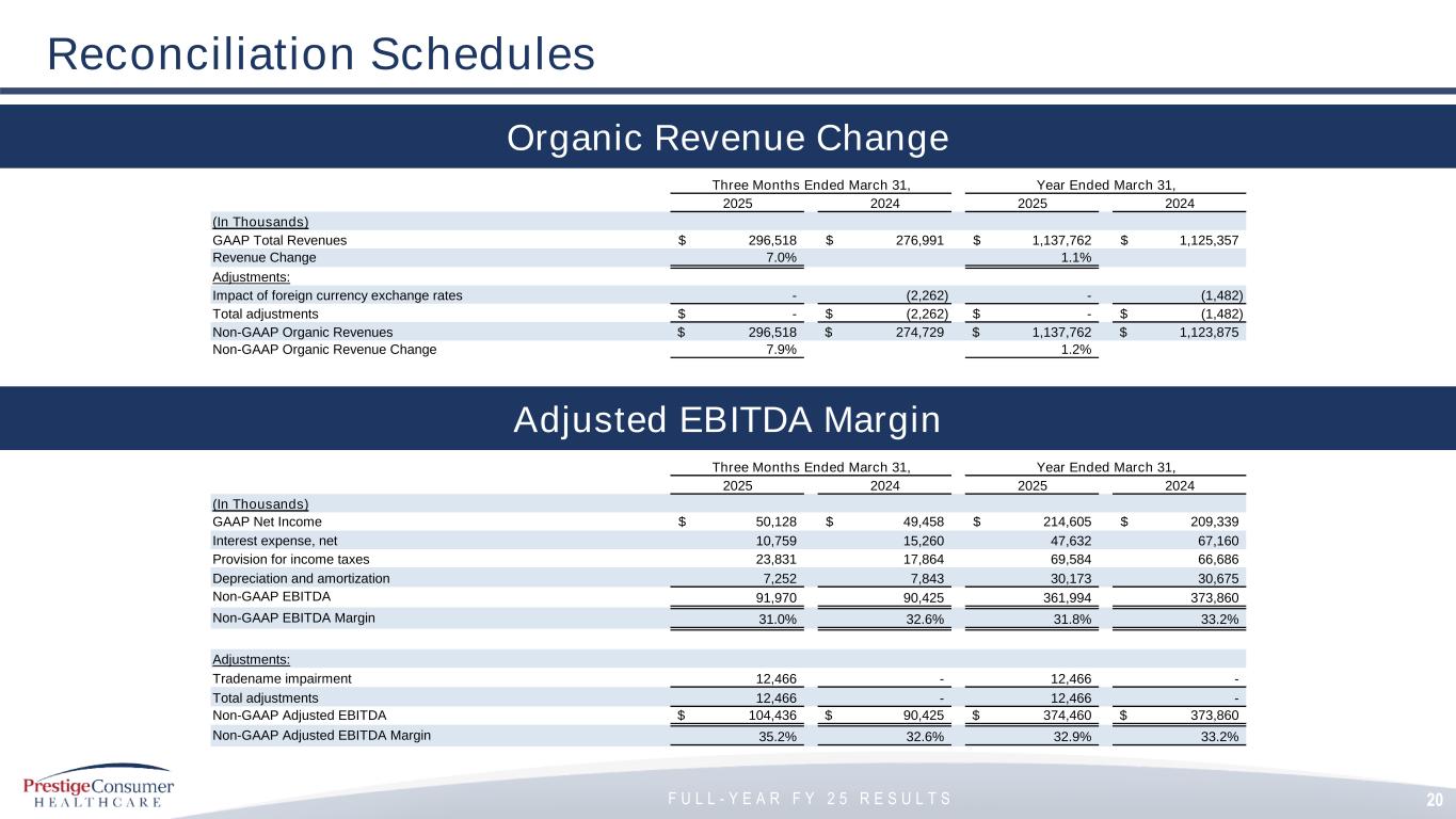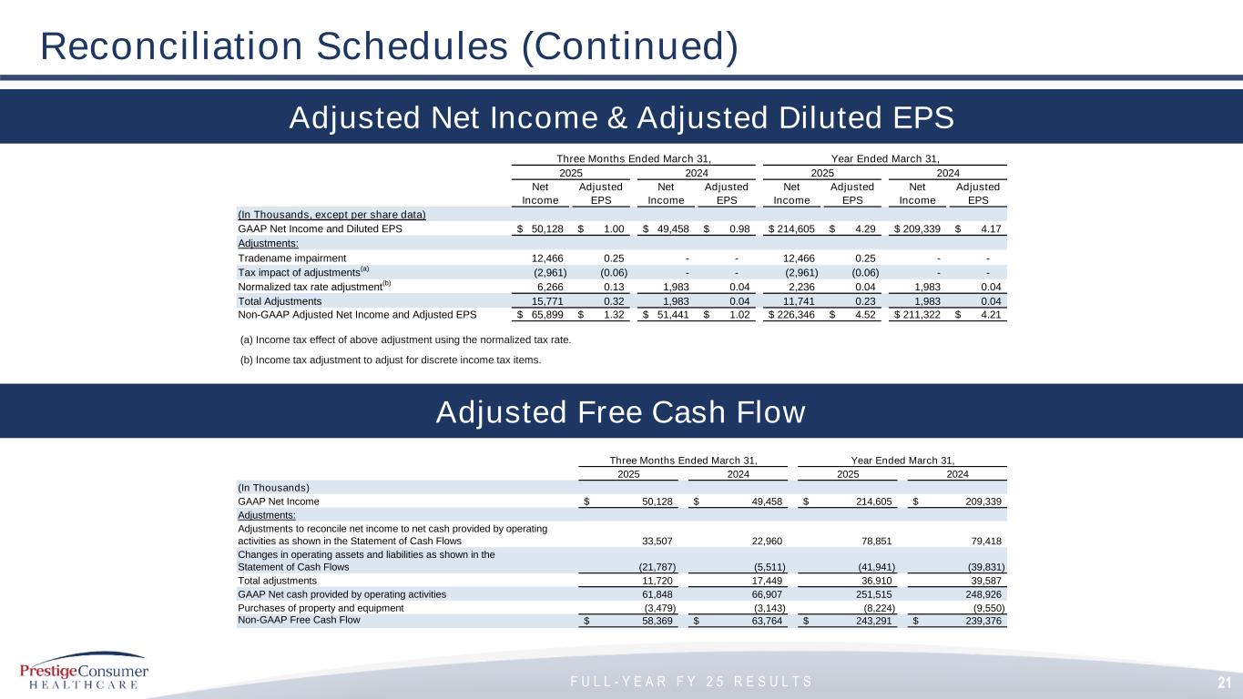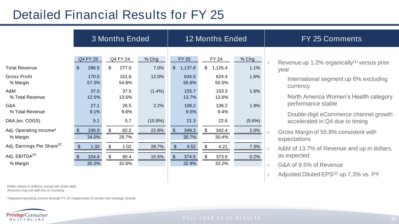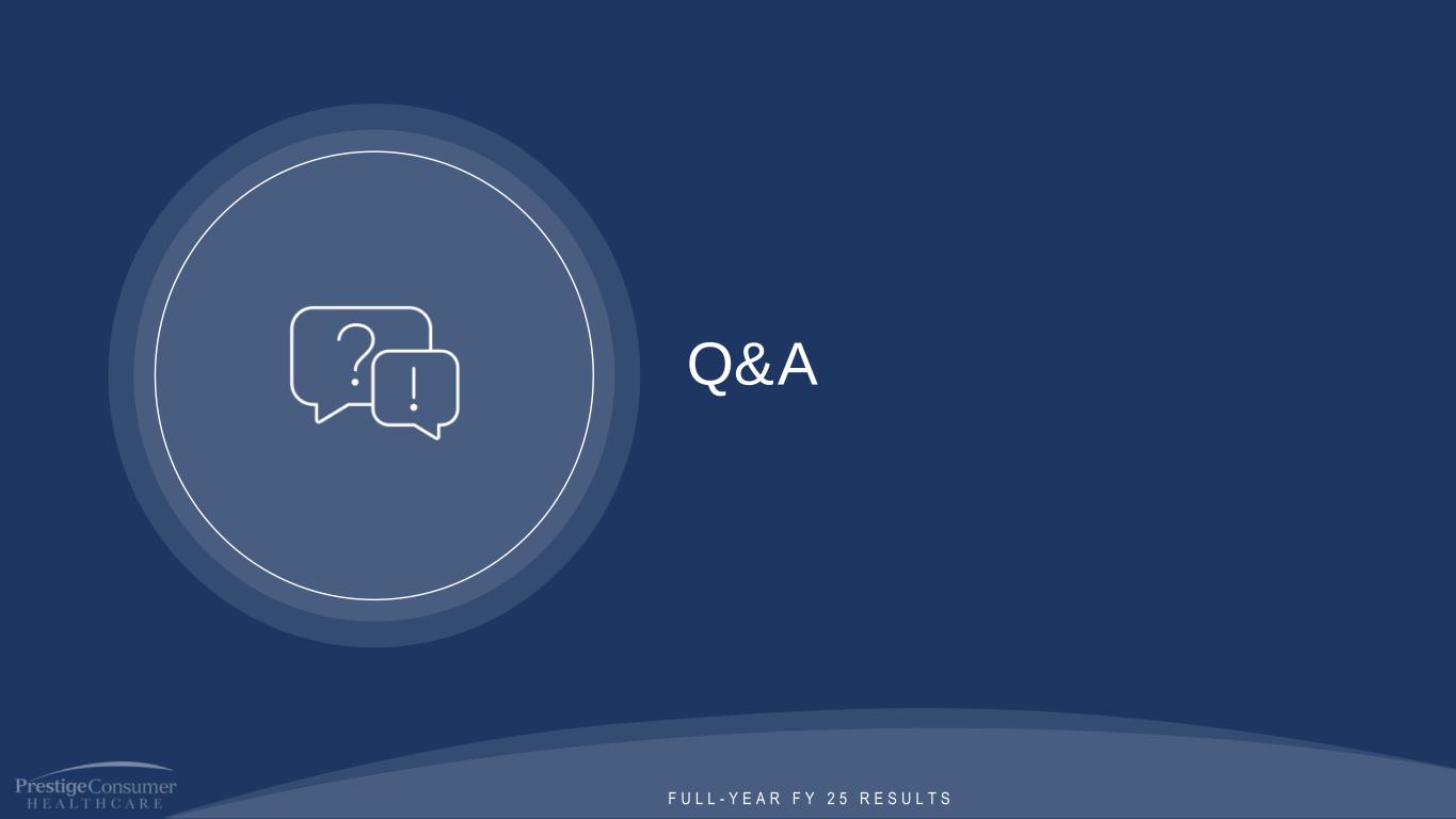 ニューヨーク州タリータウン--(GLOBE NEWSWIRE)--2025年5月8日--プレステージ・コンシューマー・ヘルスケア(NYSE:PBH)は本日、2025年3月31日を期末とする第4四半期および会計年度の決算を発表した。