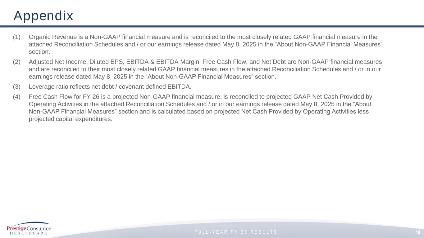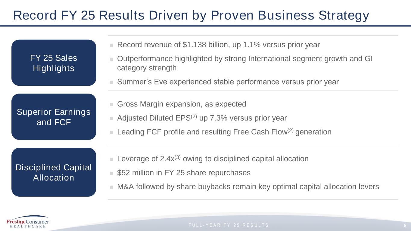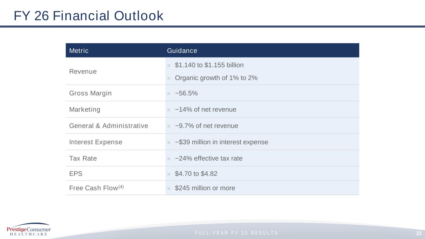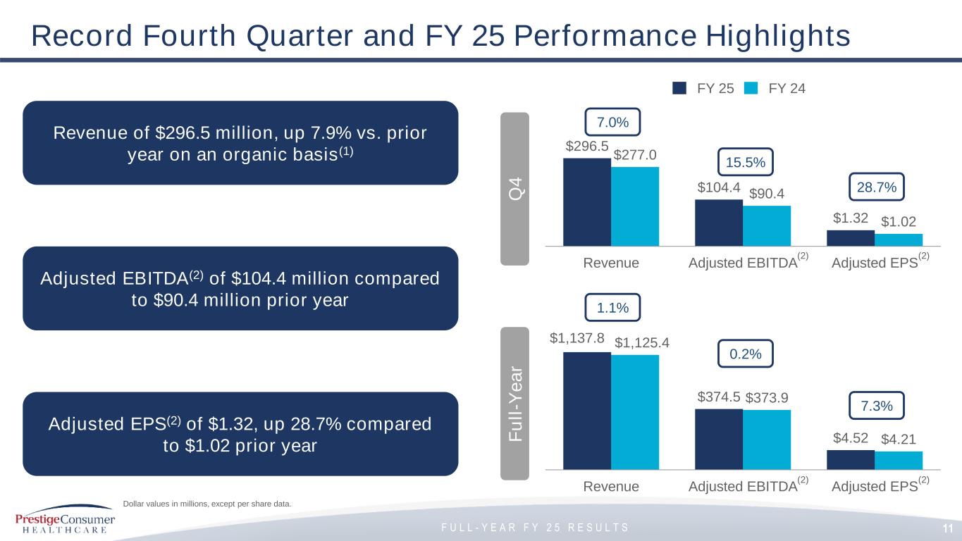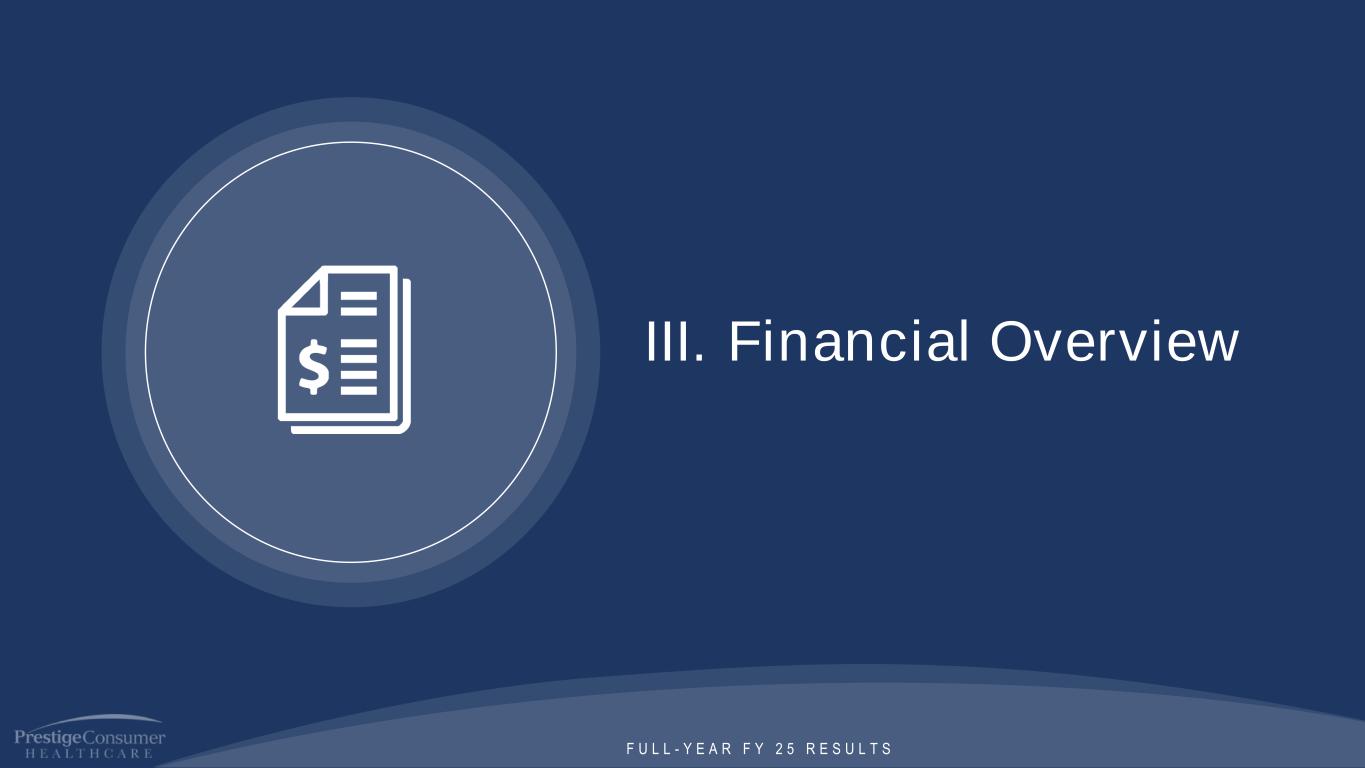 ニューヨーク州タリータウン--(GLOBE NEWSWIRE)--2025年5月8日--プレステージ・コンシューマー・ヘルスケア(NYSE:PBH)は本日、2025年3月31日を期末とする第4四半期および会計年度の決算を発表した。