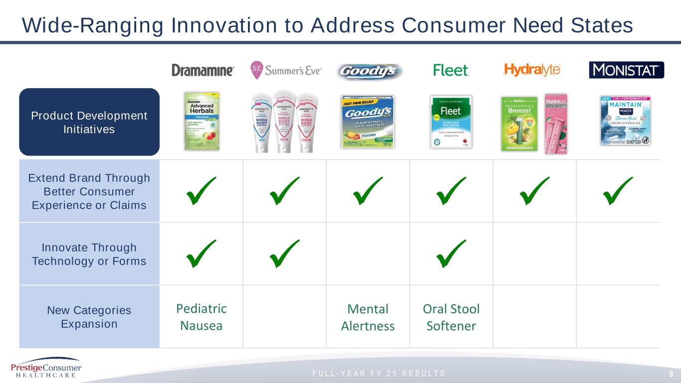 プレステージ・コンシューマー・ヘルスケアは消費者向けヘルスケア製品のリーディングカンパニーであり、米国、カナダ、オーストラリア、その他一部の国際市場で販売を行っている。当社の多様なブランドポートフォリオには、Monistat®およびSummer's Eve®女性用健康製品、BC®およびGoody's®鎮痛剤、Clear Eyes®およびTheraTears®アイケア製品、DenTek®特殊口腔ケア製品、Dramamine®乗り物酔い治療薬、Fleet®浣腸およびグリセリン坐薬、Chloraseptic®およびLuden's®のど用治療薬および点眼薬が含まれる、CompoundW®イボ治療薬、Little Remedies®小児用市販薬、Boudreaux's Butt Paste®おむつかぶれ軟膏、Nix®シラミ治療薬、Debrox®耳垢除去薬、Gaviscon®制酸薬(カナダ)、Hydralyte®水分補給製品とFess®鼻腔・副鼻腔ケア製品ライン(オーストラリア)。当社のウェブサイトwww.prestigeconsumerhealthcare.com。