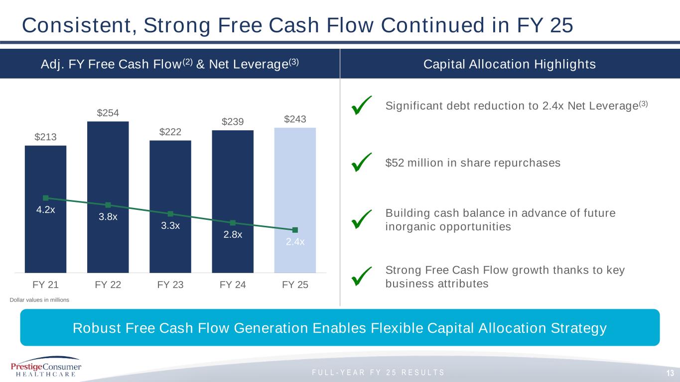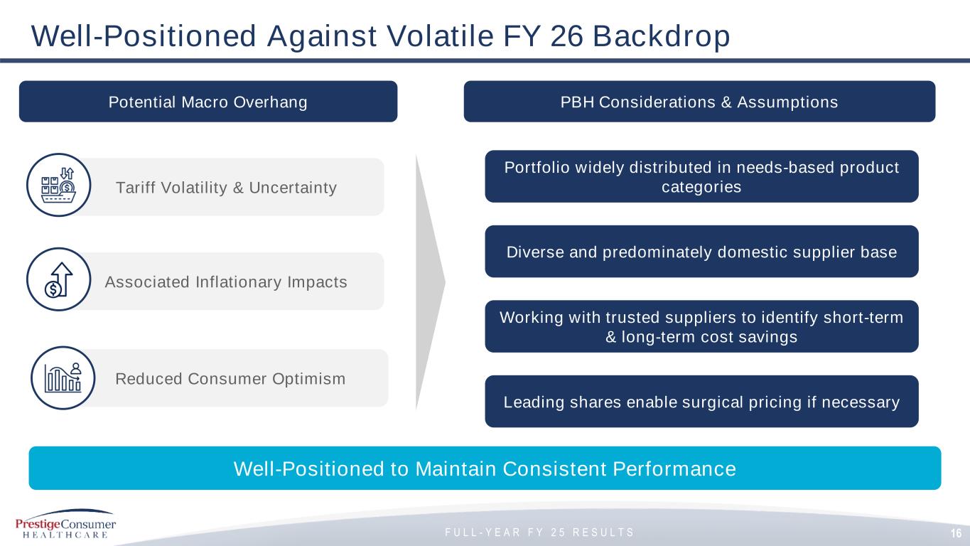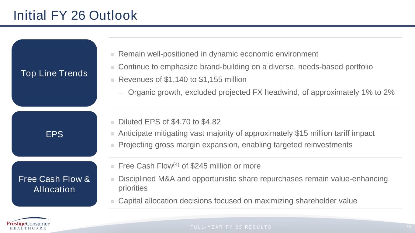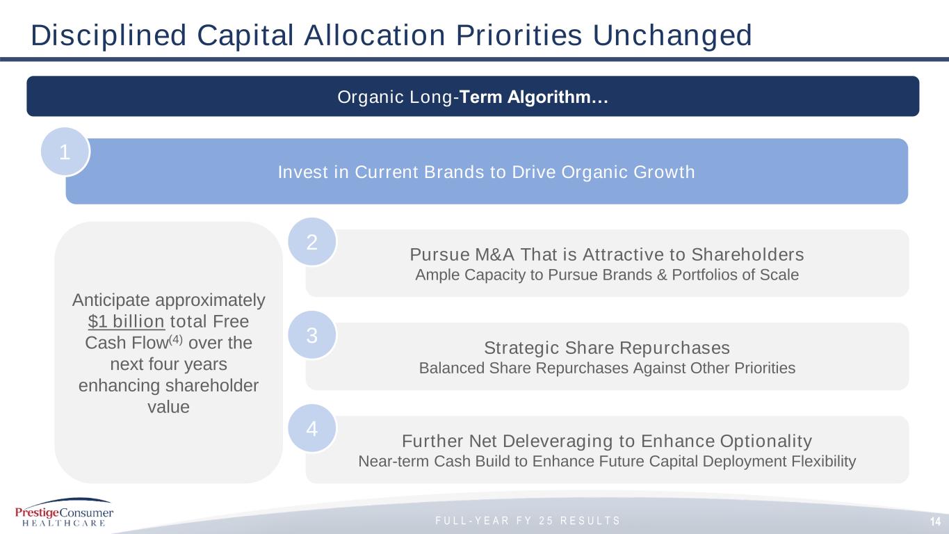 「今年度も安定した売上高と一株当たり利益の成長を達成できたことを大変喜ばしく思います。第4四半期の売上高は予想を上回る記録的なものとなりました。これは、海外事業の継続的な好調、北米における幅広いカテゴリーとブランドの成長、そして長期的な投資と幅広い販売網によるeコマース・チャネルの成功によるものです。プレステージ・コンシューマー・ヘルスケアのロン・ロンバルディ最高経営責任者(CEO)は、次のように語っています。「その結果、収益は力強いフリーキャッシュフローとなり、自社株買い、M&A、デレバレッジを含む規律ある資本配分の継続により、株主還元を拡大することができました。