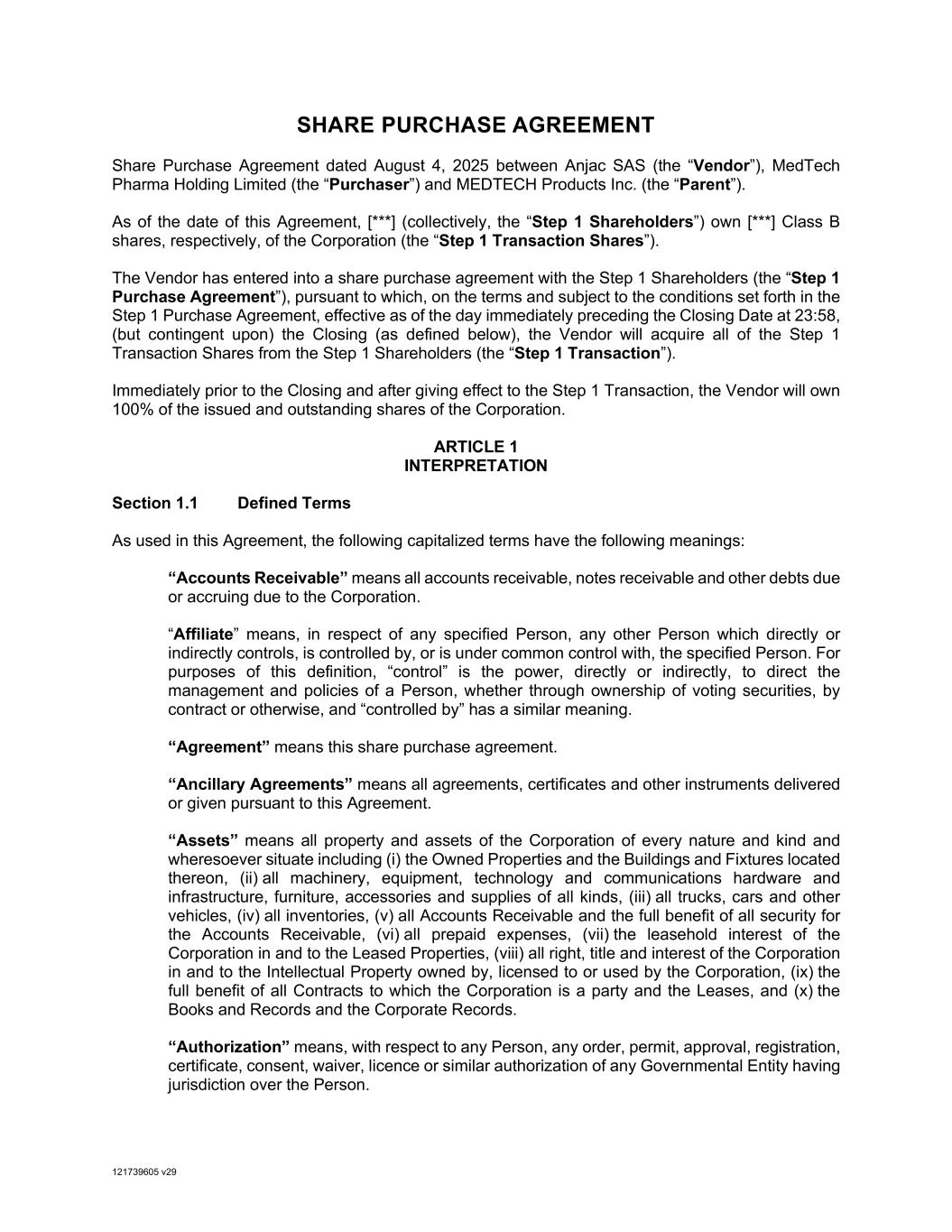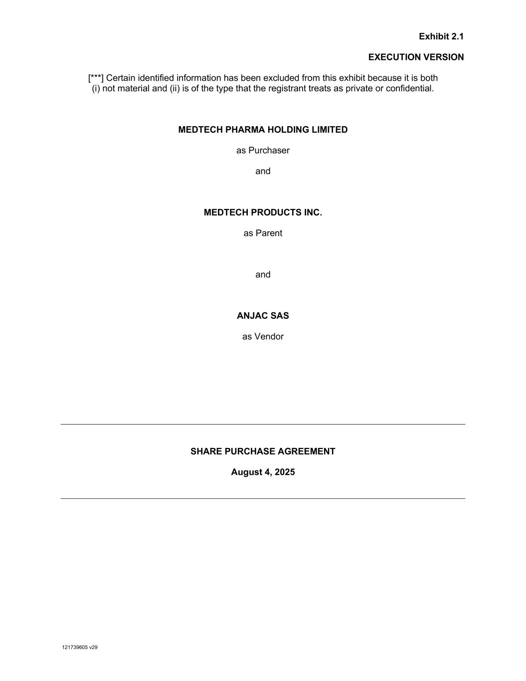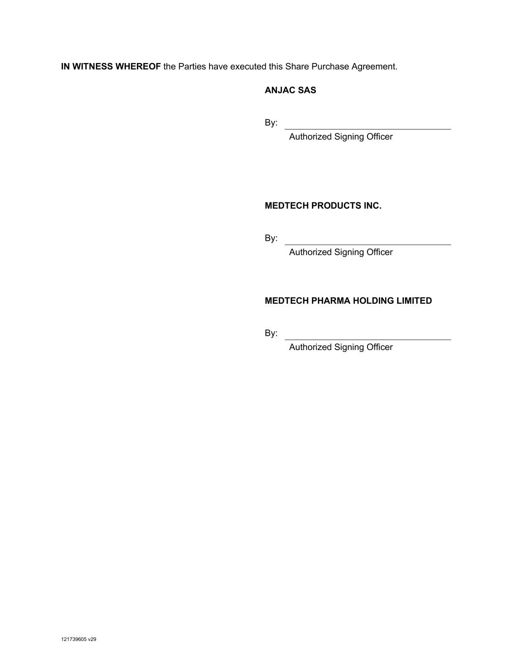 121739605 v29 IN WITNESS WHEREOF the Parties have executed this Share Purchase Agreement. ANJAC SAS By: Authorized Signing Officer MEDTECH PRODUCTS INC. By: Authorized Signing Officer MEDTECH PHARMA HOLDING LIMITED By: Authorized Signing Officer