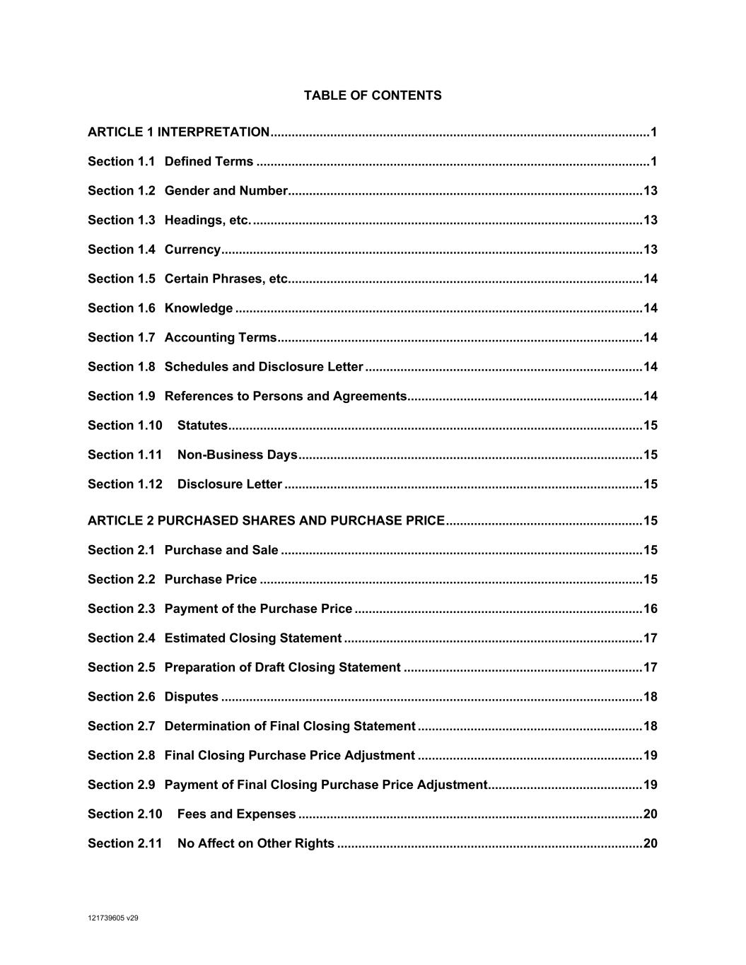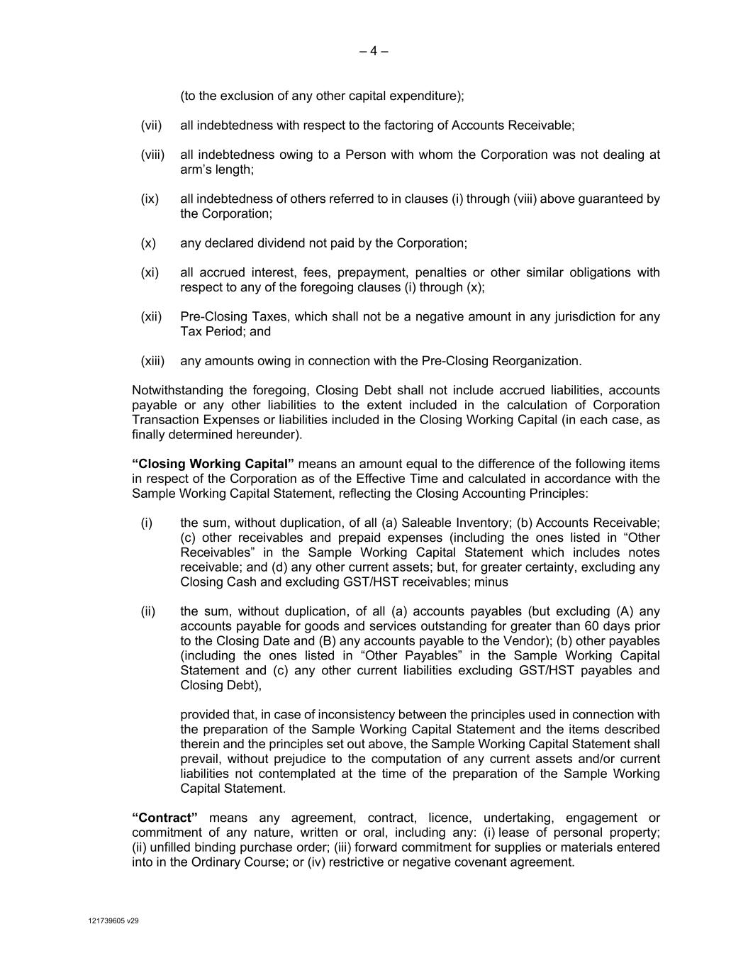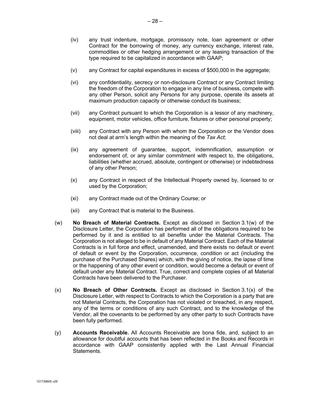 – 28 – 121739605 v29 (iv) any trust indenture, mortgage, promissory note, loan agreement or other Contract for the borrowing of money, any currency exchange, interest rate, commodities or other hedging arrangement or any leasing transaction of the type required to be capitalized in accordance with GAAP; (v) any Contract for capital expenditures in excess of $500,000 in the aggregate; (vi) any confidentiality, secrecy or non-disclosure Contract or any Contract limiting the freedom of the Corporation to engage in any line of business, compete with any other Person, solicit any Persons for any purpose, operate its assets at maximum production capacity or otherwise conduct its business; (vii) any Contract pursuant to which the Corporation is a lessor of any machinery, equipment, motor vehicles, office furniture, fixtures or other personal property; (viii) any Contract with any Person with whom the Corporation or the Vendor does not deal at arm’s length within the meaning of the Tax Act; (ix) any agreement of guarantee, support, indemnification, assumption or endorsement of, or any similar commitment with respect to, the obligations, liabilities (whether accrued, absolute, contingent or otherwise) or indebtedness of any other Person; (x) any Contract in respect of the Intellectual Property owned by, licensed to or used by the Corporation; (xi) any Contract made out of the Ordinary Course; or (xii) any Contract that is material to the Business. (w) No Breach of Material Contracts. Except as disclosed in Section 3.1(w) of the Disclosure Letter, the Corporation has performed all of the obligations required to be performed by it and is entitled to all benefits under the Material Contracts. The Corporation is not alleged to be in default of any Material Contract. Each of the Material Contracts is in full force and effect, unamended, and there exists no default or event of default or event by the Corporation, occurrence, condition or act (including the purchase of the Purchased Shares) which, with the giving of notice, the lapse of time or the happening of any other event or condition, would become a default or event of default under any Material Contract. True, correct and complete copies of all Material Contracts have been delivered to the Purchaser. (x) No Breach of Other Contracts. Except as disclosed in Section 3.1(x) of the Disclosure Letter, with respect to Contracts to which the Corporation is a party that are not Material Contracts, the Corporation has not violated or breached, in any respect, any of the terms or conditions of any such Contract, and to the knowledge of the Vendor, all the covenants to be performed by any other party to such Contracts have been fully performed. (y) Accounts Receivable. All Accounts Receivable are bona fide, and, subject to an allowance for doubtful accounts that has been reflected in the Books and Records in accordance with GAAP consistently applied with the Last Annual Financial Statements.