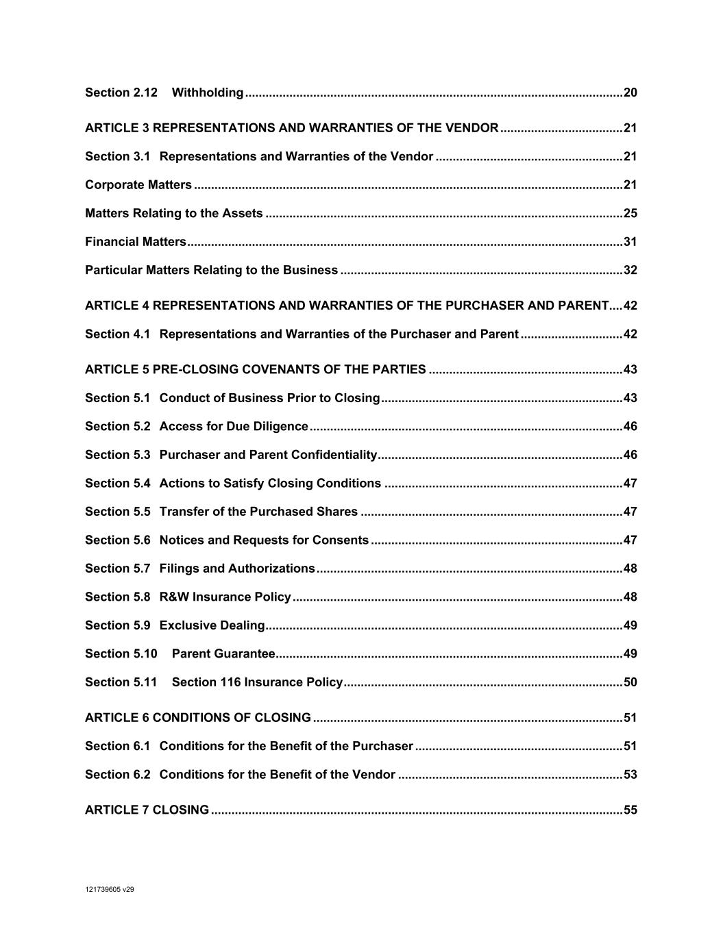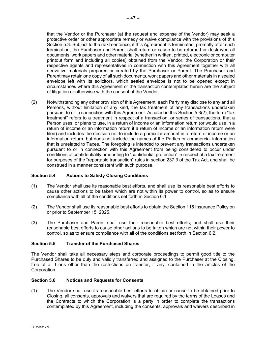 – 47 – 121739605 v29 that the Vendor or the Purchaser (at the request and expense of the Vendor) may seek a protective order or other appropriate remedy or waive compliance with the provisions of this Section 5.3. Subject to the next sentence, if this Agreement is terminated, promptly after such termination, the Purchaser and Parent shall return or cause to be returned or destroyed all documents, work papers and other material (whether in written, printed, electronic or computer printout form and including all copies) obtained from the Vendor, the Corporation or their respective agents and representatives in connection with this Agreement together with all derivative materials prepared or created by the Purchaser or Parent. The Purchaser and Parent may retain one copy of all such documents, work papers and other materials in a sealed envelope left with its solicitors, which sealed envelope is not to be opened except in circumstances where this Agreement or the transaction contemplated herein are the subject of litigation or otherwise with the consent of the Vendor. (2) Notwithstanding any other provision of this Agreement, each Party may disclose to any and all Persons, without limitation of any kind, the tax treatment of any transactions undertaken pursuant to or in connection with this Agreement. As used in this Section 5.3(2), the term “tax treatment” refers to a treatment in respect of a transaction, or series of transactions, that a Person uses, or plans to use, in a return of income or an information return (or would use in a return of income or an information return if a return of income or an information return were filed) and includes the decision not to include a particular amount in a return of income or an information return, but does not include the names of the Parties or commercial information that is unrelated to Taxes. The foregoing is intended to prevent any transactions undertaken pursuant to or in connection with this Agreement from being considered to occur under conditions of confidentiality amounting to “confidential protection” in respect of a tax treatment for purposes of the “reportable transaction” rules in section 237.3 of the Tax Act, and shall be construed in a manner consistent with such purpose. Section 5.4 Actions to Satisfy Closing Conditions (1) The Vendor shall use its reasonable best efforts, and shall use its reasonable best efforts to cause other actions to be taken which are not within its power to control, so as to ensure compliance with all of the conditions set forth in Section 6.1 (2) The Vendor shall use its reasonable best efforts to obtain the Section 116 Insurance Policy on or prior to September 15, 2025. (3) The Purchaser and Parent shall use their reasonable best efforts, and shall use their reasonable best efforts to cause other actions to be taken which are not within their power to control, so as to ensure compliance with all of the conditions set forth in Section 6.2. Section 5.5 Transfer of the Purchased Shares The Vendor shall take all necessary steps and corporate proceedings to permit good title to the Purchased Shares to be duly and validly transferred and assigned to the Purchaser at the Closing, free of all Liens other than the restrictions on transfer, if any, contained in the articles of the Corporation. Section 5.6 Notices and Requests for Consents (1) The Vendor shall use its reasonable best efforts to obtain or cause to be obtained prior to Closing, all consents, approvals and waivers that are required by the terms of the Leases and the Contracts to which the Corporation is a party in order to complete the transactions contemplated by this Agreement, including the consents, approvals and waivers described in