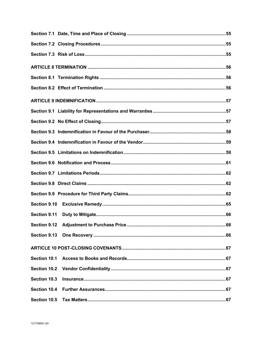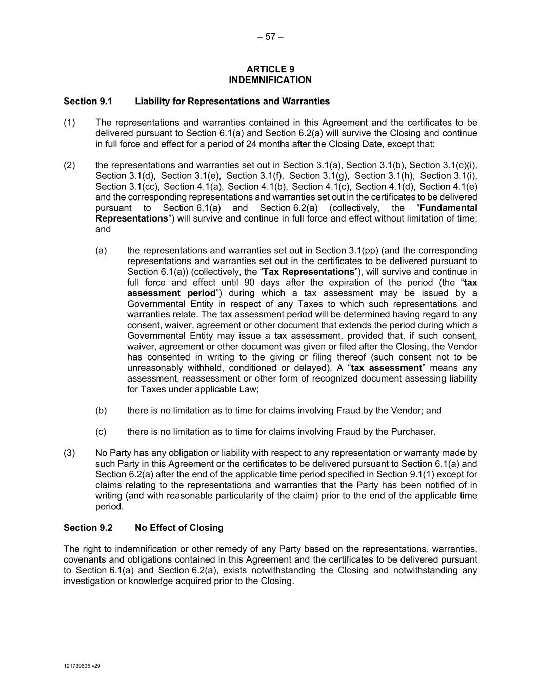 – 57 – 121739605 v29 ARTICLE 9 INDEMNIFICATION Section 9.1 Liability for Representations and Warranties (1) The representations and warranties contained in this Agreement and the certificates to be delivered pursuant to Section 6.1(a) and Section 6.2(a) will survive the Closing and continue in full force and effect for a period of 24 months after the Closing Date, except that: (2) the representations and warranties set out in Section 3.1(a), Section 3.1(b), Section 3.1(c)(i), Section 3.1(d), Section 3.1(e), Section 3.1(f), Section 3.1(g), Section 3.1(h), Section 3.1(i), Section 3.1(cc), Section 4.1(a), Section 4.1(b), Section 4.1(c), Section 4.1(d), Section 4.1(e) and the corresponding representations and warranties set out in the certificates to be delivered pursuant to Section 6.1(a) and Section 6.2(a) (collectively, the “Fundamental Representations”) will survive and continue in full force and effect without limitation of time; and (a) the representations and warranties set out in Section 3.1(pp) (and the corresponding representations and warranties set out in the certificates to be delivered pursuant to Section 6.1(a)) (collectively, the “Tax Representations”), will survive and continue in full force and effect until 90 days after the expiration of the period (the “tax assessment period”) during which a tax assessment may be issued by a Governmental Entity in respect of any Taxes to which such representations and warranties relate. The tax assessment period will be determined having regard to any consent, waiver, agreement or other document that extends the period during which a Governmental Entity may issue a tax assessment, provided that, if such consent, waiver, agreement or other document was given or filed after the Closing, the Vendor has consented in writing to the giving or filing thereof (such consent not to be unreasonably withheld, conditioned or delayed). A “tax assessment” means any assessment, reassessment or other form of recognized document assessing liability for Taxes under applicable Law; (b) there is no limitation as to time for claims involving Fraud by the Vendor; and (c) there is no limitation as to time for claims involving Fraud by the Purchaser. (3) No Party has any obligation or liability with respect to any representation or warranty made by such Party in this Agreement or the certificates to be delivered pursuant to Section 6.1(a) and Section 6.2(a) after the end of the applicable time period specified in Section 9.1(1) except for claims relating to the representations and warranties that the Party has been notified of in writing (and with reasonable particularity of the claim) prior to the end of the applicable time period. Section 9.2 No Effect of Closing The right to indemnification or other remedy of any Party based on the representations, warranties, covenants and obligations contained in this Agreement and the certificates to be delivered pursuant to Section 6.1(a) and Section 6.2(a), exists notwithstanding the Closing and notwithstanding any investigation or knowledge acquired prior to the Closing.