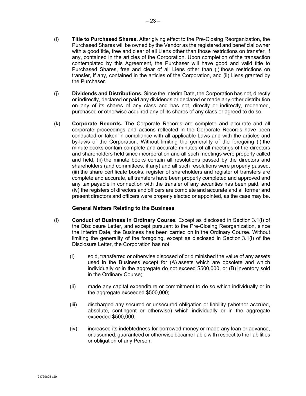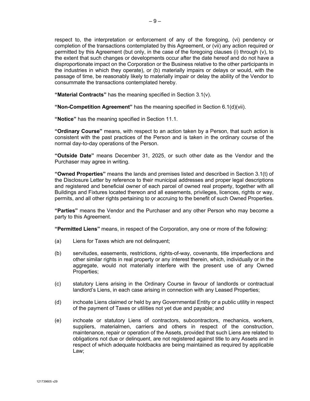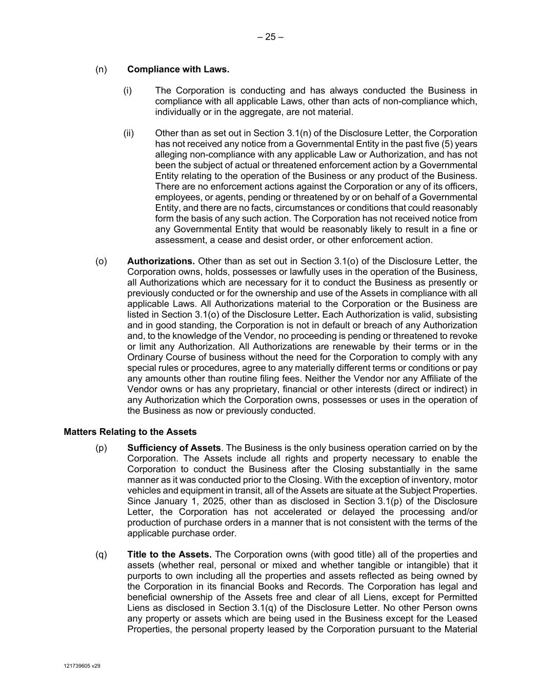 – 25 – 121739605 v29 (n) Compliance with Laws. (i) The Corporation is conducting and has always conducted the Business in compliance with all applicable Laws, other than acts of non-compliance which, individually or in the aggregate, are not material. (ii) Other than as set out in Section 3.1(n) of the Disclosure Letter, the Corporation has not received any notice from a Governmental Entity in the past five (5) years alleging non-compliance with any applicable Law or Authorization, and has not been the subject of actual or threatened enforcement action by a Governmental Entity relating to the operation of the Business or any product of the Business. There are no enforcement actions against the Corporation or any of its officers, employees, or agents, pending or threatened by or on behalf of a Governmental Entity, and there are no facts, circumstances or conditions that could reasonably form the basis of any such action. The Corporation has not received notice from any Governmental Entity that would be reasonably likely to result in a fine or assessment, a cease and desist order, or other enforcement action. (o) Authorizations. Other than as set out in Section 3.1(o) of the Disclosure Letter, the Corporation owns, holds, possesses or lawfully uses in the operation of the Business, all Authorizations which are necessary for it to conduct the Business as presently or previously conducted or for the ownership and use of the Assets in compliance with all applicable Laws. All Authorizations material to the Corporation or the Business are listed in Section 3.1(o) of the Disclosure Letter. Each Authorization is valid, subsisting and in good standing, the Corporation is not in default or breach of any Authorization and, to the knowledge of the Vendor, no proceeding is pending or threatened to revoke or limit any Authorization. All Authorizations are renewable by their terms or in the Ordinary Course of business without the need for the Corporation to comply with any special rules or procedures, agree to any materially different terms or conditions or pay any amounts other than routine filing fees. Neither the Vendor nor any Affiliate of the Vendor owns or has any proprietary, financial or other interests (direct or indirect) in any Authorization which the Corporation owns, possesses or uses in the operation of the Business as now or previously conducted. Matters Relating to the Assets (p) Sufficiency of Assets. The Business is the only business operation carried on by the Corporation. The Assets include all rights and property necessary to enable the Corporation to conduct the Business after the Closing substantially in the same manner as it was conducted prior to the Closing. With the exception of inventory, motor vehicles and equipment in transit, all of the Assets are situate at the Subject Properties. Since January 1, 2025, other than as disclosed in Section 3.1(p) of the Disclosure Letter, the Corporation has not accelerated or delayed the processing and/or production of purchase orders in a manner that is not consistent with the terms of the applicable purchase order. (q) Title to the Assets. The Corporation owns (with good title) all of the properties and assets (whether real, personal or mixed and whether tangible or intangible) that it purports to own including all the properties and assets reflected as being owned by the Corporation in its financial Books and Records. The Corporation has legal and beneficial ownership of the Assets free and clear of all Liens, except for Permitted Liens as disclosed in Section 3.1(q) of the Disclosure Letter. No other Person owns any property or assets which are being used in the Business except for the Leased Properties, the personal property leased by the Corporation pursuant to the Material