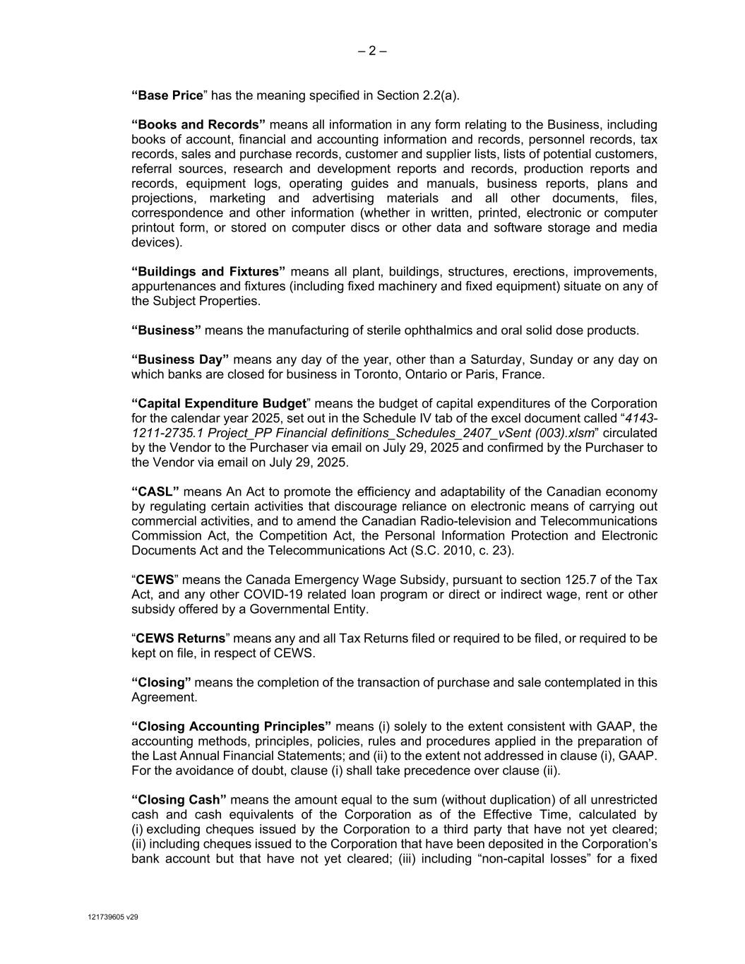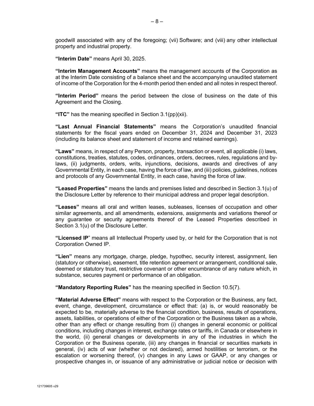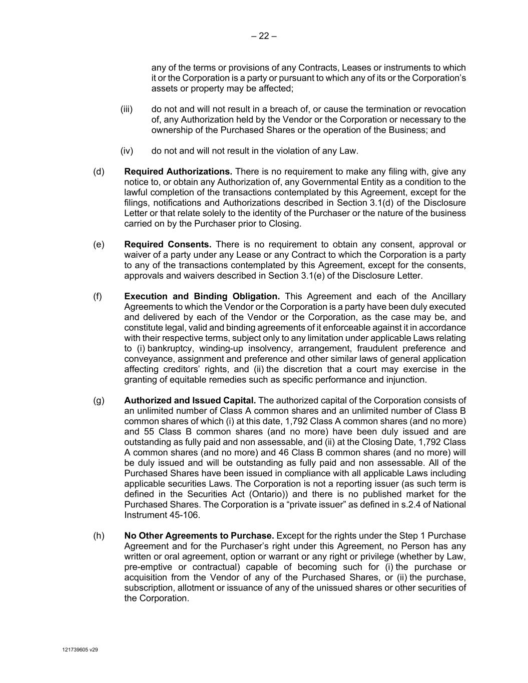 – 25 – 121739605 v29 (n) Compliance with Laws. (i) The Corporation is conducting and has always conducted the Business in compliance with all applicable Laws, other than acts of non-compliance which, individually or in the aggregate, are not material. (ii) Other than as set out in Section 3.1(n) of the Disclosure Letter, the Corporation has not received any notice from a Governmental Entity in the past five (5) years alleging non-compliance with any applicable Law or Authorization, and has not been the subject of actual or threatened enforcement action by a Governmental Entity relating to the operation of the Business or any product of the Business. There are no enforcement actions against the Corporation or any of its officers, employees, or agents, pending or threatened by or on behalf of a Governmental Entity, and there are no facts, circumstances or conditions that could reasonably form the basis of any such action. The Corporation has not received notice from any Governmental Entity that would be reasonably likely to result in a fine or assessment, a cease and desist order, or other enforcement action. (o) Authorizations. Other than as set out in Section 3.1(o) of the Disclosure Letter, the Corporation owns, holds, possesses or lawfully uses in the operation of the Business, all Authorizations which are necessary for it to conduct the Business as presently or previously conducted or for the ownership and use of the Assets in compliance with all applicable Laws. All Authorizations material to the Corporation or the Business are listed in Section 3.1(o) of the Disclosure Letter. Each Authorization is valid, subsisting and in good standing, the Corporation is not in default or breach of any Authorization and, to the knowledge of the Vendor, no proceeding is pending or threatened to revoke or limit any Authorization. All Authorizations are renewable by their terms or in the Ordinary Course of business without the need for the Corporation to comply with any special rules or procedures, agree to any materially different terms or conditions or pay any amounts other than routine filing fees. Neither the Vendor nor any Affiliate of the Vendor owns or has any proprietary, financial or other interests (direct or indirect) in any Authorization which the Corporation owns, possesses or uses in the operation of the Business as now or previously conducted. Matters Relating to the Assets (p) Sufficiency of Assets. The Business is the only business operation carried on by the Corporation. The Assets include all rights and property necessary to enable the Corporation to conduct the Business after the Closing substantially in the same manner as it was conducted prior to the Closing. With the exception of inventory, motor vehicles and equipment in transit, all of the Assets are situate at the Subject Properties. Since January 1, 2025, other than as disclosed in Section 3.1(p) of the Disclosure Letter, the Corporation has not accelerated or delayed the processing and/or production of purchase orders in a manner that is not consistent with the terms of the applicable purchase order. (q) Title to the Assets. The Corporation owns (with good title) all of the properties and assets (whether real, personal or mixed and whether tangible or intangible) that it purports to own including all the properties and assets reflected as being owned by the Corporation in its financial Books and Records. The Corporation has legal and beneficial ownership of the Assets free and clear of all Liens, except for Permitted Liens as disclosed in Section 3.1(q) of the Disclosure Letter. No other Person owns any property or assets which are being used in the Business except for the Leased Properties, the personal property leased by the Corporation pursuant to the Material