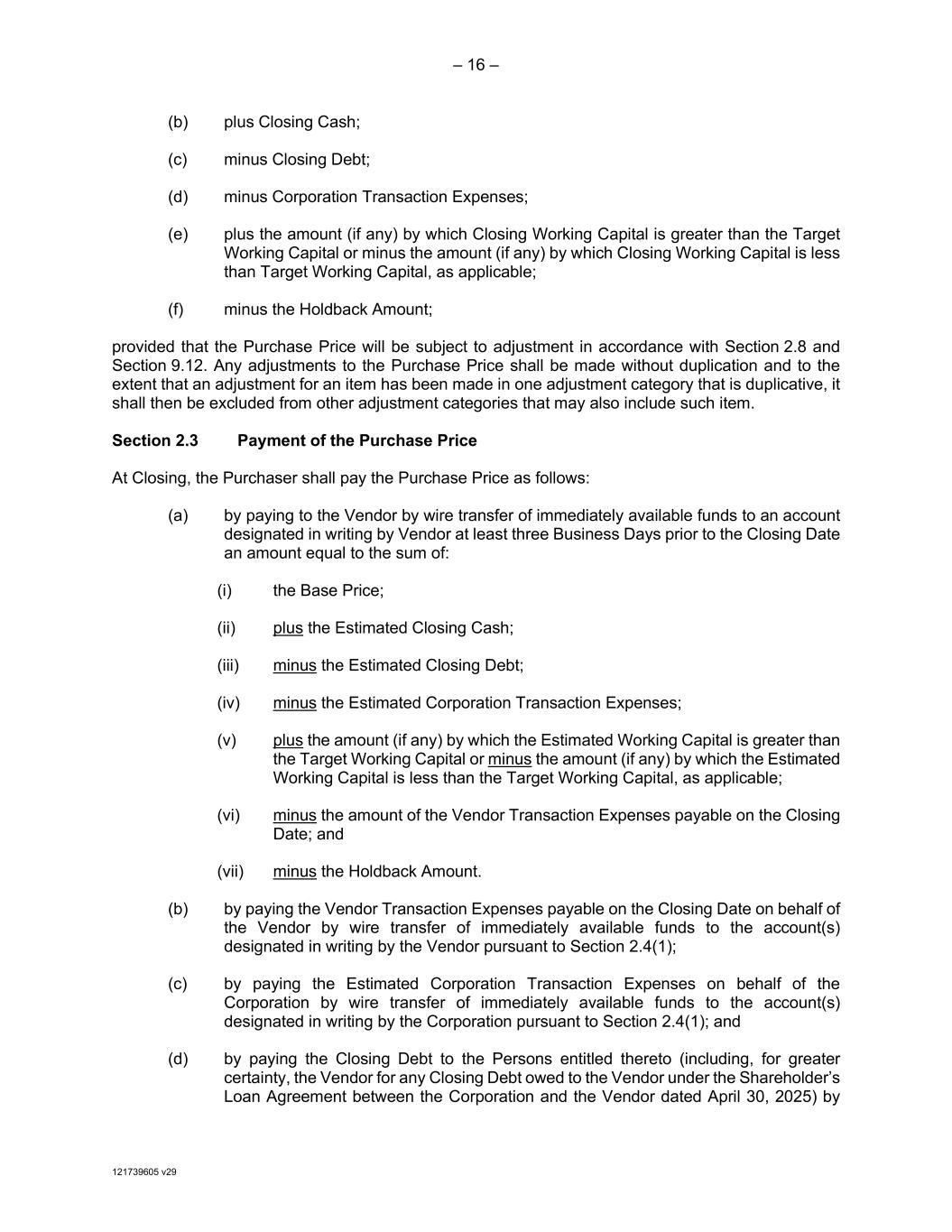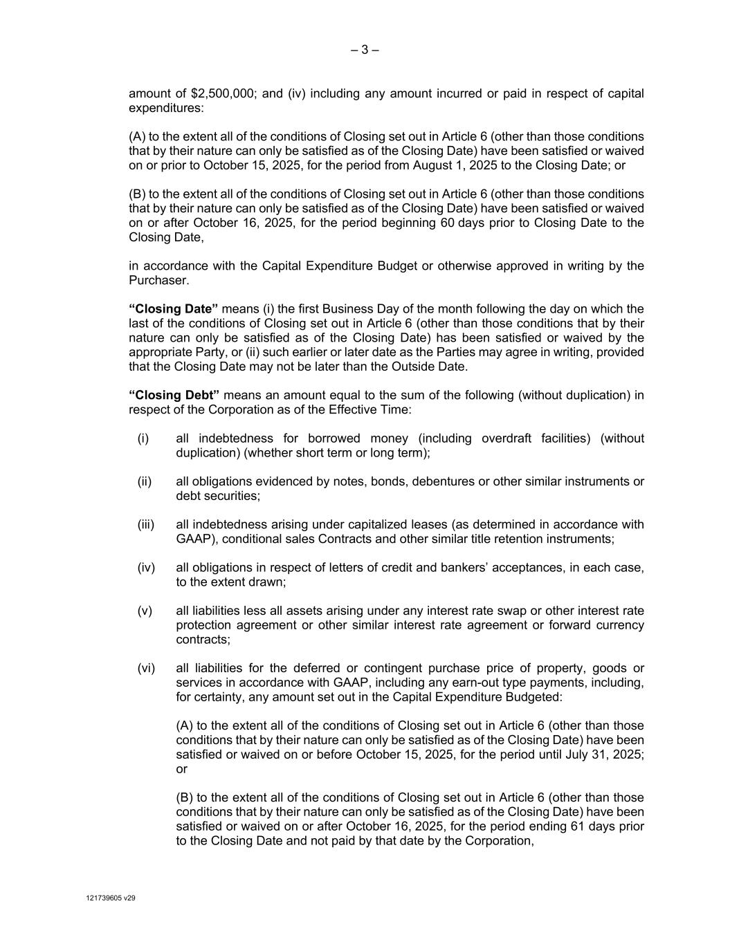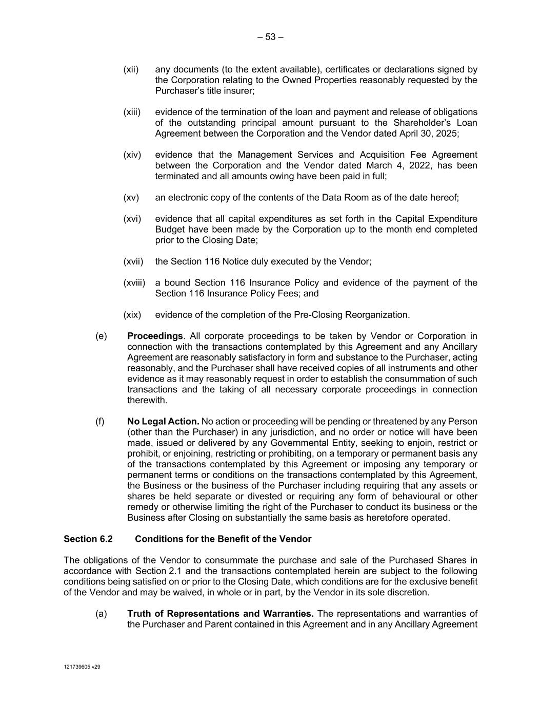 – 53 – 121739605 v29 (xii) any documents (to the extent available), certificates or declarations signed by the Corporation relating to the Owned Properties reasonably requested by the Purchaser’s title insurer; (xiii) evidence of the termination of the loan and payment and release of obligations of the outstanding principal amount pursuant to the Shareholder’s Loan Agreement between the Corporation and the Vendor dated April 30, 2025; (xiv) evidence that the Management Services and Acquisition Fee Agreement between the Corporation and the Vendor dated March 4, 2022, has been terminated and all amounts owing have been paid in full; (xv) an electronic copy of the contents of the Data Room as of the date hereof; (xvi) evidence that all capital expenditures as set forth in the Capital Expenditure Budget have been made by the Corporation up to the month end completed prior to the Closing Date; (xvii) the Section 116 Notice duly executed by the Vendor; (xviii) a bound Section 116 Insurance Policy and evidence of the payment of the Section 116 Insurance Policy Fees; and (xix) evidence of the completion of the Pre-Closing Reorganization. (e) Proceedings. All corporate proceedings to be taken by Vendor or Corporation in connection with the transactions contemplated by this Agreement and any Ancillary Agreement are reasonably satisfactory in form and substance to the Purchaser, acting reasonably, and the Purchaser shall have received copies of all instruments and other evidence as it may reasonably request in order to establish the consummation of such transactions and the taking of all necessary corporate proceedings in connection therewith. (f) No Legal Action. No action or proceeding will be pending or threatened by any Person (other than the Purchaser) in any jurisdiction, and no order or notice will have been made, issued or delivered by any Governmental Entity, seeking to enjoin, restrict or prohibit, or enjoining, restricting or prohibiting, on a temporary or permanent basis any of the transactions contemplated by this Agreement or imposing any temporary or permanent terms or conditions on the transactions contemplated by this Agreement, the Business or the business of the Purchaser including requiring that any assets or shares be held separate or divested or requiring any form of behavioural or other remedy or otherwise limiting the right of the Purchaser to conduct its business or the Business after Closing on substantially the same basis as heretofore operated. Section 6.2 Conditions for the Benefit of the Vendor The obligations of the Vendor to consummate the purchase and sale of the Purchased Shares in accordance with Section 2.1 and the transactions contemplated herein are subject to the following conditions being satisfied on or prior to the Closing Date, which conditions are for the exclusive benefit of the Vendor and may be waived, in whole or in part, by the Vendor in its sole discretion. (a) Truth of Representations and Warranties. The representations and warranties of the Purchaser and Parent contained in this Agreement and in any Ancillary Agreement