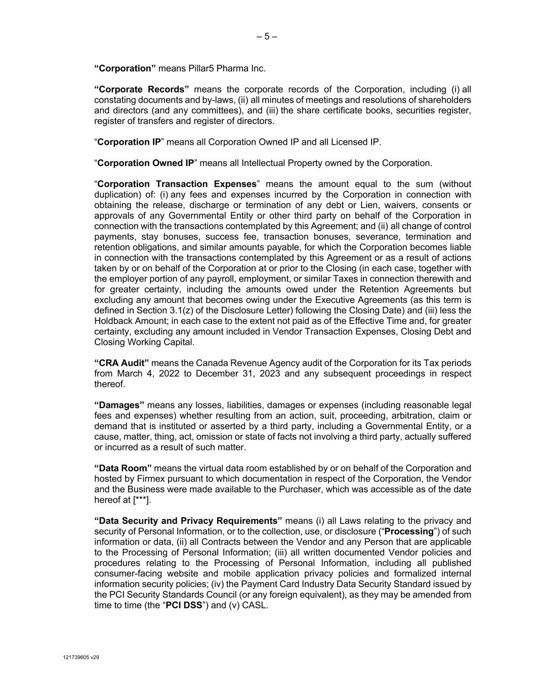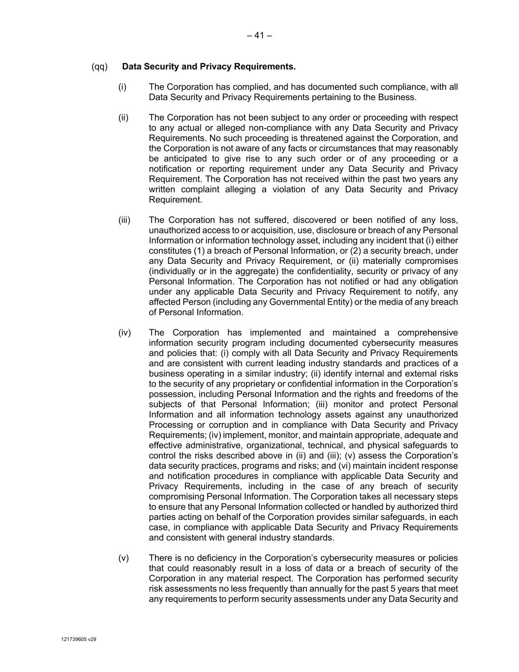 – 41 – 121739605 v29 (qq) Data Security and Privacy Requirements. (i) The Corporation has complied, and has documented such compliance, with all Data Security and Privacy Requirements pertaining to the Business. (ii) The Corporation has not been subject to any order or proceeding with respect to any actual or alleged non-compliance with any Data Security and Privacy Requirements. No such proceeding is threatened against the Corporation, and the Corporation is not aware of any facts or circumstances that may reasonably be anticipated to give rise to any such order or of any proceeding or a notification or reporting requirement under any Data Security and Privacy Requirement. The Corporation has not received within the past two years any written complaint alleging a violation of any Data Security and Privacy Requirement. (iii) The Corporation has not suffered, discovered or been notified of any loss, unauthorized access to or acquisition, use, disclosure or breach of any Personal Information or information technology asset, including any incident that (i) either constitutes (1) a breach of Personal Information, or (2) a security breach, under any Data Security and Privacy Requirement, or (ii) materially compromises (individually or in the aggregate) the confidentiality, security or privacy of any Personal Information. The Corporation has not notified or had any obligation under any applicable Data Security and Privacy Requirement to notify, any affected Person (including any Governmental Entity) or the media of any breach of Personal Information. (iv) The Corporation has implemented and maintained a comprehensive information security program including documented cybersecurity measures and policies that: (i) comply with all Data Security and Privacy Requirements and are consistent with current leading industry standards and practices of a business operating in a similar industry; (ii) identify internal and external risks to the security of any proprietary or confidential information in the Corporation’s possession, including Personal Information and the rights and freedoms of the subjects of that Personal Information; (iii) monitor and protect Personal Information and all information technology assets against any unauthorized Processing or corruption and in compliance with Data Security and Privacy Requirements; (iv) implement, monitor, and maintain appropriate, adequate and effective administrative, organizational, technical, and physical safeguards to control the risks described above in (ii) and (iii); (v) assess the Corporation’s data security practices, programs and risks; and (vi) maintain incident response and notification procedures in compliance with applicable Data Security and Privacy Requirements, including in the case of any breach of security compromising Personal Information. The Corporation takes all necessary steps to ensure that any Personal Information collected or handled by authorized third parties acting on behalf of the Corporation provides similar safeguards, in each case, in compliance with applicable Data Security and Privacy Requirements and consistent with general industry standards. (v) There is no deficiency in the Corporation’s cybersecurity measures or policies that could reasonably result in a loss of data or a breach of security of the Corporation in any material respect. The Corporation has performed security risk assessments no less frequently than annually for the past 5 years that meet any requirements to perform security assessments under any Data Security and