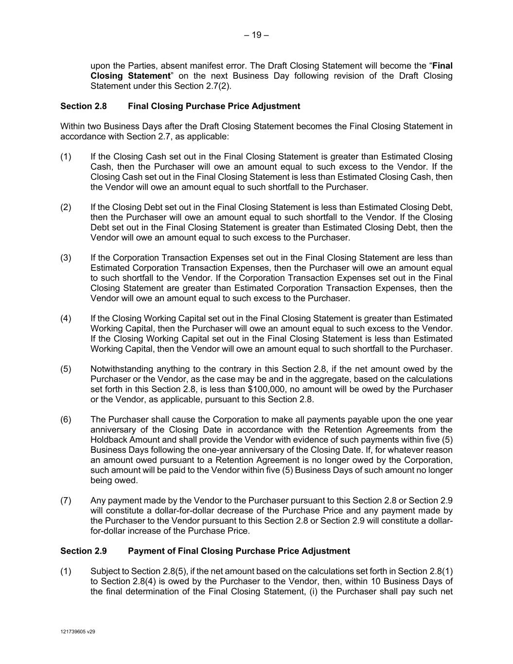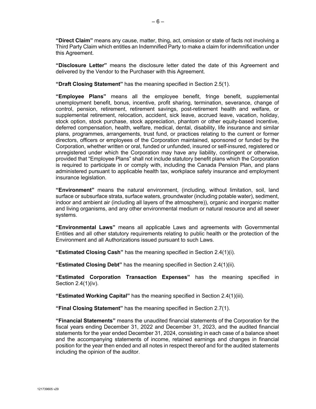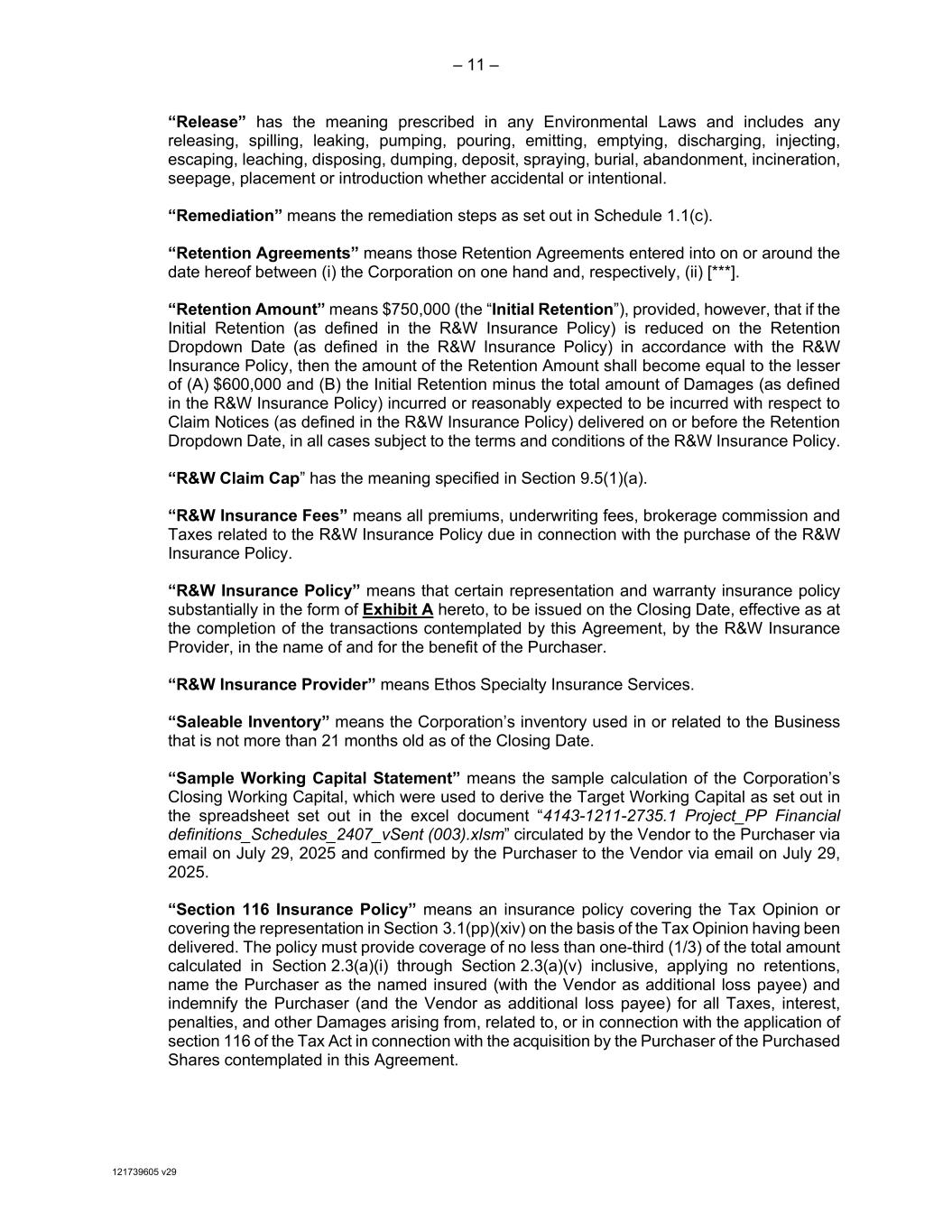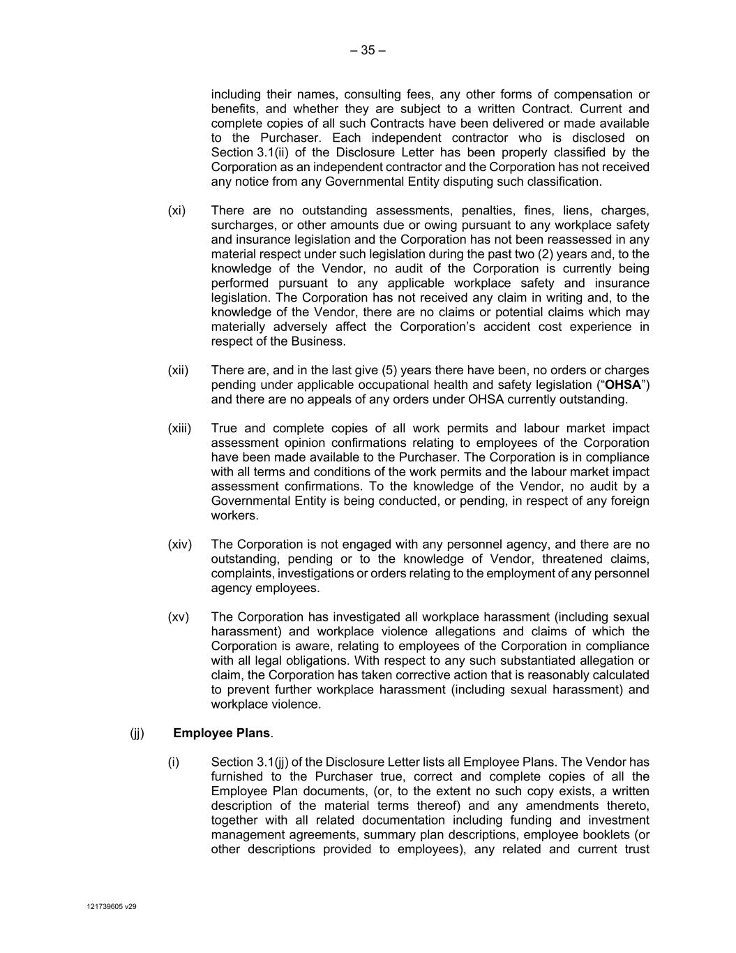 – 35 – 121739605 v29 including their names, consulting fees, any other forms of compensation or benefits, and whether they are subject to a written Contract. Current and complete copies of all such Contracts have been delivered or made available to the Purchaser. Each independent contractor who is disclosed on Section 3.1(ii) of the Disclosure Letter has been properly classified by the Corporation as an independent contractor and the Corporation has not received any notice from any Governmental Entity disputing such classification. (xi) There are no outstanding assessments, penalties, fines, liens, charges, surcharges, or other amounts due or owing pursuant to any workplace safety and insurance legislation and the Corporation has not been reassessed in any material respect under such legislation during the past two (2) years and, to the knowledge of the Vendor, no audit of the Corporation is currently being performed pursuant to any applicable workplace safety and insurance legislation. The Corporation has not received any claim in writing and, to the knowledge of the Vendor, there are no claims or potential claims which may materially adversely affect the Corporation’s accident cost experience in respect of the Business. (xii) There are, and in the last give (5) years there have been, no orders or charges pending under applicable occupational health and safety legislation (“OHSA”) and there are no appeals of any orders under OHSA currently outstanding. (xiii) True and complete copies of all work permits and labour market impact assessment opinion confirmations relating to employees of the Corporation have been made available to the Purchaser. The Corporation is in compliance with all terms and conditions of the work permits and the labour market impact assessment confirmations. To the knowledge of the Vendor, no audit by a Governmental Entity is being conducted, or pending, in respect of any foreign workers. (xiv) The Corporation is not engaged with any personnel agency, and there are no outstanding, pending or to the knowledge of Vendor, threatened claims, complaints, investigations or orders relating to the employment of any personnel agency employees. (xv) The Corporation has investigated all workplace harassment (including sexual harassment) and workplace violence allegations and claims of which the Corporation is aware, relating to employees of the Corporation in compliance with all legal obligations. With respect to any such substantiated allegation or claim, the Corporation has taken corrective action that is reasonably calculated to prevent further workplace harassment (including sexual harassment) and workplace violence. (jj) Employee Plans. (i) Section 3.1(jj) of the Disclosure Letter lists all Employee Plans. The Vendor has furnished to the Purchaser true, correct and complete copies of all the Employee Plan documents, (or, to the extent no such copy exists, a written description of the material terms thereof) and any amendments thereto, together with all related documentation including funding and investment management agreements, summary plan descriptions, employee booklets (or other descriptions provided to employees), any related and current trust