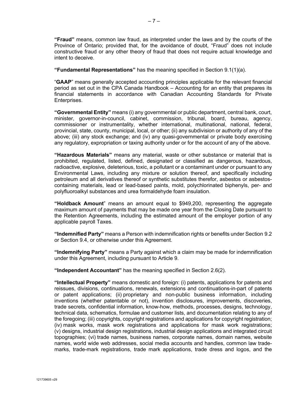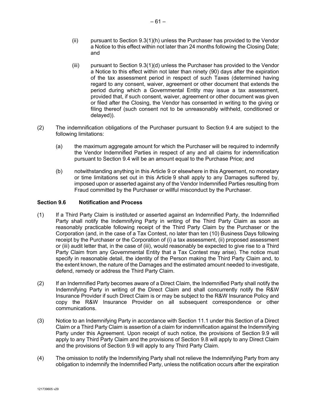 – 61 – 121739605 v29 (ii) pursuant to Section 9.3(1)(h) unless the Purchaser has provided to the Vendor a Notice to this effect within not later than 24 months following the Closing Date; and (iii) pursuant to Section 9.3(1)(d) unless the Purchaser has provided to the Vendor a Notice to this effect within not later than ninety (90) days after the expiration of the tax assessment period in respect of such Taxes (determined having regard to any consent, waiver, agreement or other document that extends the period during which a Governmental Entity may issue a tax assessment, provided that, if such consent, waiver, agreement or other document was given or filed after the Closing, the Vendor has consented in writing to the giving or filing thereof (such consent not to be unreasonably withheld, conditioned or delayed)). (2) The indemnification obligations of the Purchaser pursuant to Section 9.4 are subject to the following limitations: (a) the maximum aggregate amount for which the Purchaser will be required to indemnify the Vendor Indemnified Parties in respect of any and all claims for indemnification pursuant to Section 9.4 will be an amount equal to the Purchase Price; and (b) notwithstanding anything in this Article 9 or elsewhere in this Agreement, no monetary or time limitations set out in this Article 9 shall apply to any Damages suffered by, imposed upon or asserted against any of the Vendor Indemnified Parties resulting from Fraud committed by the Purchaser or willful misconduct by the Purchaser. Section 9.6 Notification and Process (1) If a Third Party Claim is instituted or asserted against an Indemnified Party, the Indemnified Party shall notify the Indemnifying Party in writing of the Third Party Claim as soon as reasonably practicable following receipt of the Third Party Claim by the Purchaser or the Corporation (and, in the case of a Tax Contest, no later than ten (10) Business Days following receipt by the Purchaser or the Corporation of (i) a tax assessment, (ii) proposed assessment or (iii) audit letter that, in the case of (iii), would reasonably be expected to give rise to a Third Party Claim from any Governmental Entity that a Tax Contest may arise). The notice must specify in reasonable detail, the identity of the Person making the Third Party Claim and, to the extent known, the nature of the Damages and the estimated amount needed to investigate, defend, remedy or address the Third Party Claim. (2) If an Indemnified Party becomes aware of a Direct Claim, the Indemnified Party shall notify the Indemnifying Party in writing of the Direct Claim and shall concurrently notify the R&W Insurance Provider if such Direct Claim is or may be subject to the R&W Insurance Policy and copy the R&W Insurance Provider on all subsequent correspondence or other communications. (3) Notice to an Indemnifying Party in accordance with Section 11.1 under this Section of a Direct Claim or a Third Party Claim is assertion of a claim for indemnification against the Indemnifying Party under this Agreement. Upon receipt of such notice, the provisions of Section 9.9 will apply to any Third Party Claim and the provisions of Section 9.8 will apply to any Direct Claim and the provisions of Section 9.9 will apply to any Third Party Claim. (4) The omission to notify the Indemnifying Party shall not relieve the Indemnifying Party from any obligation to indemnify the Indemnified Party, unless the notification occurs after the expiration