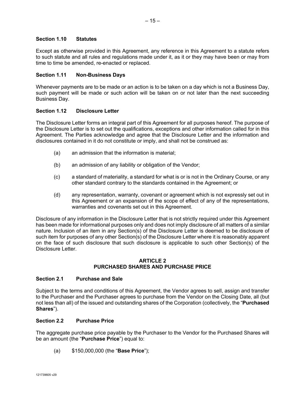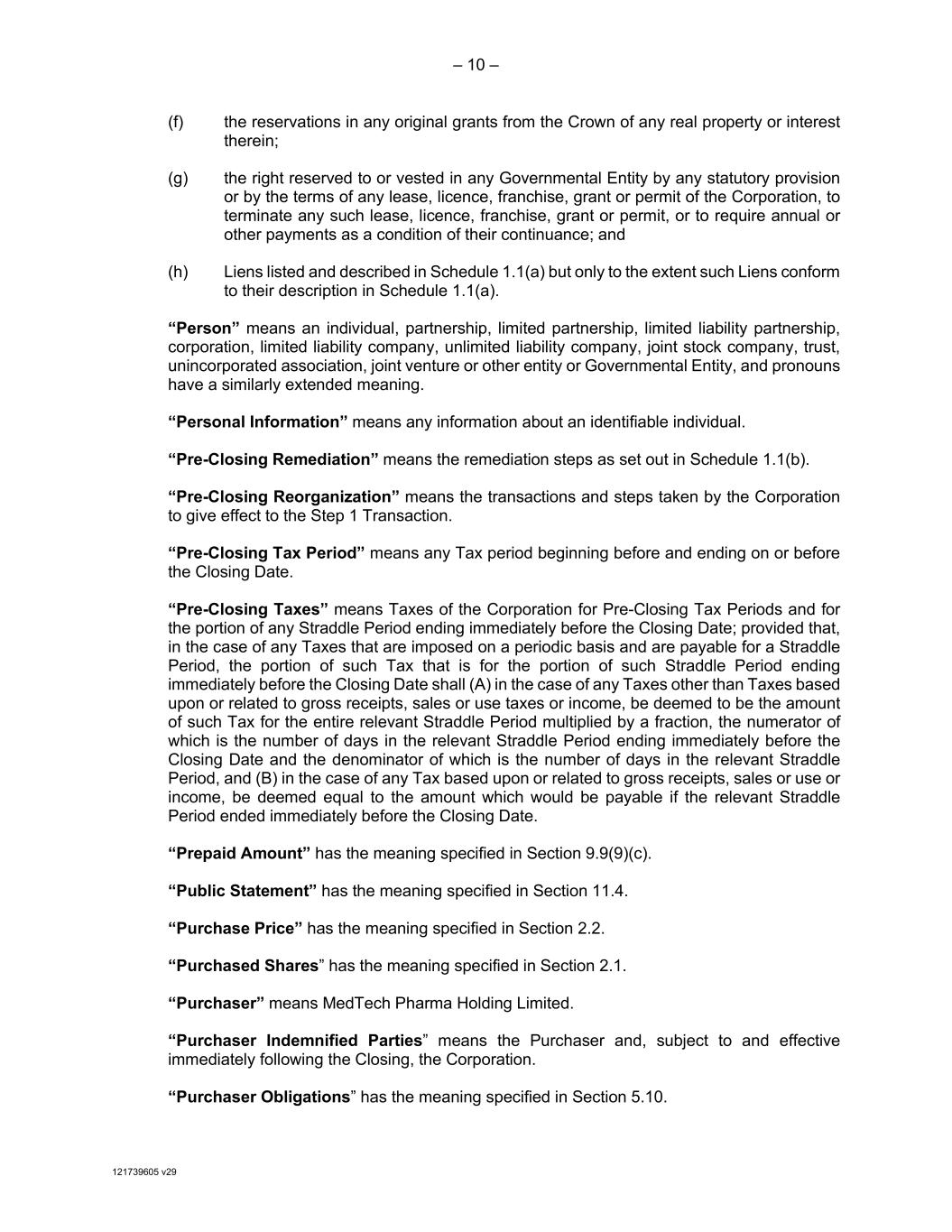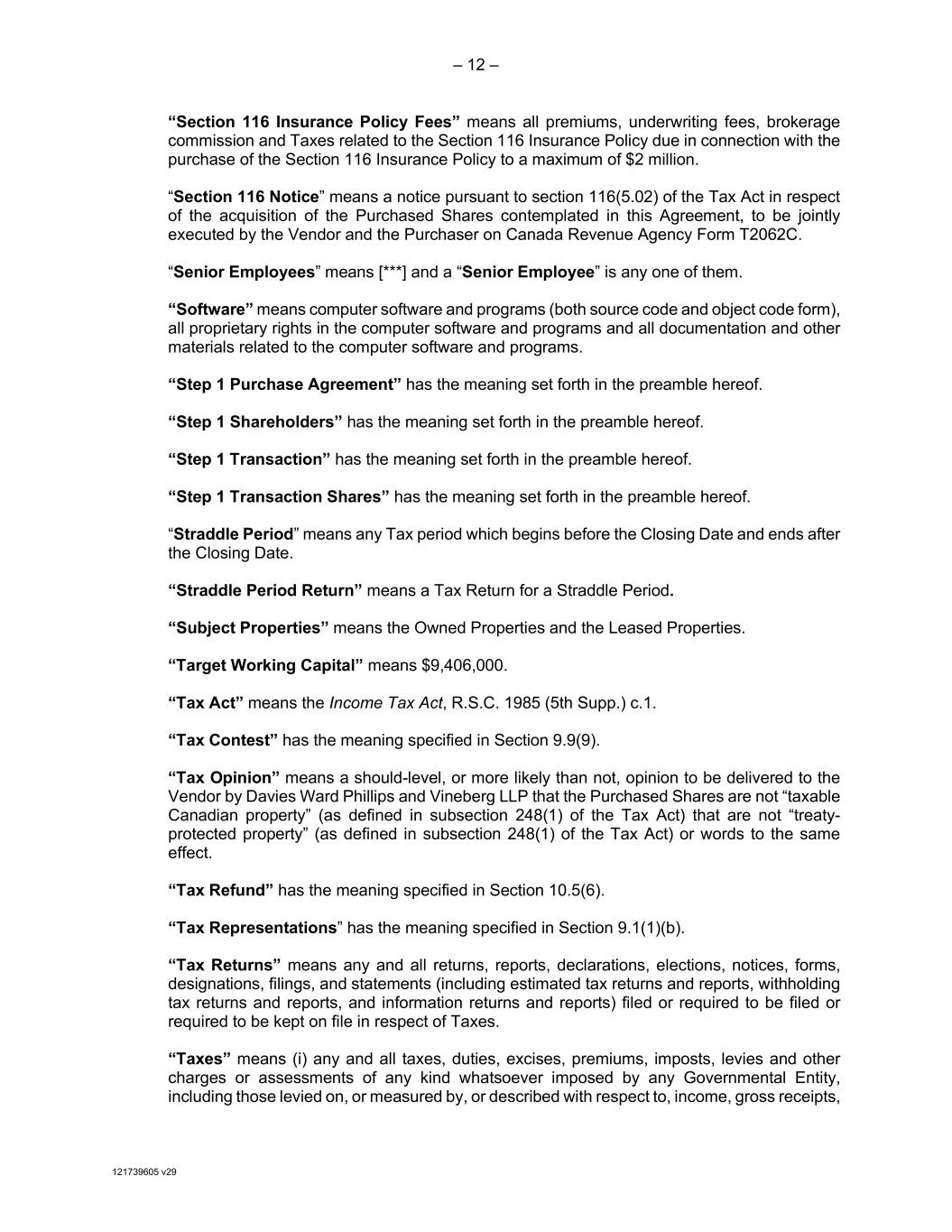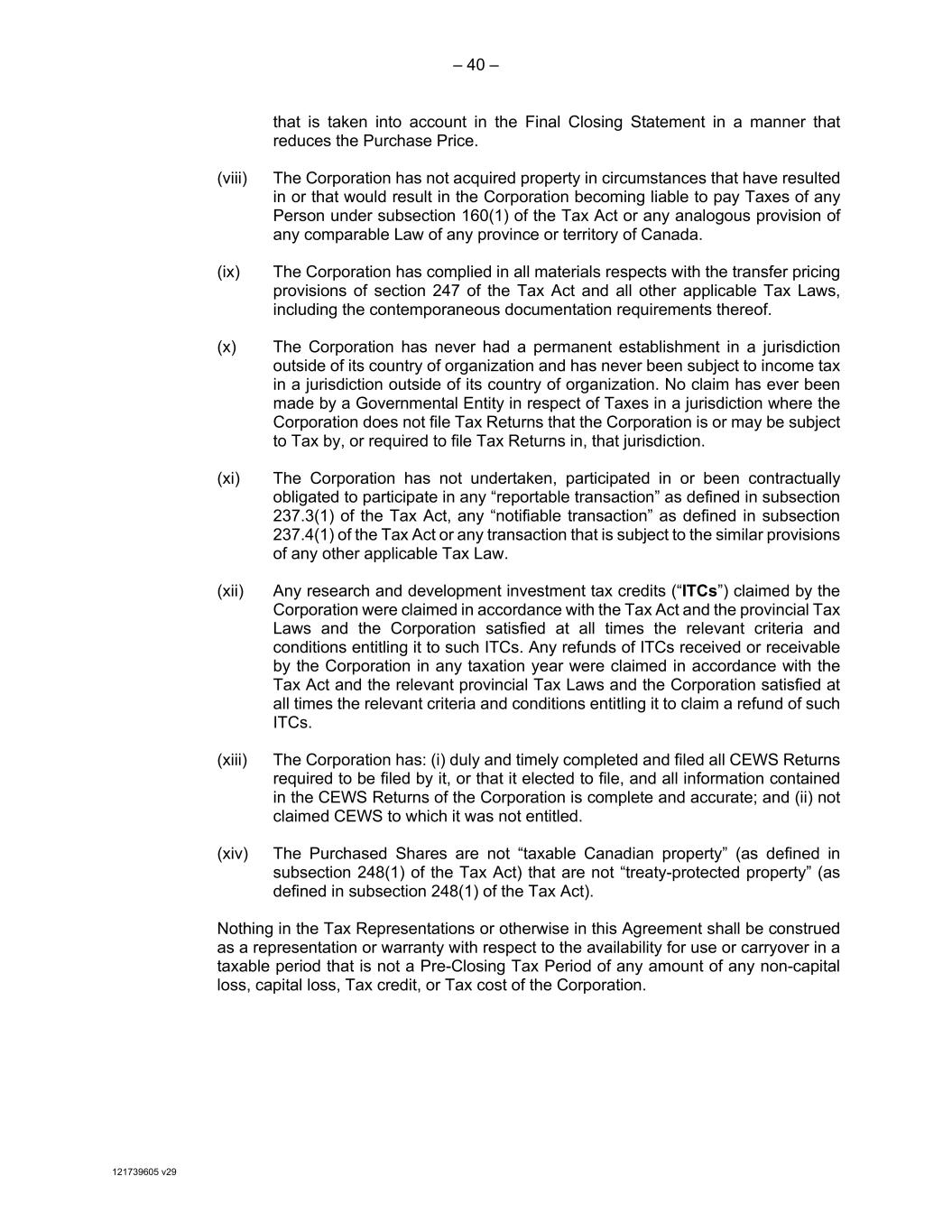 – 40 – 121739605 v29 that is taken into account in the Final Closing Statement in a manner that reduces the Purchase Price. (viii) The Corporation has not acquired property in circumstances that have resulted in or that would result in the Corporation becoming liable to pay Taxes of any Person under subsection 160(1) of the Tax Act or any analogous provision of any comparable Law of any province or territory of Canada. (ix) The Corporation has complied in all materials respects with the transfer pricing provisions of section 247 of the Tax Act and all other applicable Tax Laws, including the contemporaneous documentation requirements thereof. (x) The Corporation has never had a permanent establishment in a jurisdiction outside of its country of organization and has never been subject to income tax in a jurisdiction outside of its country of organization. No claim has ever been made by a Governmental Entity in respect of Taxes in a jurisdiction where the Corporation does not file Tax Returns that the Corporation is or may be subject to Tax by, or required to file Tax Returns in, that jurisdiction. (xi) The Corporation has not undertaken, participated in or been contractually obligated to participate in any “reportable transaction” as defined in subsection 237.3(1) of the Tax Act, any “notifiable transaction” as defined in subsection 237.4(1) of the Tax Act or any transaction that is subject to the similar provisions of any other applicable Tax Law. (xii) Any research and development investment tax credits (“ITCs”) claimed by the Corporation were claimed in accordance with the Tax Act and the provincial Tax Laws and the Corporation satisfied at all times the relevant criteria and conditions entitling it to such ITCs. Any refunds of ITCs received or receivable by the Corporation in any taxation year were claimed in accordance with the Tax Act and the relevant provincial Tax Laws and the Corporation satisfied at all times the relevant criteria and conditions entitling it to claim a refund of such ITCs. (xiii) The Corporation has: (i) duly and timely completed and filed all CEWS Returns required to be filed by it, or that it elected to file, and all information contained in the CEWS Returns of the Corporation is complete and accurate; and (ii) not claimed CEWS to which it was not entitled. (xiv) The Purchased Shares are not “taxable Canadian property” (as defined in subsection 248(1) of the Tax Act) that are not “treaty-protected property” (as defined in subsection 248(1) of the Tax Act). Nothing in the Tax Representations or otherwise in this Agreement shall be construed as a representation or warranty with respect to the availability for use or carryover in a taxable period that is not a Pre-Closing Tax Period of any amount of any non-capital loss, capital loss, Tax credit, or Tax cost of the Corporation.