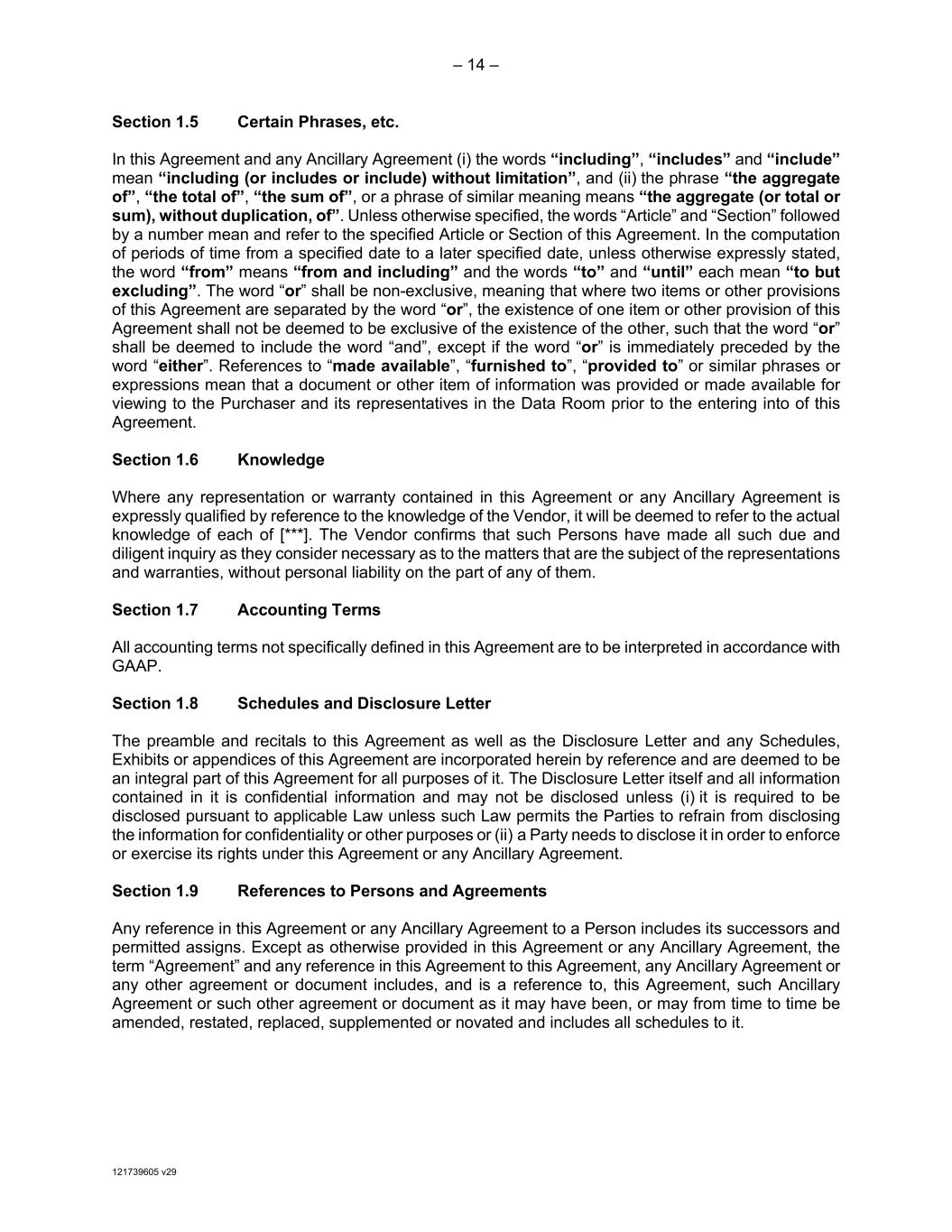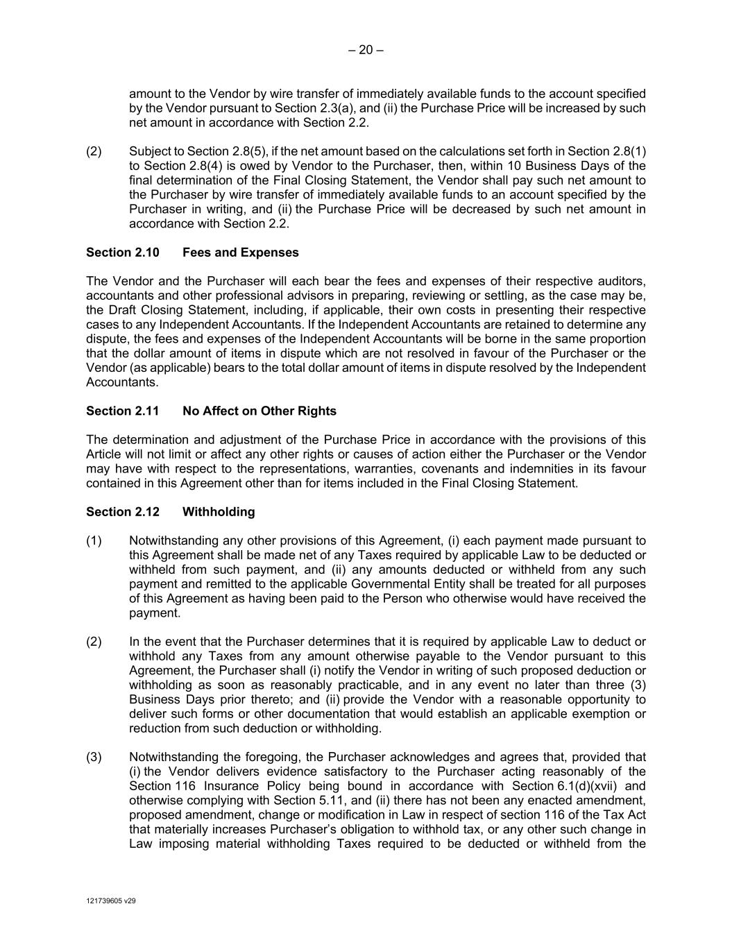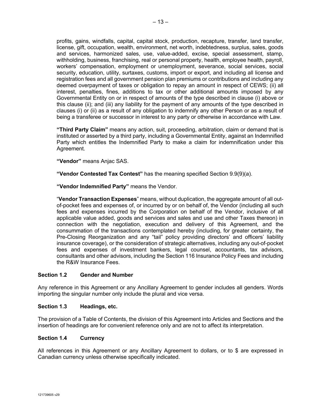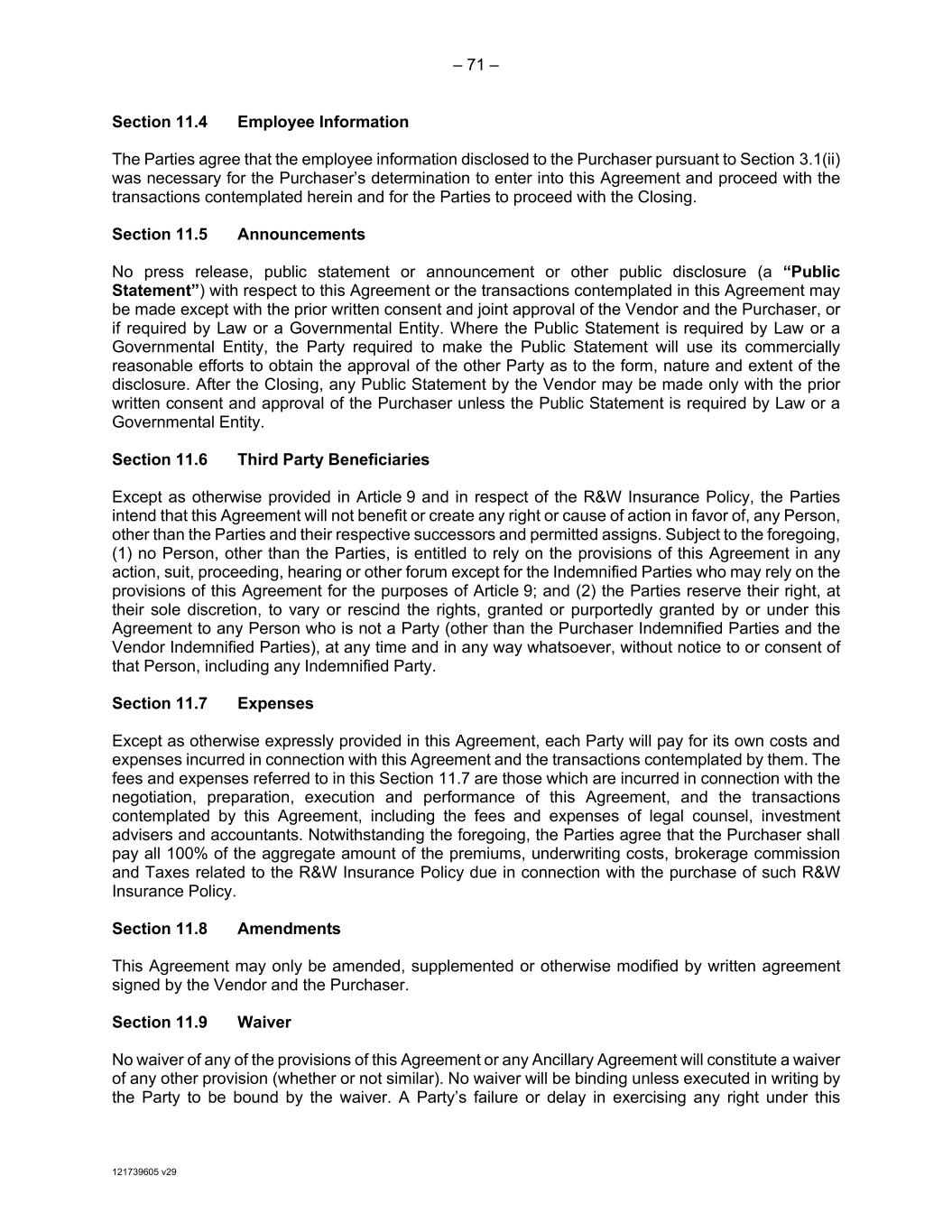 – 71 – 121739605 v29 Section 11.4 Employee Information The Parties agree that the employee information disclosed to the Purchaser pursuant to Section 3.1(ii) was necessary for the Purchaser’s determination to enter into this Agreement and proceed with the transactions contemplated herein and for the Parties to proceed with the Closing. Section 11.5 Announcements No press release, public statement or announcement or other public disclosure (a “Public Statement”) with respect to this Agreement or the transactions contemplated in this Agreement may be made except with the prior written consent and joint approval of the Vendor and the Purchaser, or if required by Law or a Governmental Entity. Where the Public Statement is required by Law or a Governmental Entity, the Party required to make the Public Statement will use its commercially reasonable efforts to obtain the approval of the other Party as to the form, nature and extent of the disclosure. After the Closing, any Public Statement by the Vendor may be made only with the prior written consent and approval of the Purchaser unless the Public Statement is required by Law or a Governmental Entity. Section 11.6 Third Party Beneficiaries Except as otherwise provided in Article 9 and in respect of the R&W Insurance Policy, the Parties intend that this Agreement will not benefit or create any right or cause of action in favor of, any Person, other than the Parties and their respective successors and permitted assigns. Subject to the foregoing, (1) no Person, other than the Parties, is entitled to rely on the provisions of this Agreement in any action, suit, proceeding, hearing or other forum except for the Indemnified Parties who may rely on the provisions of this Agreement for the purposes of Article 9; and (2) the Parties reserve their right, at their sole discretion, to vary or rescind the rights, granted or purportedly granted by or under this Agreement to any Person who is not a Party (other than the Purchaser Indemnified Parties and the Vendor Indemnified Parties), at any time and in any way whatsoever, without notice to or consent of that Person, including any Indemnified Party. Section 11.7 Expenses Except as otherwise expressly provided in this Agreement, each Party will pay for its own costs and expenses incurred in connection with this Agreement and the transactions contemplated by them. The fees and expenses referred to in this Section 11.7 are those which are incurred in connection with the negotiation, preparation, execution and performance of this Agreement, and the transactions contemplated by this Agreement, including the fees and expenses of legal counsel, investment advisers and accountants. Notwithstanding the foregoing, the Parties agree that the Purchaser shall pay all 100% of the aggregate amount of the premiums, underwriting costs, brokerage commission and Taxes related to the R&W Insurance Policy due in connection with the purchase of such R&W Insurance Policy. Section 11.8 Amendments This Agreement may only be amended, supplemented or otherwise modified by written agreement signed by the Vendor and the Purchaser. Section 11.9 Waiver No waiver of any of the provisions of this Agreement or any Ancillary Agreement will constitute a waiver of any other provision (whether or not similar). No waiver will be binding unless executed in writing by the Party to be bound by the waiver. A Party’s failure or delay in exercising any right under this