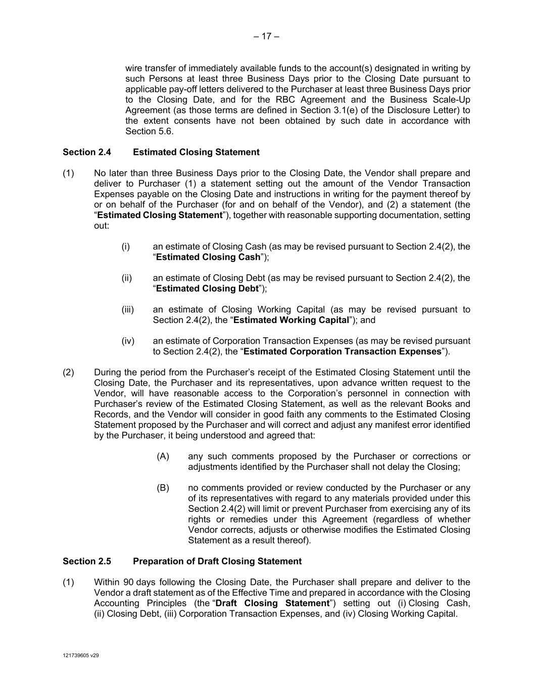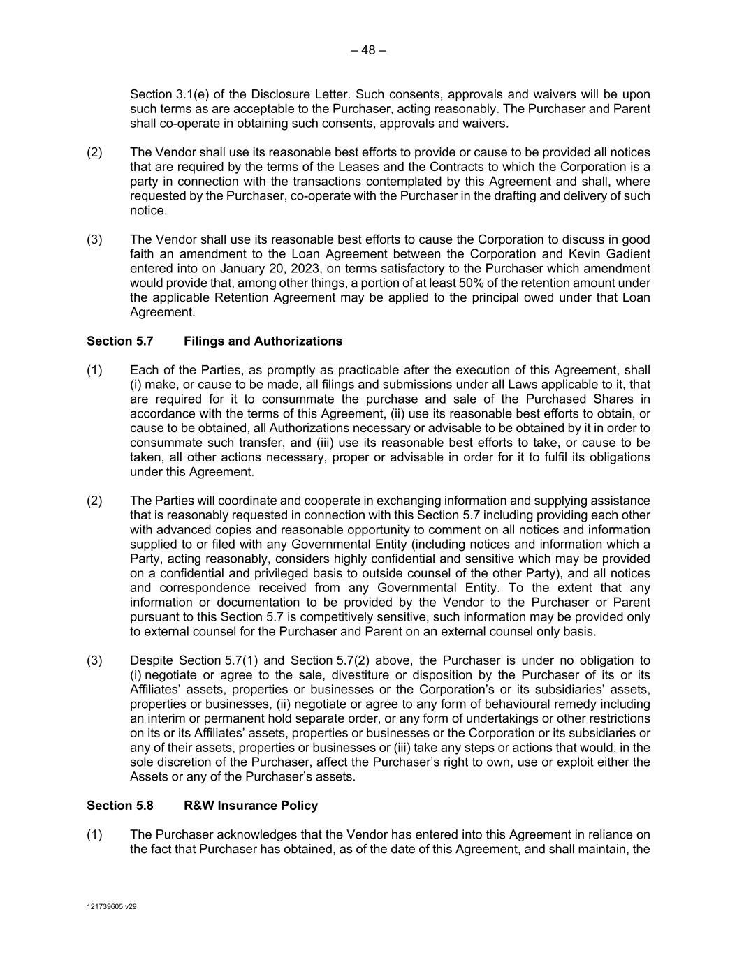 – 48 – 121739605 v29 Section 3.1(e) of the Disclosure Letter. Such consents, approvals and waivers will be upon such terms as are acceptable to the Purchaser, acting reasonably. The Purchaser and Parent shall co-operate in obtaining such consents, approvals and waivers. (2) The Vendor shall use its reasonable best efforts to provide or cause to be provided all notices that are required by the terms of the Leases and the Contracts to which the Corporation is a party in connection with the transactions contemplated by this Agreement and shall, where requested by the Purchaser, co-operate with the Purchaser in the drafting and delivery of such notice. (3) The Vendor shall use its reasonable best efforts to cause the Corporation to discuss in good faith an amendment to the Loan Agreement between the Corporation and Kevin Gadient entered into on January 20, 2023, on terms satisfactory to the Purchaser which amendment would provide that, among other things, a portion of at least 50% of the retention amount under the applicable Retention Agreement may be applied to the principal owed under that Loan Agreement. Section 5.7 Filings and Authorizations (1) Each of the Parties, as promptly as practicable after the execution of this Agreement, shall (i) make, or cause to be made, all filings and submissions under all Laws applicable to it, that are required for it to consummate the purchase and sale of the Purchased Shares in accordance with the terms of this Agreement, (ii) use its reasonable best efforts to obtain, or cause to be obtained, all Authorizations necessary or advisable to be obtained by it in order to consummate such transfer, and (iii) use its reasonable best efforts to take, or cause to be taken, all other actions necessary, proper or advisable in order for it to fulfil its obligations under this Agreement. (2) The Parties will coordinate and cooperate in exchanging information and supplying assistance that is reasonably requested in connection with this Section 5.7 including providing each other with advanced copies and reasonable opportunity to comment on all notices and information supplied to or filed with any Governmental Entity (including notices and information which a Party, acting reasonably, considers highly confidential and sensitive which may be provided on a confidential and privileged basis to outside counsel of the other Party), and all notices and correspondence received from any Governmental Entity. To the extent that any information or documentation to be provided by the Vendor to the Purchaser or Parent pursuant to this Section 5.7 is competitively sensitive, such information may be provided only to external counsel for the Purchaser and Parent on an external counsel only basis. (3) Despite Section 5.7(1) and Section 5.7(2) above, the Purchaser is under no obligation to (i) negotiate or agree to the sale, divestiture or disposition by the Purchaser of its or its Affiliates’ assets, properties or businesses or the Corporation’s or its subsidiaries’ assets, properties or businesses, (ii) negotiate or agree to any form of behavioural remedy including an interim or permanent hold separate order, or any form of undertakings or other restrictions on its or its Affiliates’ assets, properties or businesses or the Corporation or its subsidiaries or any of their assets, properties or businesses or (iii) take any steps or actions that would, in the sole discretion of the Purchaser, affect the Purchaser’s right to own, use or exploit either the Assets or any of the Purchaser’s assets. Section 5.8 R&W Insurance Policy (1) The Purchaser acknowledges that the Vendor has entered into this Agreement in reliance on the fact that Purchaser has obtained, as of the date of this Agreement, and shall maintain, the