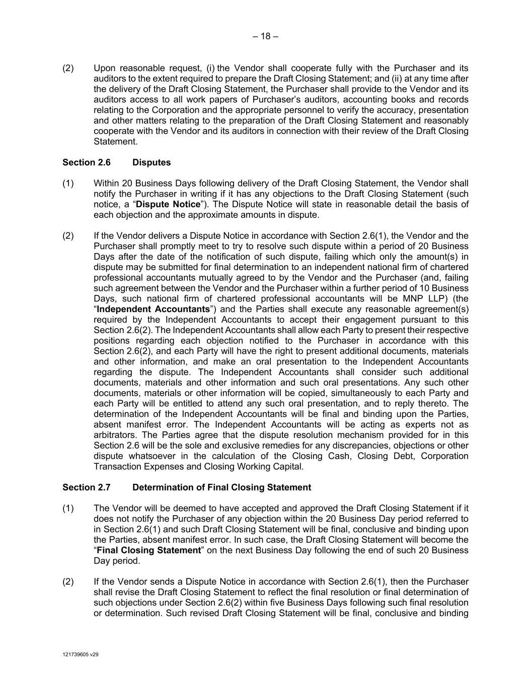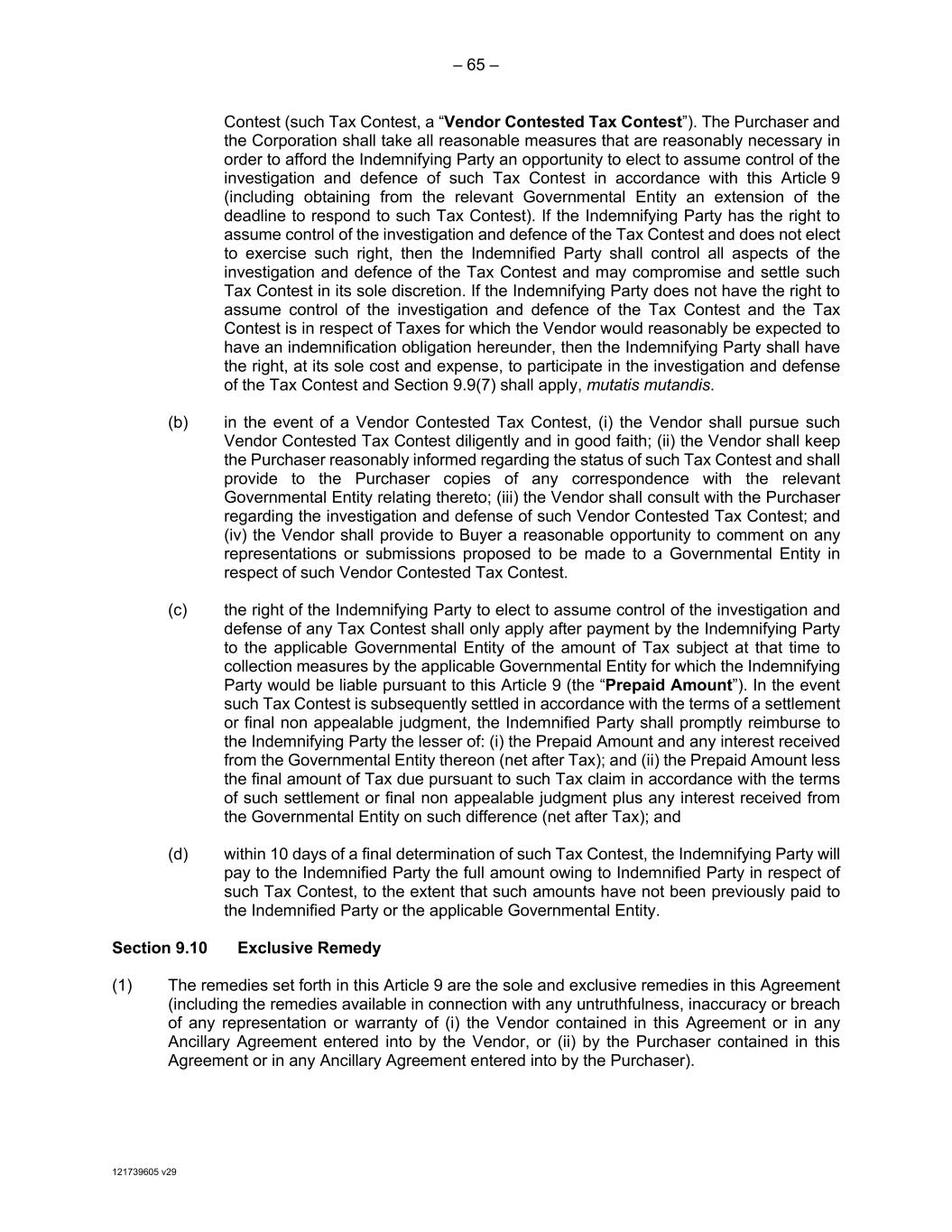 – 65 – 121739605 v29 Contest (such Tax Contest, a “Vendor Contested Tax Contest”). The Purchaser and the Corporation shall take all reasonable measures that are reasonably necessary in order to afford the Indemnifying Party an opportunity to elect to assume control of the investigation and defence of such Tax Contest in accordance with this Article 9 (including obtaining from the relevant Governmental Entity an extension of the deadline to respond to such Tax Contest). If the Indemnifying Party has the right to assume control of the investigation and defence of the Tax Contest and does not elect to exercise such right, then the Indemnified Party shall control all aspects of the investigation and defence of the Tax Contest and may compromise and settle such Tax Contest in its sole discretion. If the Indemnifying Party does not have the right to assume control of the investigation and defence of the Tax Contest and the Tax Contest is in respect of Taxes for which the Vendor would reasonably be expected to have an indemnification obligation hereunder, then the Indemnifying Party shall have the right, at its sole cost and expense, to participate in the investigation and defense of the Tax Contest and Section 9.9(7) shall apply, mutatis mutandis. (b) in the event of a Vendor Contested Tax Contest, (i) the Vendor shall pursue such Vendor Contested Tax Contest diligently and in good faith; (ii) the Vendor shall keep the Purchaser reasonably informed regarding the status of such Tax Contest and shall provide to the Purchaser copies of any correspondence with the relevant Governmental Entity relating thereto; (iii) the Vendor shall consult with the Purchaser regarding the investigation and defense of such Vendor Contested Tax Contest; and (iv) the Vendor shall provide to Buyer a reasonable opportunity to comment on any representations or submissions proposed to be made to a Governmental Entity in respect of such Vendor Contested Tax Contest. (c) the right of the Indemnifying Party to elect to assume control of the investigation and defense of any Tax Contest shall only apply after payment by the Indemnifying Party to the applicable Governmental Entity of the amount of Tax subject at that time to collection measures by the applicable Governmental Entity for which the Indemnifying Party would be liable pursuant to this Article 9 (the “Prepaid Amount”). In the event such Tax Contest is subsequently settled in accordance with the terms of a settlement or final non appealable judgment, the Indemnified Party shall promptly reimburse to the Indemnifying Party the lesser of: (i) the Prepaid Amount and any interest received from the Governmental Entity thereon (net after Tax); and (ii) the Prepaid Amount less the final amount of Tax due pursuant to such Tax claim in accordance with the terms of such settlement or final non appealable judgment plus any interest received from the Governmental Entity on such difference (net after Tax); and (d) within 10 days of a final determination of such Tax Contest, the Indemnifying Party will pay to the Indemnified Party the full amount owing to Indemnified Party in respect of such Tax Contest, to the extent that such amounts have not been previously paid to the Indemnified Party or the applicable Governmental Entity. Section 9.10 Exclusive Remedy (1) The remedies set forth in this Article 9 are the sole and exclusive remedies in this Agreement (including the remedies available in connection with any untruthfulness, inaccuracy or breach of any representation or warranty of (i) the Vendor contained in this Agreement or in any Ancillary Agreement entered into by the Vendor, or (ii) by the Purchaser contained in this Agreement or in any Ancillary Agreement entered into by the Purchaser).