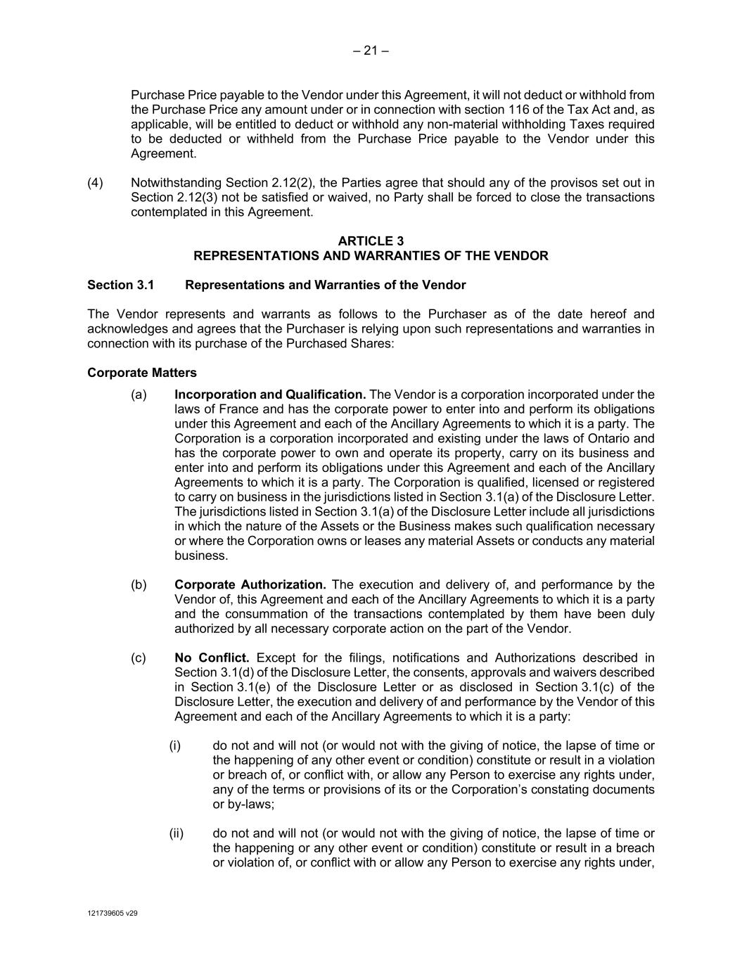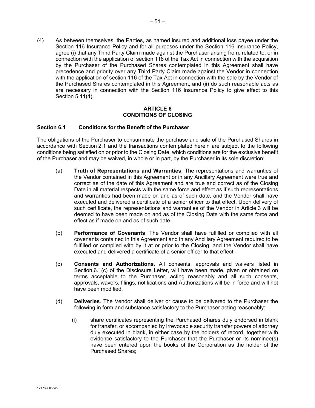 – 51 – 121739605 v29 (4) As between themselves, the Parties, as named insured and additional loss payee under the Section 116 Insurance Policy and for all purposes under the Section 116 Insurance Policy, agree (i) that any Third Party Claim made against the Purchaser arising from, related to, or in connection with the application of section 116 of the Tax Act in connection with the acquisition by the Purchaser of the Purchased Shares contemplated in this Agreement shall have precedence and priority over any Third Party Claim made against the Vendor in connection with the application of section 116 of the Tax Act in connection with the sale by the Vendor of the Purchased Shares contemplated in this Agreement, and (ii) do such reasonable acts as are necessary in connection with the Section 116 Insurance Policy to give effect to this Section 5.11(4). ARTICLE 6 CONDITIONS OF CLOSING Section 6.1 Conditions for the Benefit of the Purchaser The obligations of the Purchaser to consummate the purchase and sale of the Purchased Shares in accordance with Section 2.1 and the transactions contemplated herein are subject to the following conditions being satisfied on or prior to the Closing Date, which conditions are for the exclusive benefit of the Purchaser and may be waived, in whole or in part, by the Purchaser in its sole discretion: (a) Truth of Representations and Warranties. The representations and warranties of the Vendor contained in this Agreement or in any Ancillary Agreement were true and correct as of the date of this Agreement and are true and correct as of the Closing Date in all material respects with the same force and effect as if such representations and warranties had been made on and as of such date, and the Vendor shall have executed and delivered a certificate of a senior officer to that effect. Upon delivery of such certificate, the representations and warranties of the Vendor in Article 3 will be deemed to have been made on and as of the Closing Date with the same force and effect as if made on and as of such date. (b) Performance of Covenants. The Vendor shall have fulfilled or complied with all covenants contained in this Agreement and in any Ancillary Agreement required to be fulfilled or complied with by it at or prior to the Closing, and the Vendor shall have executed and delivered a certificate of a senior officer to that effect. (c) Consents and Authorizations. All consents, approvals and waivers listed in Section 6.1(c) of the Disclosure Letter, will have been made, given or obtained on terms acceptable to the Purchaser, acting reasonably and all such consents, approvals, wavers, filings, notifications and Authorizations will be in force and will not have been modified. (d) Deliveries. The Vendor shall deliver or cause to be delivered to the Purchaser the following in form and substance satisfactory to the Purchaser acting reasonably: (i) share certificates representing the Purchased Shares duly endorsed in blank for transfer, or accompanied by irrevocable security transfer powers of attorney duly executed in blank, in either case by the holders of record, together with evidence satisfactory to the Purchaser that the Purchaser or its nominee(s) have been entered upon the books of the Corporation as the holder of the Purchased Shares;