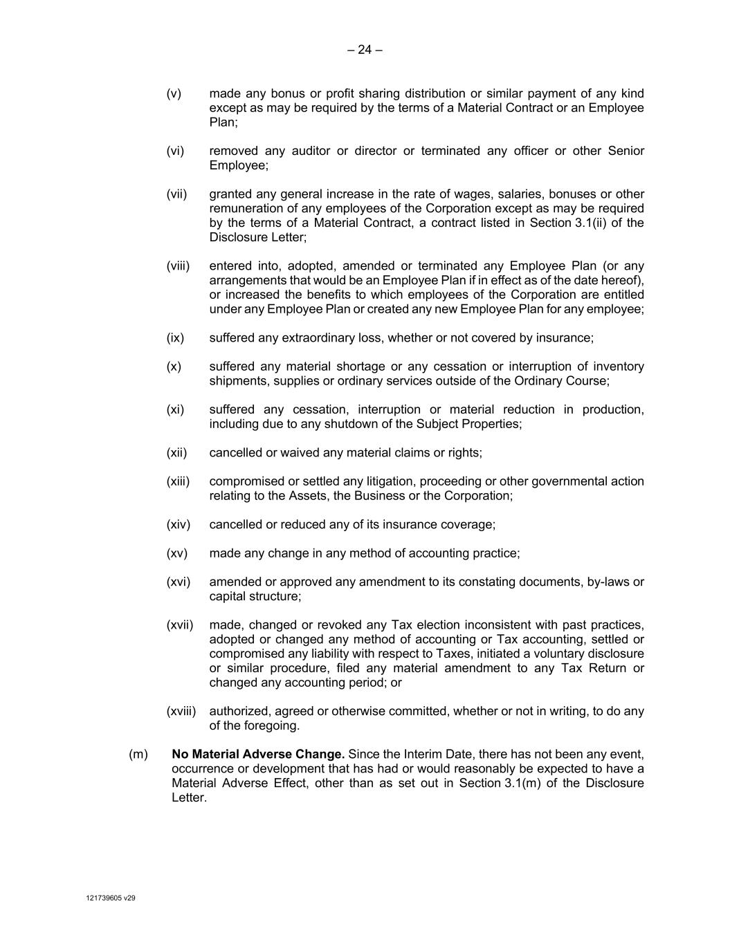 – 24 – 121739605 v29 (v) made any bonus or profit sharing distribution or similar payment of any kind except as may be required by the terms of a Material Contract or an Employee Plan; (vi) removed any auditor or director or terminated any officer or other Senior Employee; (vii) granted any general increase in the rate of wages, salaries, bonuses or other remuneration of any employees of the Corporation except as may be required by the terms of a Material Contract, a contract listed in Section 3.1(ii) of the Disclosure Letter; (viii) entered into, adopted, amended or terminated any Employee Plan (or any arrangements that would be an Employee Plan if in effect as of the date hereof), or increased the benefits to which employees of the Corporation are entitled under any Employee Plan or created any new Employee Plan for any employee; (ix) suffered any extraordinary loss, whether or not covered by insurance; (x) suffered any material shortage or any cessation or interruption of inventory shipments, supplies or ordinary services outside of the Ordinary Course; (xi) suffered any cessation, interruption or material reduction in production, including due to any shutdown of the Subject Properties; (xii) cancelled or waived any material claims or rights; (xiii) compromised or settled any litigation, proceeding or other governmental action relating to the Assets, the Business or the Corporation; (xiv) cancelled or reduced any of its insurance coverage; (xv) made any change in any method of accounting practice; (xvi) amended or approved any amendment to its constating documents, by-laws or capital structure; (xvii) made, changed or revoked any Tax election inconsistent with past practices, adopted or changed any method of accounting or Tax accounting, settled or compromised any liability with respect to Taxes, initiated a voluntary disclosure or similar procedure, filed any material amendment to any Tax Return or changed any accounting period; or (xviii) authorized, agreed or otherwise committed, whether or not in writing, to do any of the foregoing. (m) No Material Adverse Change. Since the Interim Date, there has not been any event, occurrence or development that has had or would reasonably be expected to have a Material Adverse Effect, other than as set out in Section 3.1(m) of the Disclosure Letter.