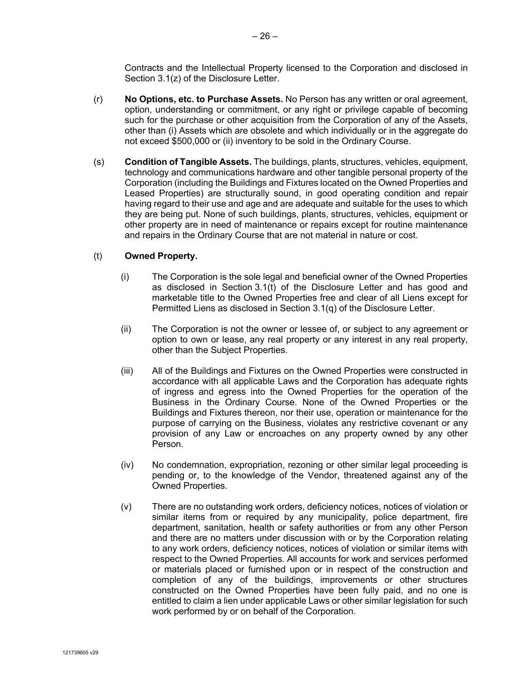 – 26 – 121739605 v29 Contracts and the Intellectual Property licensed to the Corporation and disclosed in Section 3.1(z) of the Disclosure Letter. (r) No Options, etc. to Purchase Assets. No Person has any written or oral agreement, option, understanding or commitment, or any right or privilege capable of becoming such for the purchase or other acquisition from the Corporation of any of the Assets, other than (i) Assets which are obsolete and which individually or in the aggregate do not exceed $500,000 or (ii) inventory to be sold in the Ordinary Course. (s) Condition of Tangible Assets. The buildings, plants, structures, vehicles, equipment, technology and communications hardware and other tangible personal property of the Corporation (including the Buildings and Fixtures located on the Owned Properties and Leased Properties) are structurally sound, in good operating condition and repair having regard to their use and age and are adequate and suitable for the uses to which they are being put. None of such buildings, plants, structures, vehicles, equipment or other property are in need of maintenance or repairs except for routine maintenance and repairs in the Ordinary Course that are not material in nature or cost. (t) Owned Property. (i) The Corporation is the sole legal and beneficial owner of the Owned Properties as disclosed in Section 3.1(t) of the Disclosure Letter and has good and marketable title to the Owned Properties free and clear of all Liens except for Permitted Liens as disclosed in Section 3.1(q) of the Disclosure Letter. (ii) The Corporation is not the owner or lessee of, or subject to any agreement or option to own or lease, any real property or any interest in any real property, other than the Subject Properties. (iii) All of the Buildings and Fixtures on the Owned Properties were constructed in accordance with all applicable Laws and the Corporation has adequate rights of ingress and egress into the Owned Properties for the operation of the Business in the Ordinary Course. None of the Owned Properties or the Buildings and Fixtures thereon, nor their use, operation or maintenance for the purpose of carrying on the Business, violates any restrictive covenant or any provision of any Law or encroaches on any property owned by any other Person. (iv) No condemnation, expropriation, rezoning or other similar legal proceeding is pending or, to the knowledge of the Vendor, threatened against any of the Owned Properties. (v) There are no outstanding work orders, deficiency notices, notices of violation or similar items from or required by any municipality, police department, fire department, sanitation, health or safety authorities or from any other Person and there are no matters under discussion with or by the Corporation relating to any work orders, deficiency notices, notices of violation or similar items with respect to the Owned Properties. All accounts for work and services performed or materials placed or furnished upon or in respect of the construction and completion of any of the buildings, improvements or other structures constructed on the Owned Properties have been fully paid, and no one is entitled to claim a lien under applicable Laws or other similar legislation for such work performed by or on behalf of the Corporation.