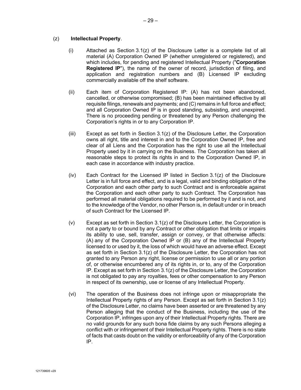 – 29 – 121739605 v29 (z) Intellectual Property. (i) Attached as Section 3.1(z) of the Disclosure Letter is a complete list of all material (A) Corporation Owned IP (whether unregistered or registered), and which includes, for pending and registered Intellectual Property ("Corporation Registered IP"), the name of the owner of record, jurisdiction of filing, and application and registration numbers and (B) Licensed IP excluding commercially available off the shelf software. (ii) Each item of Corporation Registered IP: (A) has not been abandoned, cancelled, or otherwise compromised; (B) has been maintained effective by all requisite filings, renewals and payments; and (C) remains in full force and effect; and all Corporation Owned IP is in good standing, subsisting, and unexpired. There is no proceeding pending or threatened by any Person challenging the Corporation’s rights in or to any Corporation IP. (iii) Except as set forth in Section 3.1(z) of the Disclosure Letter, the Corporation owns all right, title and interest in and to the Corporation Owned IP, free and clear of all Liens and the Corporation has the right to use all the Intellectual Property used by it in carrying on the Business. The Corporation has taken all reasonable steps to protect its rights in and to the Corporation Owned IP, in each case in accordance with industry practice. (iv) Each Contract for the Licensed IP listed in Section 3.1(z) of the Disclosure Letter is in full force and effect, and is a legal, valid and binding obligation of the Corporation and each other party to such Contract and is enforceable against the Corporation and each other party to such Contract. The Corporation has performed all material obligations required to be performed by it and is not, and to the knowledge of the Vendor, no other Person is, in default under or in breach of such Contract for the Licensed IP. (v) Except as set forth in Section 3.1(z) of the Disclosure Letter, the Corporation is not a party to or bound by any Contract or other obligation that limits or impairs its ability to use, sell, transfer, assign or convey, or that otherwise affects: (A) any of the Corporation Owned IP or (B) any of the Intellectual Property licensed to or used by it, the loss of which would have an adverse effect. Except as set forth in Section 3.1(z) of the Disclosure Letter, the Corporation has not granted to any Person any right, license or permission to use all or any portion of, or otherwise encumbered any of its rights in, or to, any of the Corporation IP. Except as set forth in Section 3.1(z) of the Disclosure Letter, the Corporation is not obligated to pay any royalties, fees or other compensation to any Person in respect of its ownership, use or license of any Intellectual Property. (vi) The operation of the Business does not infringe upon or misappropriate the Intellectual Property rights of any Person. Except as set forth in Section 3.1(z) of the Disclosure Letter, no claims have been asserted or are threatened by any Person alleging that the conduct of the Business, including the use of the Corporation IP, infringes upon any of their Intellectual Property rights. There are no valid grounds for any such bona fide claims by any such Persons alleging a conflict with or infringement of their Intellectual Property rights. There is no state of facts that casts doubt on the validity or enforceability of any of the Corporation IP.