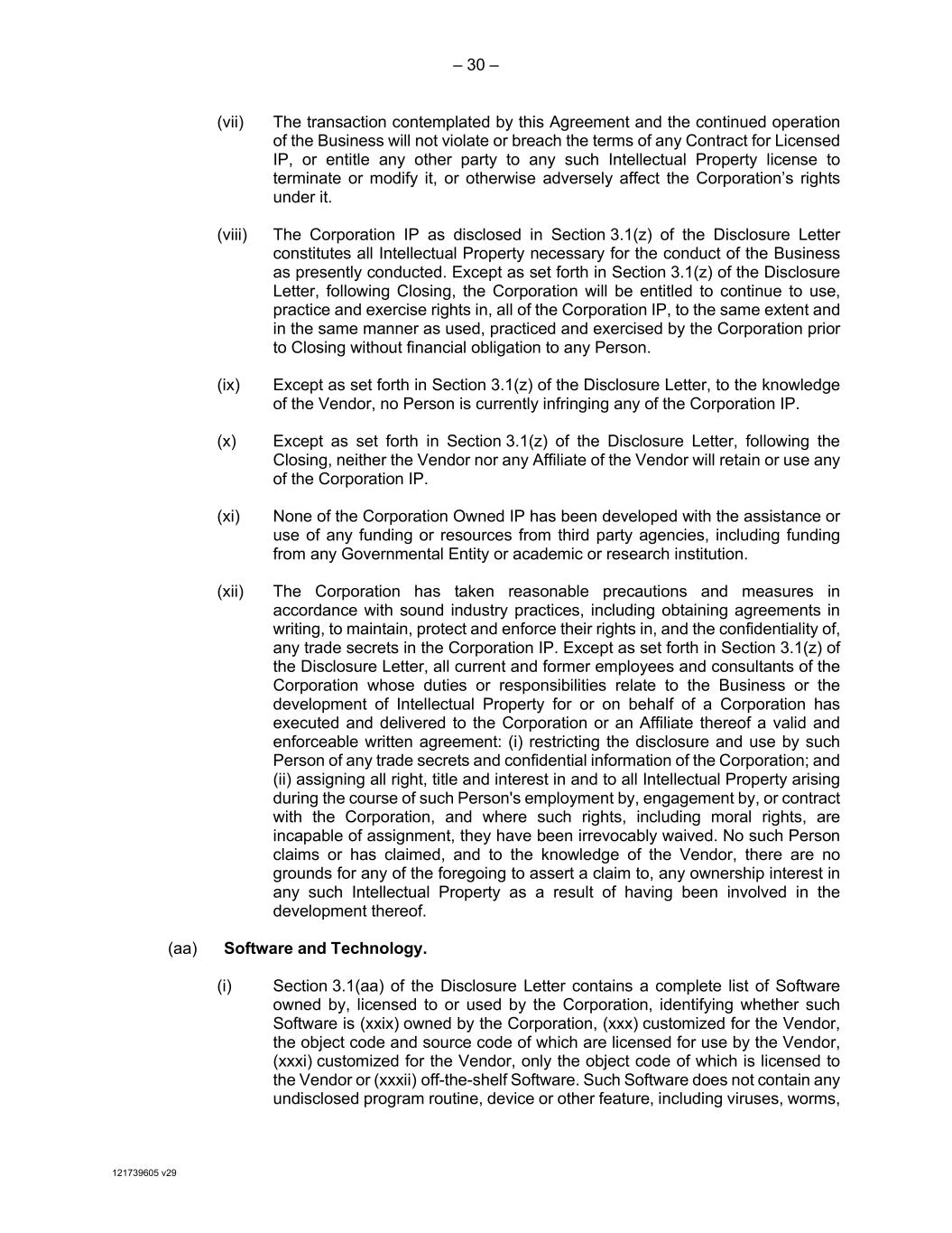 – 30 – 121739605 v29 (vii) The transaction contemplated by this Agreement and the continued operation of the Business will not violate or breach the terms of any Contract for Licensed IP, or entitle any other party to any such Intellectual Property license to terminate or modify it, or otherwise adversely affect the Corporation’s rights under it. (viii) The Corporation IP as disclosed in Section 3.1(z) of the Disclosure Letter constitutes all Intellectual Property necessary for the conduct of the Business as presently conducted. Except as set forth in Section 3.1(z) of the Disclosure Letter, following Closing, the Corporation will be entitled to continue to use, practice and exercise rights in, all of the Corporation IP, to the same extent and in the same manner as used, practiced and exercised by the Corporation prior to Closing without financial obligation to any Person. (ix) Except as set forth in Section 3.1(z) of the Disclosure Letter, to the knowledge of the Vendor, no Person is currently infringing any of the Corporation IP. (x) Except as set forth in Section 3.1(z) of the Disclosure Letter, following the Closing, neither the Vendor nor any Affiliate of the Vendor will retain or use any of the Corporation IP. (xi) None of the Corporation Owned IP has been developed with the assistance or use of any funding or resources from third party agencies, including funding from any Governmental Entity or academic or research institution. (xii) The Corporation has taken reasonable precautions and measures in accordance with sound industry practices, including obtaining agreements in writing, to maintain, protect and enforce their rights in, and the confidentiality of, any trade secrets in the Corporation IP. Except as set forth in Section 3.1(z) of the Disclosure Letter, all current and former employees and consultants of the Corporation whose duties or responsibilities relate to the Business or the development of Intellectual Property for or on behalf of a Corporation has executed and delivered to the Corporation or an Affiliate thereof a valid and enforceable written agreement: (i) restricting the disclosure and use by such Person of any trade secrets and confidential information of the Corporation; and (ii) assigning all right, title and interest in and to all Intellectual Property arising during the course of such Person's employment by, engagement by, or contract with the Corporation, and where such rights, including moral rights, are incapable of assignment, they have been irrevocably waived. No such Person claims or has claimed, and to the knowledge of the Vendor, there are no grounds for any of the foregoing to assert a claim to, any ownership interest in any such Intellectual Property as a result of having been involved in the development thereof. (aa) Software and Technology. (i) Section 3.1(aa) of the Disclosure Letter contains a complete list of Software owned by, licensed to or used by the Corporation, identifying whether such Software is (xxix) owned by the Corporation, (xxx) customized for the Vendor, the object code and source code of which are licensed for use by the Vendor, (xxxi) customized for the Vendor, only the object code of which is licensed to the Vendor or (xxxii) off-the-shelf Software. Such Software does not contain any undisclosed program routine, device or other feature, including viruses, worms,