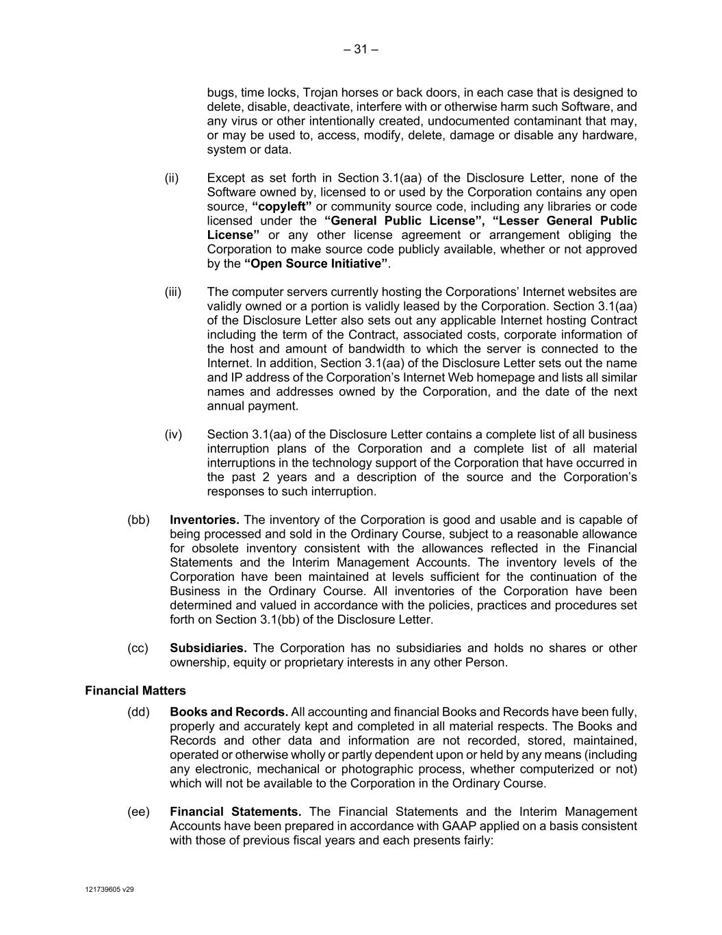 – 31 – 121739605 v29 bugs, time locks, Trojan horses or back doors, in each case that is designed to delete, disable, deactivate, interfere with or otherwise harm such Software, and any virus or other intentionally created, undocumented contaminant that may, or may be used to, access, modify, delete, damage or disable any hardware, system or data. (ii) Except as set forth in Section 3.1(aa) of the Disclosure Letter, none of the Software owned by, licensed to or used by the Corporation contains any open source, “copyleft” or community source code, including any libraries or code licensed under the “General Public License”, “Lesser General Public License” or any other license agreement or arrangement obliging the Corporation to make source code publicly available, whether or not approved by the “Open Source Initiative”. (iii) The computer servers currently hosting the Corporations’ Internet websites are validly owned or a portion is validly leased by the Corporation. Section 3.1(aa) of the Disclosure Letter also sets out any applicable Internet hosting Contract including the term of the Contract, associated costs, corporate information of the host and amount of bandwidth to which the server is connected to the Internet. In addition, Section 3.1(aa) of the Disclosure Letter sets out the name and IP address of the Corporation’s Internet Web homepage and lists all similar names and addresses owned by the Corporation, and the date of the next annual payment. (iv) Section 3.1(aa) of the Disclosure Letter contains a complete list of all business interruption plans of the Corporation and a complete list of all material interruptions in the technology support of the Corporation that have occurred in the past 2 years and a description of the source and the Corporation’s responses to such interruption. (bb) Inventories. The inventory of the Corporation is good and usable and is capable of being processed and sold in the Ordinary Course, subject to a reasonable allowance for obsolete inventory consistent with the allowances reflected in the Financial Statements and the Interim Management Accounts. The inventory levels of the Corporation have been maintained at levels sufficient for the continuation of the Business in the Ordinary Course. All inventories of the Corporation have been determined and valued in accordance with the policies, practices and procedures set forth on Section 3.1(bb) of the Disclosure Letter. (cc) Subsidiaries. The Corporation has no subsidiaries and holds no shares or other ownership, equity or proprietary interests in any other Person. Financial Matters (dd) Books and Records. All accounting and financial Books and Records have been fully, properly and accurately kept and completed in all material respects. The Books and Records and other data and information are not recorded, stored, maintained, operated or otherwise wholly or partly dependent upon or held by any means (including any electronic, mechanical or photographic process, whether computerized or not) which will not be available to the Corporation in the Ordinary Course. (ee) Financial Statements. The Financial Statements and the Interim Management Accounts have been prepared in accordance with GAAP applied on a basis consistent with those of previous fiscal years and each presents fairly: