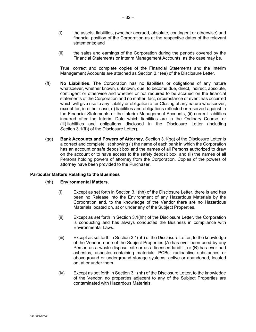 – 32 – 121739605 v29 (i) the assets, liabilities, (whether accrued, absolute, contingent or otherwise) and financial position of the Corporation as at the respective dates of the relevant statements; and (ii) the sales and earnings of the Corporation during the periods covered by the Financial Statements or Interim Management Accounts, as the case may be. True, correct and complete copies of the Financial Statements and the Interim Management Accounts are attached as Section 3.1(ee) of the Disclosure Letter. (ff) No Liabilities. The Corporation has no liabilities or obligations of any nature whatsoever, whether known, unknown, due, to become due, direct, indirect, absolute, contingent or otherwise and whether or not required to be accrued on the financial statements of the Corporation and no matter, fact, circumstance or event has occurred which will give rise to any liability or obligation after Closing of any nature whatsoever, except for, in either case, (i) liabilities and obligations reflected or reserved against in the Financial Statements or the Interim Management Accounts, (ii) current liabilities incurred after the Interim Date which liabilities are in the Ordinary Course, or (iii) liabilities and obligations disclosed in the Disclosure Letter (including Section 3.1(ff)) of the Disclosure Letter). (gg) Bank Accounts and Powers of Attorney. Section 3.1(gg) of the Disclosure Letter is a correct and complete list showing (i) the name of each bank in which the Corporation has an account or safe deposit box and the names of all Persons authorized to draw on the account or to have access to the safety deposit box, and (ii) the names of all Persons holding powers of attorney from the Corporation. Copies of the powers of attorney have been provided to the Purchaser. Particular Matters Relating to the Business (hh) Environmental Matters. (i) Except as set forth in Section 3.1(hh) of the Disclosure Letter, there is and has been no Release into the Environment of any Hazardous Materials by the Corporation and, to the knowledge of the Vendor there are no Hazardous Materials located on, at or under any of the Subject Properties. (ii) Except as set forth in Section 3.1(hh) of the Disclosure Letter, the Corporation is conducting and has always conducted the Business in compliance with Environmental Laws. (iii) Except as set forth in Section 3.1(hh) of the Disclosure Letter, to the knowledge of the Vendor, none of the Subject Properties (A) has ever been used by any Person as a waste disposal site or as a licensed landfill, or (B) has ever had asbestos, asbestos-containing materials, PCBs, radioactive substances or aboveground or underground storage systems, active or abandoned, located on, at or under them. (iv) Except as set forth in Section 3.1(hh) of the Disclosure Letter, to the knowledge of the Vendor, no properties adjacent to any of the Subject Properties are contaminated with Hazardous Materials.