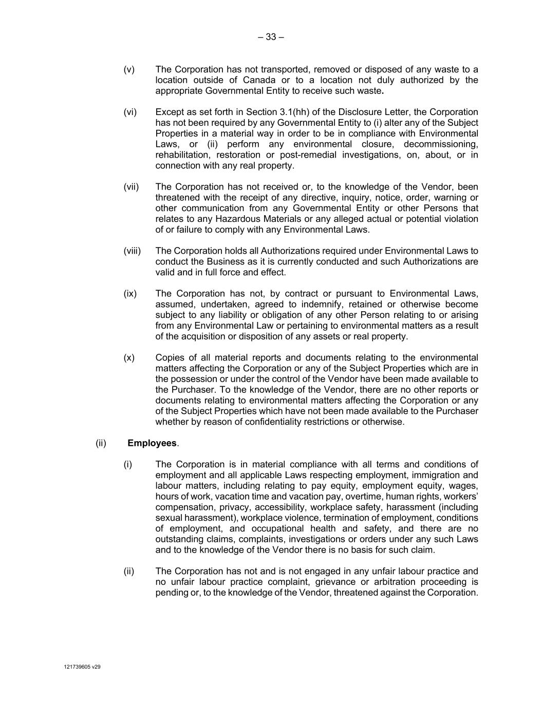 – 33 – 121739605 v29 (v) The Corporation has not transported, removed or disposed of any waste to a location outside of Canada or to a location not duly authorized by the appropriate Governmental Entity to receive such waste. (vi) Except as set forth in Section 3.1(hh) of the Disclosure Letter, the Corporation has not been required by any Governmental Entity to (i) alter any of the Subject Properties in a material way in order to be in compliance with Environmental Laws, or (ii) perform any environmental closure, decommissioning, rehabilitation, restoration or post-remedial investigations, on, about, or in connection with any real property. (vii) The Corporation has not received or, to the knowledge of the Vendor, been threatened with the receipt of any directive, inquiry, notice, order, warning or other communication from any Governmental Entity or other Persons that relates to any Hazardous Materials or any alleged actual or potential violation of or failure to comply with any Environmental Laws. (viii) The Corporation holds all Authorizations required under Environmental Laws to conduct the Business as it is currently conducted and such Authorizations are valid and in full force and effect. (ix) The Corporation has not, by contract or pursuant to Environmental Laws, assumed, undertaken, agreed to indemnify, retained or otherwise become subject to any liability or obligation of any other Person relating to or arising from any Environmental Law or pertaining to environmental matters as a result of the acquisition or disposition of any assets or real property. (x) Copies of all material reports and documents relating to the environmental matters affecting the Corporation or any of the Subject Properties which are in the possession or under the control of the Vendor have been made available to the Purchaser. To the knowledge of the Vendor, there are no other reports or documents relating to environmental matters affecting the Corporation or any of the Subject Properties which have not been made available to the Purchaser whether by reason of confidentiality restrictions or otherwise. (ii) Employees. (i) The Corporation is in material compliance with all terms and conditions of employment and all applicable Laws respecting employment, immigration and labour matters, including relating to pay equity, employment equity, wages, hours of work, vacation time and vacation pay, overtime, human rights, workers’ compensation, privacy, accessibility, workplace safety, harassment (including sexual harassment), workplace violence, termination of employment, conditions of employment, and occupational health and safety, and there are no outstanding claims, complaints, investigations or orders under any such Laws and to the knowledge of the Vendor there is no basis for such claim. (ii) The Corporation has not and is not engaged in any unfair labour practice and no unfair labour practice complaint, grievance or arbitration proceeding is pending or, to the knowledge of the Vendor, threatened against the Corporation.