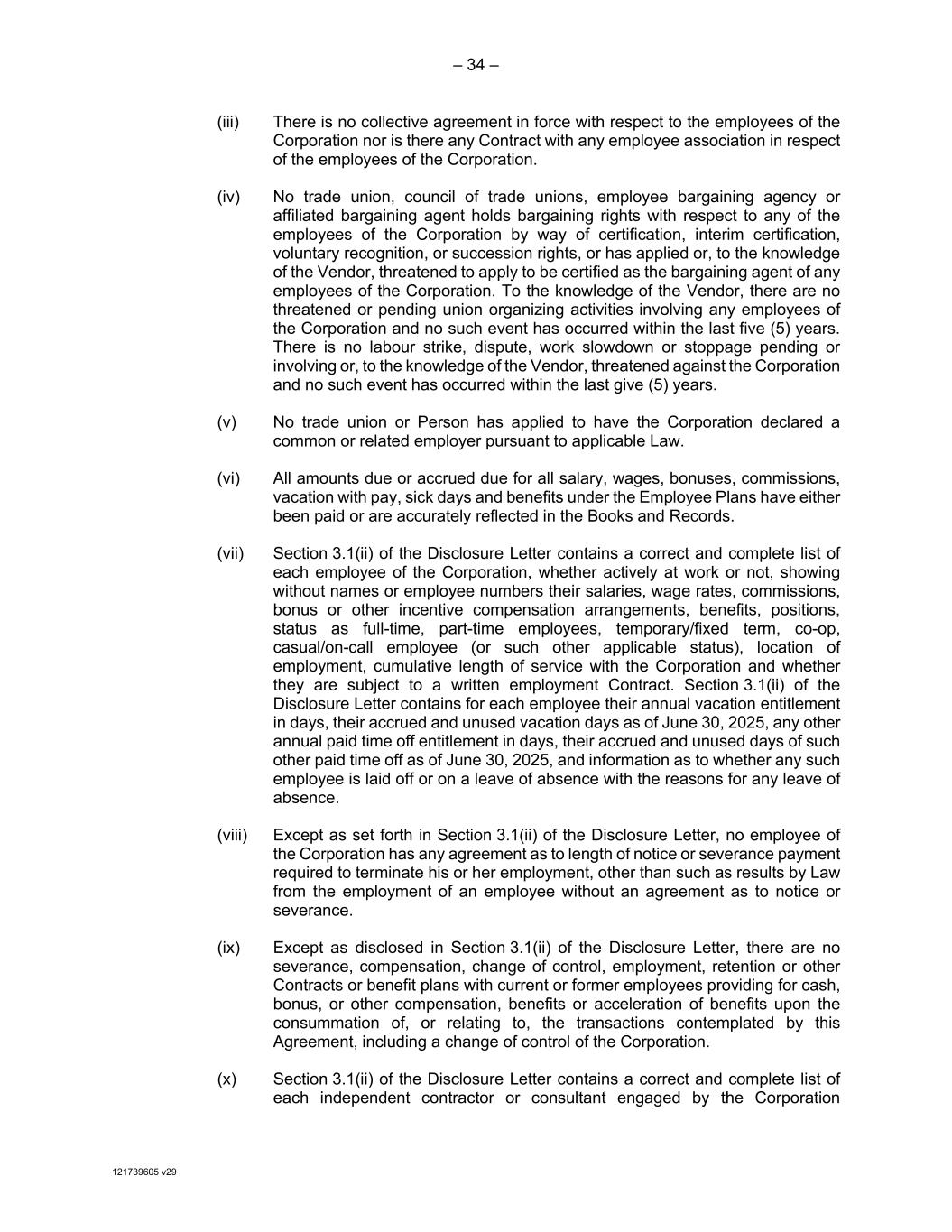 – 34 – 121739605 v29 (iii) There is no collective agreement in force with respect to the employees of the Corporation nor is there any Contract with any employee association in respect of the employees of the Corporation. (iv) No trade union, council of trade unions, employee bargaining agency or affiliated bargaining agent holds bargaining rights with respect to any of the employees of the Corporation by way of certification, interim certification, voluntary recognition, or succession rights, or has applied or, to the knowledge of the Vendor, threatened to apply to be certified as the bargaining agent of any employees of the Corporation. To the knowledge of the Vendor, there are no threatened or pending union organizing activities involving any employees of the Corporation and no such event has occurred within the last five (5) years. There is no labour strike, dispute, work slowdown or stoppage pending or involving or, to the knowledge of the Vendor, threatened against the Corporation and no such event has occurred within the last give (5) years. (v) No trade union or Person has applied to have the Corporation declared a common or related employer pursuant to applicable Law. (vi) All amounts due or accrued due for all salary, wages, bonuses, commissions, vacation with pay, sick days and benefits under the Employee Plans have either been paid or are accurately reflected in the Books and Records. (vii) Section 3.1(ii) of the Disclosure Letter contains a correct and complete list of each employee of the Corporation, whether actively at work or not, showing without names or employee numbers their salaries, wage rates, commissions, bonus or other incentive compensation arrangements, benefits, positions, status as full-time, part-time employees, temporary/fixed term, co-op, casual/on-call employee (or such other applicable status), location of employment, cumulative length of service with the Corporation and whether they are subject to a written employment Contract. Section 3.1(ii) of the Disclosure Letter contains for each employee their annual vacation entitlement in days, their accrued and unused vacation days as of June 30, 2025, any other annual paid time off entitlement in days, their accrued and unused days of such other paid time off as of June 30, 2025, and information as to whether any such employee is laid off or on a leave of absence with the reasons for any leave of absence. (viii) Except as set forth in Section 3.1(ii) of the Disclosure Letter, no employee of the Corporation has any agreement as to length of notice or severance payment required to terminate his or her employment, other than such as results by Law from the employment of an employee without an agreement as to notice or severance. (ix) Except as disclosed in Section 3.1(ii) of the Disclosure Letter, there are no severance, compensation, change of control, employment, retention or other Contracts or benefit plans with current or former employees providing for cash, bonus, or other compensation, benefits or acceleration of benefits upon the consummation of, or relating to, the transactions contemplated by this Agreement, including a change of control of the Corporation. (x) Section 3.1(ii) of the Disclosure Letter contains a correct and complete list of each independent contractor or consultant engaged by the Corporation