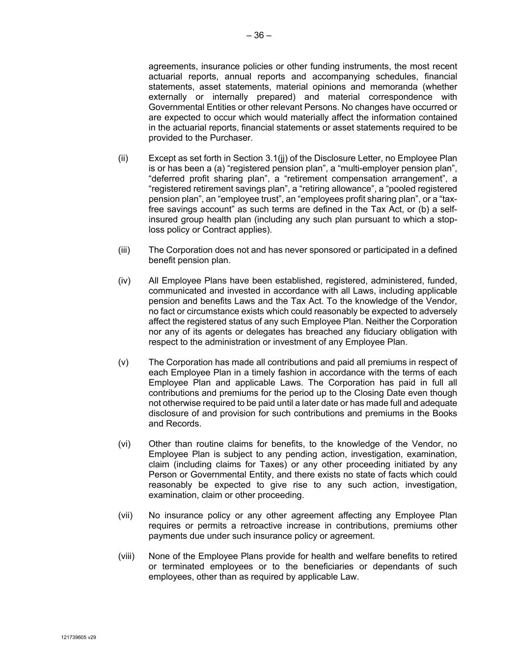 – 36 – 121739605 v29 agreements, insurance policies or other funding instruments, the most recent actuarial reports, annual reports and accompanying schedules, financial statements, asset statements, material opinions and memoranda (whether externally or internally prepared) and material correspondence with Governmental Entities or other relevant Persons. No changes have occurred or are expected to occur which would materially affect the information contained in the actuarial reports, financial statements or asset statements required to be provided to the Purchaser. (ii) Except as set forth in Section 3.1(jj) of the Disclosure Letter, no Employee Plan is or has been a (a) “registered pension plan”, a “multi-employer pension plan”, “deferred profit sharing plan”, a “retirement compensation arrangement”, a “registered retirement savings plan”, a “retiring allowance”, a “pooled registered pension plan”, an “employee trust”, an “employees profit sharing plan”, or a “tax- free savings account” as such terms are defined in the Tax Act, or (b) a self- insured group health plan (including any such plan pursuant to which a stop- loss policy or Contract applies). (iii) The Corporation does not and has never sponsored or participated in a defined benefit pension plan. (iv) All Employee Plans have been established, registered, administered, funded, communicated and invested in accordance with all Laws, including applicable pension and benefits Laws and the Tax Act. To the knowledge of the Vendor, no fact or circumstance exists which could reasonably be expected to adversely affect the registered status of any such Employee Plan. Neither the Corporation nor any of its agents or delegates has breached any fiduciary obligation with respect to the administration or investment of any Employee Plan. (v) The Corporation has made all contributions and paid all premiums in respect of each Employee Plan in a timely fashion in accordance with the terms of each Employee Plan and applicable Laws. The Corporation has paid in full all contributions and premiums for the period up to the Closing Date even though not otherwise required to be paid until a later date or has made full and adequate disclosure of and provision for such contributions and premiums in the Books and Records. (vi) Other than routine claims for benefits, to the knowledge of the Vendor, no Employee Plan is subject to any pending action, investigation, examination, claim (including claims for Taxes) or any other proceeding initiated by any Person or Governmental Entity, and there exists no state of facts which could reasonably be expected to give rise to any such action, investigation, examination, claim or other proceeding. (vii) No insurance policy or any other agreement affecting any Employee Plan requires or permits a retroactive increase in contributions, premiums other payments due under such insurance policy or agreement. (viii) None of the Employee Plans provide for health and welfare benefits to retired or terminated employees or to the beneficiaries or dependants of such employees, other than as required by applicable Law.
