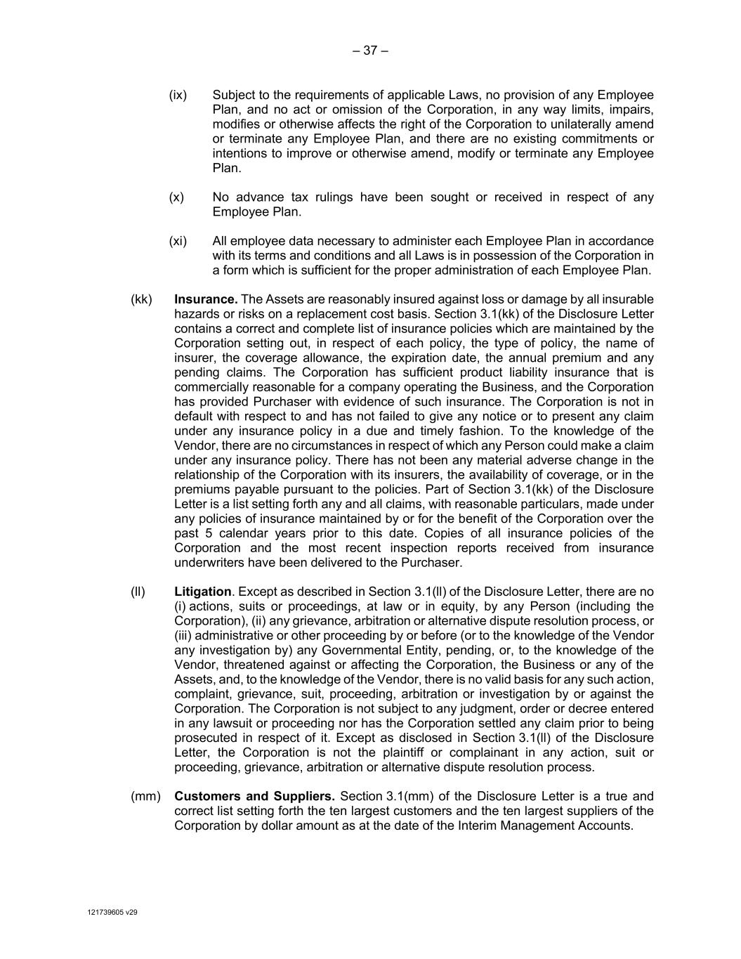 – 37 – 121739605 v29 (ix) Subject to the requirements of applicable Laws, no provision of any Employee Plan, and no act or omission of the Corporation, in any way limits, impairs, modifies or otherwise affects the right of the Corporation to unilaterally amend or terminate any Employee Plan, and there are no existing commitments or intentions to improve or otherwise amend, modify or terminate any Employee Plan. (x) No advance tax rulings have been sought or received in respect of any Employee Plan. (xi) All employee data necessary to administer each Employee Plan in accordance with its terms and conditions and all Laws is in possession of the Corporation in a form which is sufficient for the proper administration of each Employee Plan. (kk) Insurance. The Assets are reasonably insured against loss or damage by all insurable hazards or risks on a replacement cost basis. Section 3.1(kk) of the Disclosure Letter contains a correct and complete list of insurance policies which are maintained by the Corporation setting out, in respect of each policy, the type of policy, the name of insurer, the coverage allowance, the expiration date, the annual premium and any pending claims. The Corporation has sufficient product liability insurance that is commercially reasonable for a company operating the Business, and the Corporation has provided Purchaser with evidence of such insurance. The Corporation is not in default with respect to and has not failed to give any notice or to present any claim under any insurance policy in a due and timely fashion. To the knowledge of the Vendor, there are no circumstances in respect of which any Person could make a claim under any insurance policy. There has not been any material adverse change in the relationship of the Corporation with its insurers, the availability of coverage, or in the premiums payable pursuant to the policies. Part of Section 3.1(kk) of the Disclosure Letter is a list setting forth any and all claims, with reasonable particulars, made under any policies of insurance maintained by or for the benefit of the Corporation over the past 5 calendar years prior to this date. Copies of all insurance policies of the Corporation and the most recent inspection reports received from insurance underwriters have been delivered to the Purchaser. (ll) Litigation. Except as described in Section 3.1(ll) of the Disclosure Letter, there are no (i) actions, suits or proceedings, at law or in equity, by any Person (including the Corporation), (ii) any grievance, arbitration or alternative dispute resolution process, or (iii) administrative or other proceeding by or before (or to the knowledge of the Vendor any investigation by) any Governmental Entity, pending, or, to the knowledge of the Vendor, threatened against or affecting the Corporation, the Business or any of the Assets, and, to the knowledge of the Vendor, there is no valid basis for any such action, complaint, grievance, suit, proceeding, arbitration or investigation by or against the Corporation. The Corporation is not subject to any judgment, order or decree entered in any lawsuit or proceeding nor has the Corporation settled any claim prior to being prosecuted in respect of it. Except as disclosed in Section 3.1(ll) of the Disclosure Letter, the Corporation is not the plaintiff or complainant in any action, suit or proceeding, grievance, arbitration or alternative dispute resolution process. (mm) Customers and Suppliers. Section 3.1(mm) of the Disclosure Letter is a true and correct list setting forth the ten largest customers and the ten largest suppliers of the Corporation by dollar amount as at the date of the Interim Management Accounts.