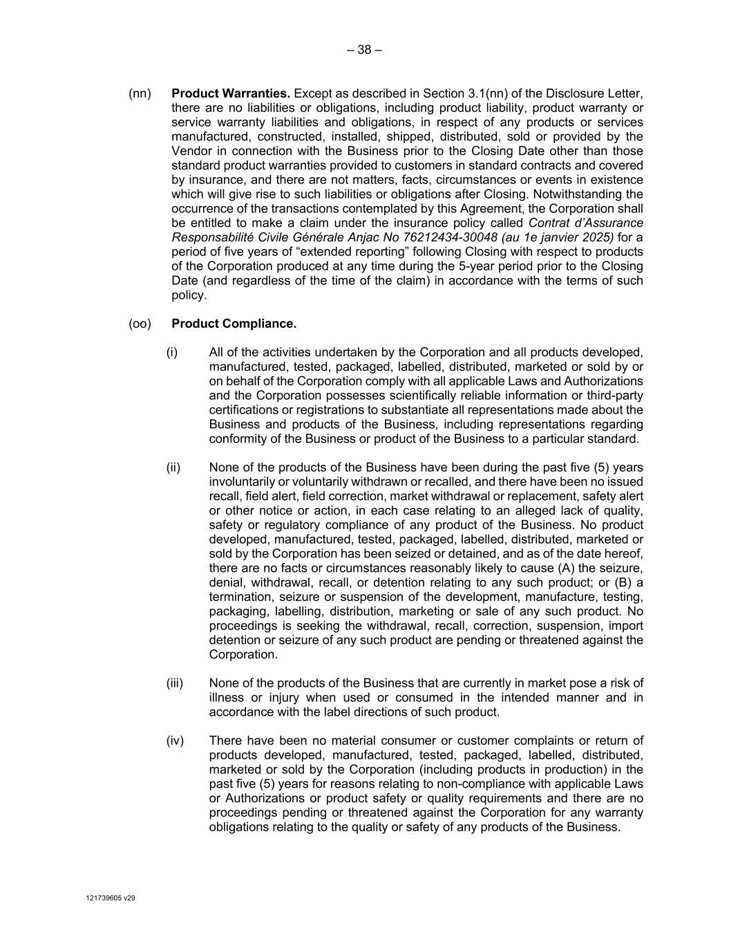– 38 – 121739605 v29 (nn) Product Warranties. Except as described in Section 3.1(nn) of the Disclosure Letter, there are no liabilities or obligations, including product liability, product warranty or service warranty liabilities and obligations, in respect of any products or services manufactured, constructed, installed, shipped, distributed, sold or provided by the Vendor in connection with the Business prior to the Closing Date other than those standard product warranties provided to customers in standard contracts and covered by insurance, and there are not matters, facts, circumstances or events in existence which will give rise to such liabilities or obligations after Closing. Notwithstanding the occurrence of the transactions contemplated by this Agreement, the Corporation shall be entitled to make a claim under the insurance policy called Contrat d’Assurance Responsabilité Civile Générale Anjac No 76212434-30048 (au 1e janvier 2025) for a period of five years of “extended reporting” following Closing with respect to products of the Corporation produced at any time during the 5-year period prior to the Closing Date (and regardless of the time of the claim) in accordance with the terms of such policy. (oo) Product Compliance. (i) All of the activities undertaken by the Corporation and all products developed, manufactured, tested, packaged, labelled, distributed, marketed or sold by or on behalf of the Corporation comply with all applicable Laws and Authorizations and the Corporation possesses scientifically reliable information or third-party certifications or registrations to substantiate all representations made about the Business and products of the Business, including representations regarding conformity of the Business or product of the Business to a particular standard. (ii) None of the products of the Business have been during the past five (5) years involuntarily or voluntarily withdrawn or recalled, and there have been no issued recall, field alert, field correction, market withdrawal or replacement, safety alert or other notice or action, in each case relating to an alleged lack of quality, safety or regulatory compliance of any product of the Business. No product developed, manufactured, tested, packaged, labelled, distributed, marketed or sold by the Corporation has been seized or detained, and as of the date hereof, there are no facts or circumstances reasonably likely to cause (A) the seizure, denial, withdrawal, recall, or detention relating to any such product; or (B) a termination, seizure or suspension of the development, manufacture, testing, packaging, labelling, distribution, marketing or sale of any such product. No proceedings is seeking the withdrawal, recall, correction, suspension, import detention or seizure of any such product are pending or threatened against the Corporation. (iii) None of the products of the Business that are currently in market pose a risk of illness or injury when used or consumed in the intended manner and in accordance with the label directions of such product. (iv) There have been no material consumer or customer complaints or return of products developed, manufactured, tested, packaged, labelled, distributed, marketed or sold by the Corporation (including products in production) in the past five (5) years for reasons relating to non-compliance with applicable Laws or Authorizations or product safety or quality requirements and there are no proceedings pending or threatened against the Corporation for any warranty obligations relating to the quality or safety of any products of the Business.