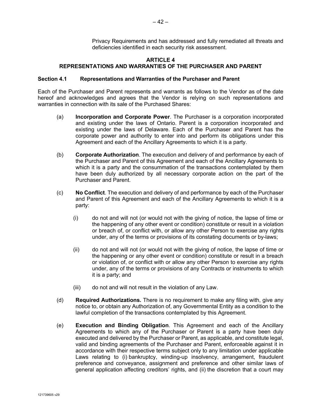 – 42 – 121739605 v29 Privacy Requirements and has addressed and fully remediated all threats and deficiencies identified in each security risk assessment. ARTICLE 4 REPRESENTATIONS AND WARRANTIES OF THE PURCHASER AND PARENT Section 4.1 Representations and Warranties of the Purchaser and Parent Each of the Purchaser and Parent represents and warrants as follows to the Vendor as of the date hereof and acknowledges and agrees that the Vendor is relying on such representations and warranties in connection with its sale of the Purchased Shares: (a) Incorporation and Corporate Power. The Purchaser is a corporation incorporated and existing under the laws of Ontario. Parent is a corporation incorporated and existing under the laws of Delaware. Each of the Purchaser and Parent has the corporate power and authority to enter into and perform its obligations under this Agreement and each of the Ancillary Agreements to which it is a party. (b) Corporate Authorization. The execution and delivery of and performance by each of the Purchaser and Parent of this Agreement and each of the Ancillary Agreements to which it is a party and the consummation of the transactions contemplated by them have been duly authorized by all necessary corporate action on the part of the Purchaser and Parent. (c) No Conflict. The execution and delivery of and performance by each of the Purchaser and Parent of this Agreement and each of the Ancillary Agreements to which it is a party: (i) do not and will not (or would not with the giving of notice, the lapse of time or the happening of any other event or condition) constitute or result in a violation or breach of, or conflict with, or allow any other Person to exercise any rights under, any of the terms or provisions of its constating documents or by-laws; (ii) do not and will not (or would not with the giving of notice, the lapse of time or the happening or any other event or condition) constitute or result in a breach or violation of, or conflict with or allow any other Person to exercise any rights under, any of the terms or provisions of any Contracts or instruments to which it is a party; and (iii) do not and will not result in the violation of any Law. (d) Required Authorizations. There is no requirement to make any filing with, give any notice to, or obtain any Authorization of, any Governmental Entity as a condition to the lawful completion of the transactions contemplated by this Agreement. (e) Execution and Binding Obligation. This Agreement and each of the Ancillary Agreements to which any of the Purchaser or Parent is a party have been duly executed and delivered by the Purchaser or Parent, as applicable, and constitute legal, valid and binding agreements of the Purchaser and Parent, enforceable against it in accordance with their respective terms subject only to any limitation under applicable Laws relating to (i) bankruptcy, winding-up insolvency, arrangement, fraudulent preference and conveyance, assignment and preference and other similar laws of general application affecting creditors’ rights, and (ii) the discretion that a court may