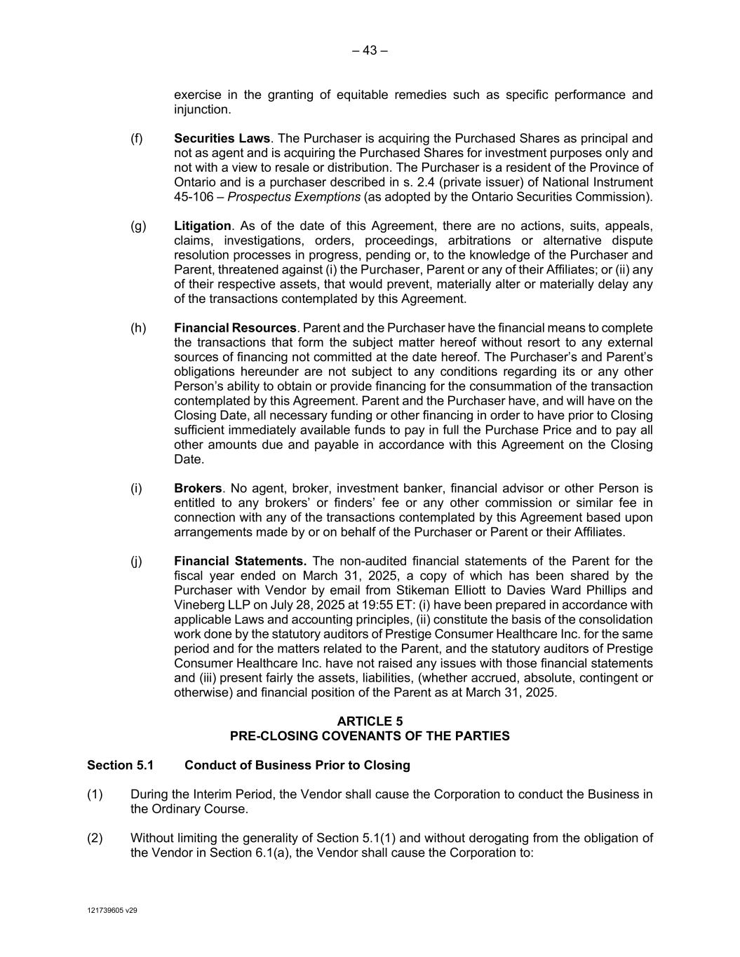 – 43 – 121739605 v29 exercise in the granting of equitable remedies such as specific performance and injunction. (f) Securities Laws. The Purchaser is acquiring the Purchased Shares as principal and not as agent and is acquiring the Purchased Shares for investment purposes only and not with a view to resale or distribution. The Purchaser is a resident of the Province of Ontario and is a purchaser described in s. 2.4 (private issuer) of National Instrument 45-106 – Prospectus Exemptions (as adopted by the Ontario Securities Commission). (g) Litigation. As of the date of this Agreement, there are no actions, suits, appeals, claims, investigations, orders, proceedings, arbitrations or alternative dispute resolution processes in progress, pending or, to the knowledge of the Purchaser and Parent, threatened against (i) the Purchaser, Parent or any of their Affiliates; or (ii) any of their respective assets, that would prevent, materially alter or materially delay any of the transactions contemplated by this Agreement. (h) Financial Resources. Parent and the Purchaser have the financial means to complete the transactions that form the subject matter hereof without resort to any external sources of financing not committed at the date hereof. The Purchaser’s and Parent’s obligations hereunder are not subject to any conditions regarding its or any other Person’s ability to obtain or provide financing for the consummation of the transaction contemplated by this Agreement. Parent and the Purchaser have, and will have on the Closing Date, all necessary funding or other financing in order to have prior to Closing sufficient immediately available funds to pay in full the Purchase Price and to pay all other amounts due and payable in accordance with this Agreement on the Closing Date. (i) Brokers. No agent, broker, investment banker, financial advisor or other Person is entitled to any brokers’ or finders’ fee or any other commission or similar fee in connection with any of the transactions contemplated by this Agreement based upon arrangements made by or on behalf of the Purchaser or Parent or their Affiliates. (j) Financial Statements. The non-audited financial statements of the Parent for the fiscal year ended on March 31, 2025, a copy of which has been shared by the Purchaser with Vendor by email from Stikeman Elliott to Davies Ward Phillips and Vineberg LLP on July 28, 2025 at 19:55 ET: (i) have been prepared in accordance with applicable Laws and accounting principles, (ii) constitute the basis of the consolidation work done by the statutory auditors of Prestige Consumer Healthcare Inc. for the same period and for the matters related to the Parent, and the statutory auditors of Prestige Consumer Healthcare Inc. have not raised any issues with those financial statements and (iii) present fairly the assets, liabilities, (whether accrued, absolute, contingent or otherwise) and financial position of the Parent as at March 31, 2025. ARTICLE 5 PRE-CLOSING COVENANTS OF THE PARTIES Section 5.1 Conduct of Business Prior to Closing (1) During the Interim Period, the Vendor shall cause the Corporation to conduct the Business in the Ordinary Course. (2) Without limiting the generality of Section 5.1(1) and without derogating from the obligation of the Vendor in Section 6.1(a), the Vendor shall cause the Corporation to: