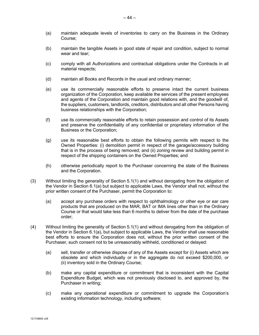 – 44 – 121739605 v29 (a) maintain adequate levels of inventories to carry on the Business in the Ordinary Course; (b) maintain the tangible Assets in good state of repair and condition, subject to normal wear and tear; (c) comply with all Authorizations and contractual obligations under the Contracts in all material respects; (d) maintain all Books and Records in the usual and ordinary manner; (e) use its commercially reasonable efforts to preserve intact the current business organization of the Corporation, keep available the services of the present employees and agents of the Corporation and maintain good relations with, and the goodwill of, the suppliers, customers, landlords, creditors, distributors and all other Persons having business relationships with the Corporation; (f) use its commercially reasonable efforts to retain possession and control of its Assets and preserve the confidentiality of any confidential or proprietary information of the Business or the Corporation; (g) use its reasonable best efforts to obtain the following permits with respect to the Owned Properties: (i) demolition permit in respect of the garage/accessory building that is in the process of being removed; and (ii) zoning review and building permit in respect of the shipping containers on the Owned Properties; and (h) otherwise periodically report to the Purchaser concerning the state of the Business and the Corporation. (3) Without limiting the generality of Section 5.1(1) and without derogating from the obligation of the Vendor in Section 6.1(a) but subject to applicable Laws, the Vendor shall not, without the prior written consent of the Purchaser, permit the Corporation to: (a) accept any purchase orders with respect to ophthalmology or other eye or ear care products that are produced on the MAR, BAT or IMA lines other than in the Ordinary Course or that would take less than 6 months to deliver from the date of the purchase order; (4) Without limiting the generality of Section 5.1(1) and without derogating from the obligation of the Vendor in Section 6.1(a), but subject to applicable Laws, the Vendor shall use reasonable best efforts to ensure the Corporation does not, without the prior written consent of the Purchaser, such consent not to be unreasonably withheld, conditioned or delayed: (a) sell, transfer or otherwise dispose of any of the Assets except for (i) Assets which are obsolete and which individually or in the aggregate do not exceed $200,000, or (ii) inventory sold in the Ordinary Course; (b) make any capital expenditure or commitment that is inconsistent with the Capital Expenditure Budget, which was not previously disclosed to, and approved by, the Purchaser in writing; (c) make any operational expenditure or commitment to upgrade the Corporation’s existing information technology, including software;