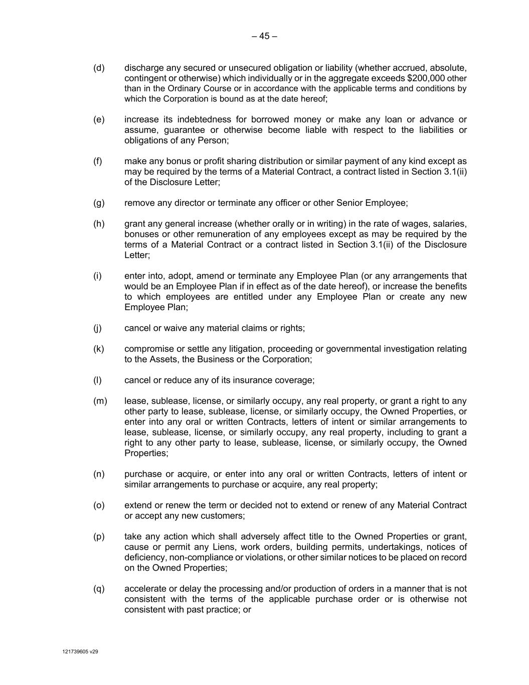 – 45 – 121739605 v29 (d) discharge any secured or unsecured obligation or liability (whether accrued, absolute, contingent or otherwise) which individually or in the aggregate exceeds $200,000 other than in the Ordinary Course or in accordance with the applicable terms and conditions by which the Corporation is bound as at the date hereof; (e) increase its indebtedness for borrowed money or make any loan or advance or assume, guarantee or otherwise become liable with respect to the liabilities or obligations of any Person; (f) make any bonus or profit sharing distribution or similar payment of any kind except as may be required by the terms of a Material Contract, a contract listed in Section 3.1(ii) of the Disclosure Letter; (g) remove any director or terminate any officer or other Senior Employee; (h) grant any general increase (whether orally or in writing) in the rate of wages, salaries, bonuses or other remuneration of any employees except as may be required by the terms of a Material Contract or a contract listed in Section 3.1(ii) of the Disclosure Letter; (i) enter into, adopt, amend or terminate any Employee Plan (or any arrangements that would be an Employee Plan if in effect as of the date hereof), or increase the benefits to which employees are entitled under any Employee Plan or create any new Employee Plan; (j) cancel or waive any material claims or rights; (k) compromise or settle any litigation, proceeding or governmental investigation relating to the Assets, the Business or the Corporation; (l) cancel or reduce any of its insurance coverage; (m) lease, sublease, license, or similarly occupy, any real property, or grant a right to any other party to lease, sublease, license, or similarly occupy, the Owned Properties, or enter into any oral or written Contracts, letters of intent or similar arrangements to lease, sublease, license, or similarly occupy, any real property, including to grant a right to any other party to lease, sublease, license, or similarly occupy, the Owned Properties; (n) purchase or acquire, or enter into any oral or written Contracts, letters of intent or similar arrangements to purchase or acquire, any real property; (o) extend or renew the term or decided not to extend or renew of any Material Contract or accept any new customers; (p) take any action which shall adversely affect title to the Owned Properties or grant, cause or permit any Liens, work orders, building permits, undertakings, notices of deficiency, non-compliance or violations, or other similar notices to be placed on record on the Owned Properties; (q) accelerate or delay the processing and/or production of orders in a manner that is not consistent with the terms of the applicable purchase order or is otherwise not consistent with past practice; or