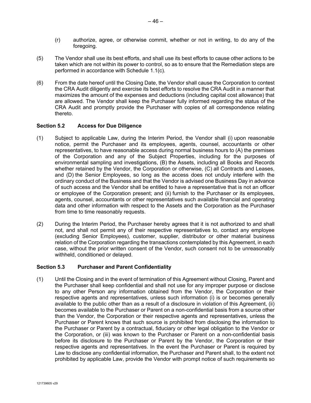 – 46 – 121739605 v29 (r) authorize, agree, or otherwise commit, whether or not in writing, to do any of the foregoing. (5) The Vendor shall use its best efforts, and shall use its best efforts to cause other actions to be taken which are not within its power to control, so as to ensure that the Remediation steps are performed in accordance with Schedule 1.1(c). (6) From the date hereof until the Closing Date, the Vendor shall cause the Corporation to contest the CRA Audit diligently and exercise its best efforts to resolve the CRA Audit in a manner that maximizes the amount of the expenses and deductions (including capital cost allowance) that are allowed. The Vendor shall keep the Purchaser fully informed regarding the status of the CRA Audit and promptly provide the Purchaser with copies of all correspondence relating thereto. Section 5.2 Access for Due Diligence (1) Subject to applicable Law, during the Interim Period, the Vendor shall (i) upon reasonable notice, permit the Purchaser and its employees, agents, counsel, accountants or other representatives, to have reasonable access during normal business hours to (A) the premises of the Corporation and any of the Subject Properties, including for the purposes of environmental sampling and investigations, (B) the Assets, including all Books and Records whether retained by the Vendor, the Corporation or otherwise, (C) all Contracts and Leases, and (D) the Senior Employees, so long as the access does not unduly interfere with the ordinary conduct of the Business and that the Vendor is advised one Business Day in advance of such access and the Vendor shall be entitled to have a representative that is not an officer or employee of the Corporation present; and (ii) furnish to the Purchaser or its employees, agents, counsel, accountants or other representatives such available financial and operating data and other information with respect to the Assets and the Corporation as the Purchaser from time to time reasonably requests. (2) During the Interim Period, the Purchaser hereby agrees that it is not authorized to and shall not, and shall not permit any of their respective representatives to, contact any employee (excluding Senior Employees), customer, supplier, distributor or other material business relation of the Corporation regarding the transactions contemplated by this Agreement, in each case, without the prior written consent of the Vendor, such consent not to be unreasonably withheld, conditioned or delayed. Section 5.3 Purchaser and Parent Confidentiality (1) Until the Closing and in the event of termination of this Agreement without Closing, Parent and the Purchaser shall keep confidential and shall not use for any improper purpose or disclose to any other Person any information obtained from the Vendor, the Corporation or their respective agents and representatives, unless such information (i) is or becomes generally available to the public other than as a result of a disclosure in violation of this Agreement, (ii) becomes available to the Purchaser or Parent on a non-confidential basis from a source other than the Vendor, the Corporation or their respective agents and representatives, unless the Purchaser or Parent knows that such source is prohibited from disclosing the information to the Purchaser or Parent by a contractual, fiduciary or other legal obligation to the Vendor or the Corporation, or (iii) was known to the Purchaser or Parent on a non-confidential basis before its disclosure to the Purchaser or Parent by the Vendor, the Corporation or their respective agents and representatives. In the event the Purchaser or Parent is required by Law to disclose any confidential information, the Purchaser and Parent shall, to the extent not prohibited by applicable Law, provide the Vendor with prompt notice of such requirements so