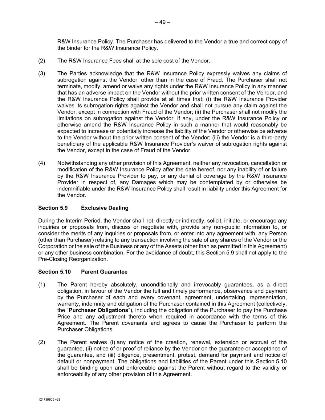 – 49 – 121739605 v29 R&W Insurance Policy. The Purchaser has delivered to the Vendor a true and correct copy of the binder for the R&W Insurance Policy. (2) The R&W Insurance Fees shall at the sole cost of the Vendor. (3) The Parties acknowledge that the R&W Insurance Policy expressly waives any claims of subrogation against the Vendor, other than in the case of Fraud. The Purchaser shall not terminate, modify, amend or waive any rights under the R&W Insurance Policy in any manner that has an adverse impact on the Vendor without the prior written consent of the Vendor, and the R&W Insurance Policy shall provide at all times that: (i) the R&W Insurance Provider waives its subrogation rights against the Vendor and shall not pursue any claim against the Vendor, except in connection with Fraud of the Vendor; (ii) the Purchaser shall not modify the limitations on subrogation against the Vendor, if any, under the R&W Insurance Policy or otherwise amend the R&W Insurance Policy in such a manner that would reasonably be expected to increase or potentially increase the liability of the Vendor or otherwise be adverse to the Vendor without the prior written consent of the Vendor; (iii) the Vendor is a third-party beneficiary of the applicable R&W Insurance Provider’s waiver of subrogation rights against the Vendor, except in the case of Fraud of the Vendor. (4) Notwithstanding any other provision of this Agreement, neither any revocation, cancellation or modification of the R&W Insurance Policy after the date hereof, nor any inability of or failure by the R&W Insurance Provider to pay, or any denial of coverage by the R&W Insurance Provider in respect of, any Damages which may be contemplated by or otherwise be indemnifiable under the R&W Insurance Policy shall result in liability under this Agreement for the Vendor. Section 5.9 Exclusive Dealing During the Interim Period, the Vendor shall not, directly or indirectly, solicit, initiate, or encourage any inquiries or proposals from, discuss or negotiate with, provide any non-public information to, or consider the merits of any inquiries or proposals from, or enter into any agreement with, any Person (other than Purchaser) relating to any transaction involving the sale of any shares of the Vendor or the Corporation or the sale of the Business or any of the Assets (other than as permitted in this Agreement) or any other business combination. For the avoidance of doubt, this Section 5.9 shall not apply to the Pre-Closing Reorganization. Section 5.10 Parent Guarantee (1) The Parent hereby absolutely, unconditionally and irrevocably guarantees, as a direct obligation, in favour of the Vendor the full and timely performance, observance and payment by the Purchaser of each and every covenant, agreement, undertaking, representation, warranty, indemnity and obligation of the Purchaser contained in this Agreement (collectively, the “Purchaser Obligations”), including the obligation of the Purchaser to pay the Purchase Price and any adjustment thereto when required in accordance with the terms of this Agreement. The Parent covenants and agrees to cause the Purchaser to perform the Purchaser Obligations. (2) The Parent waives (i) any notice of the creation, renewal, extension or accrual of the guarantee, (ii) notice of or proof of reliance by the Vendor on the guarantee or acceptance of the guarantee, and (iii) diligence, presentment, protest, demand for payment and notice of default or nonpayment. The obligations and liabilities of the Parent under this Section 5.10 shall be binding upon and enforceable against the Parent without regard to the validity or enforceability of any other provision of this Agreement.