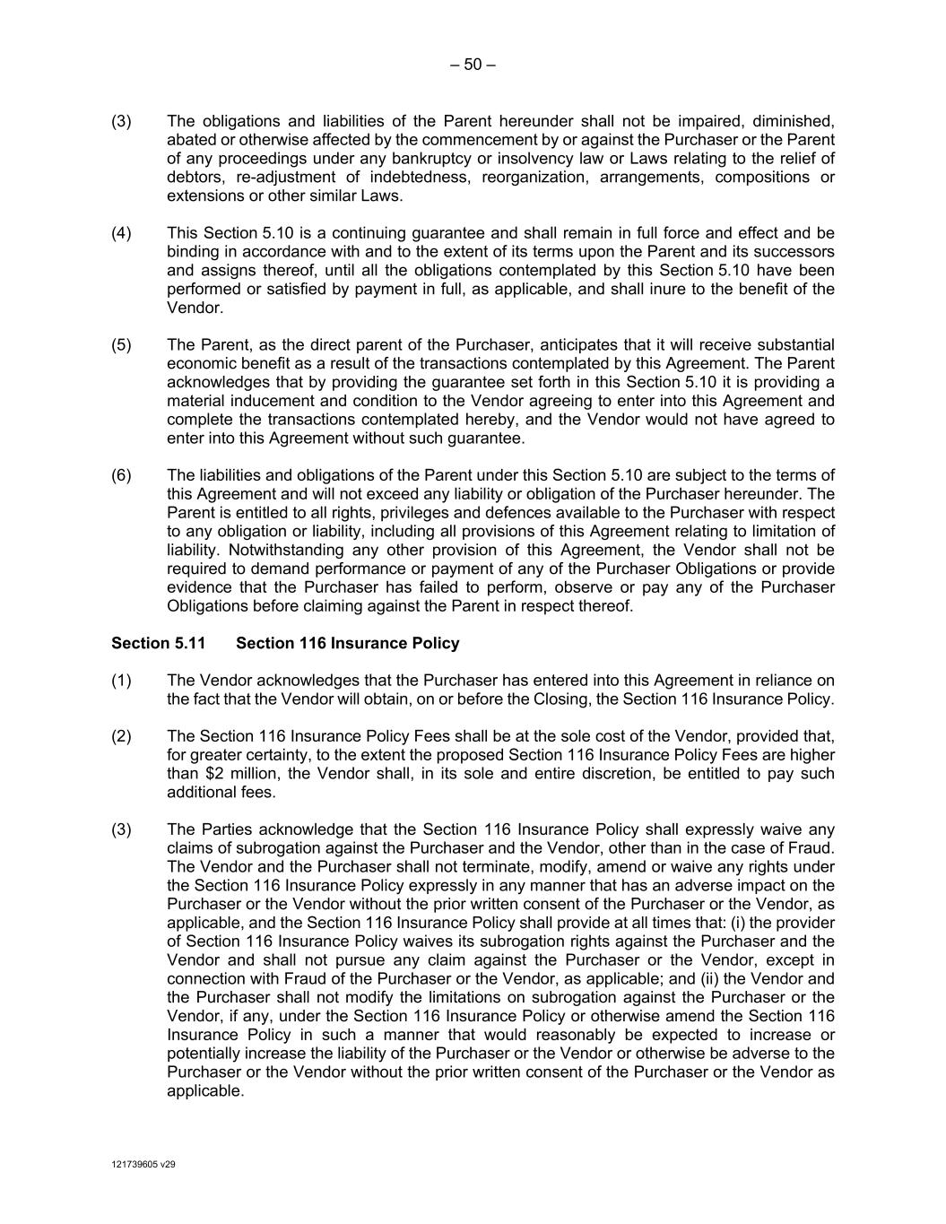 – 50 – 121739605 v29 (3) The obligations and liabilities of the Parent hereunder shall not be impaired, diminished, abated or otherwise affected by the commencement by or against the Purchaser or the Parent of any proceedings under any bankruptcy or insolvency law or Laws relating to the relief of debtors, re-adjustment of indebtedness, reorganization, arrangements, compositions or extensions or other similar Laws. (4) This Section 5.10 is a continuing guarantee and shall remain in full force and effect and be binding in accordance with and to the extent of its terms upon the Parent and its successors and assigns thereof, until all the obligations contemplated by this Section 5.10 have been performed or satisfied by payment in full, as applicable, and shall inure to the benefit of the Vendor. (5) The Parent, as the direct parent of the Purchaser, anticipates that it will receive substantial economic benefit as a result of the transactions contemplated by this Agreement. The Parent acknowledges that by providing the guarantee set forth in this Section 5.10 it is providing a material inducement and condition to the Vendor agreeing to enter into this Agreement and complete the transactions contemplated hereby, and the Vendor would not have agreed to enter into this Agreement without such guarantee. (6) The liabilities and obligations of the Parent under this Section 5.10 are subject to the terms of this Agreement and will not exceed any liability or obligation of the Purchaser hereunder. The Parent is entitled to all rights, privileges and defences available to the Purchaser with respect to any obligation or liability, including all provisions of this Agreement relating to limitation of liability. Notwithstanding any other provision of this Agreement, the Vendor shall not be required to demand performance or payment of any of the Purchaser Obligations or provide evidence that the Purchaser has failed to perform, observe or pay any of the Purchaser Obligations before claiming against the Parent in respect thereof. Section 5.11 Section 116 Insurance Policy (1) The Vendor acknowledges that the Purchaser has entered into this Agreement in reliance on the fact that the Vendor will obtain, on or before the Closing, the Section 116 Insurance Policy. (2) The Section 116 Insurance Policy Fees shall be at the sole cost of the Vendor, provided that, for greater certainty, to the extent the proposed Section 116 Insurance Policy Fees are higher than $2 million, the Vendor shall, in its sole and entire discretion, be entitled to pay such additional fees. (3) The Parties acknowledge that the Section 116 Insurance Policy shall expressly waive any claims of subrogation against the Purchaser and the Vendor, other than in the case of Fraud. The Vendor and the Purchaser shall not terminate, modify, amend or waive any rights under the Section 116 Insurance Policy expressly in any manner that has an adverse impact on the Purchaser or the Vendor without the prior written consent of the Purchaser or the Vendor, as applicable, and the Section 116 Insurance Policy shall provide at all times that: (i) the provider of Section 116 Insurance Policy waives its subrogation rights against the Purchaser and the Vendor and shall not pursue any claim against the Purchaser or the Vendor, except in connection with Fraud of the Purchaser or the Vendor, as applicable; and (ii) the Vendor and the Purchaser shall not modify the limitations on subrogation against the Purchaser or the Vendor, if any, under the Section 116 Insurance Policy or otherwise amend the Section 116 Insurance Policy in such a manner that would reasonably be expected to increase or potentially increase the liability of the Purchaser or the Vendor or otherwise be adverse to the Purchaser or the Vendor without the prior written consent of the Purchaser or the Vendor as applicable.
