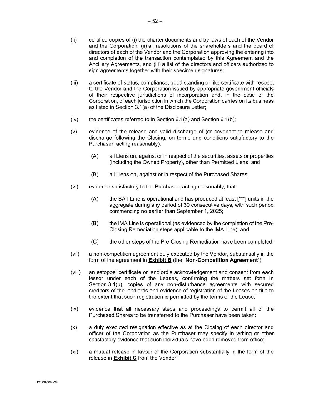 – 52 – 121739605 v29 (ii) certified copies of (i) the charter documents and by laws of each of the Vendor and the Corporation, (ii) all resolutions of the shareholders and the board of directors of each of the Vendor and the Corporation approving the entering into and completion of the transaction contemplated by this Agreement and the Ancillary Agreements, and (iii) a list of the directors and officers authorized to sign agreements together with their specimen signatures; (iii) a certificate of status, compliance, good standing or like certificate with respect to the Vendor and the Corporation issued by appropriate government officials of their respective jurisdictions of incorporation and, in the case of the Corporation, of each jurisdiction in which the Corporation carries on its business as listed in Section 3.1(a) of the Disclosure Letter; (iv) the certificates referred to in Section 6.1(a) and Section 6.1(b); (v) evidence of the release and valid discharge of (or covenant to release and discharge following the Closing, on terms and conditions satisfactory to the Purchaser, acting reasonably): (A) all Liens on, against or in respect of the securities, assets or properties (including the Owned Property), other than Permitted Liens; and (B) all Liens on, against or in respect of the Purchased Shares; (vi) evidence satisfactory to the Purchaser, acting reasonably, that: (A) the BAT Line is operational and has produced at least [***] units in the aggregate during any period of 30 consecutive days, with such period commencing no earlier than September 1, 2025; (B) the IMA Line is operational (as evidenced by the completion of the Pre- Closing Remediation steps applicable to the IMA Line); and (C) the other steps of the Pre-Closing Remediation have been completed; (vii) a non-competition agreement duly executed by the Vendor, substantially in the form of the agreement in Exhibit B (the “Non-Competition Agreement”); (viii) an estoppel certificate or landlord’s acknowledgement and consent from each lessor under each of the Leases, confirming the matters set forth in Section 3.1(u), copies of any non-disturbance agreements with secured creditors of the landlords and evidence of registration of the Leases on title to the extent that such registration is permitted by the terms of the Lease; (ix) evidence that all necessary steps and proceedings to permit all of the Purchased Shares to be transferred to the Purchaser have been taken; (x) a duly executed resignation effective as at the Closing of each director and officer of the Corporation as the Purchaser may specify in writing or other satisfactory evidence that such individuals have been removed from office; (xi) a mutual release in favour of the Corporation substantially in the form of the release in Exhibit C from the Vendor;