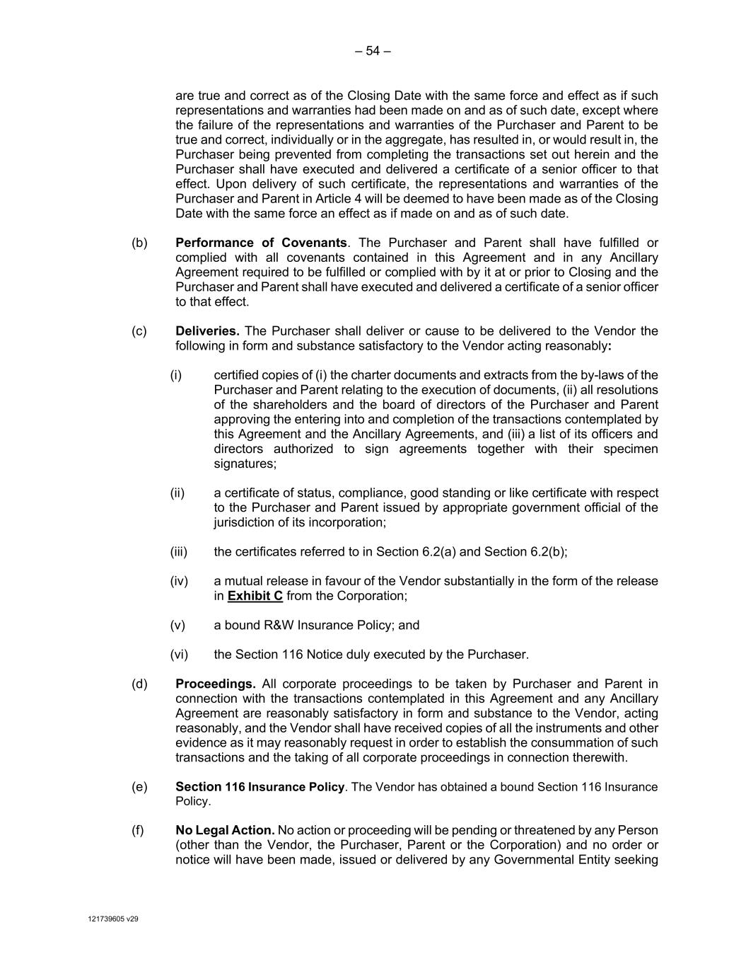 – 54 – 121739605 v29 are true and correct as of the Closing Date with the same force and effect as if such representations and warranties had been made on and as of such date, except where the failure of the representations and warranties of the Purchaser and Parent to be true and correct, individually or in the aggregate, has resulted in, or would result in, the Purchaser being prevented from completing the transactions set out herein and the Purchaser shall have executed and delivered a certificate of a senior officer to that effect. Upon delivery of such certificate, the representations and warranties of the Purchaser and Parent in Article 4 will be deemed to have been made as of the Closing Date with the same force an effect as if made on and as of such date. (b) Performance of Covenants. The Purchaser and Parent shall have fulfilled or complied with all covenants contained in this Agreement and in any Ancillary Agreement required to be fulfilled or complied with by it at or prior to Closing and the Purchaser and Parent shall have executed and delivered a certificate of a senior officer to that effect. (c) Deliveries. The Purchaser shall deliver or cause to be delivered to the Vendor the following in form and substance satisfactory to the Vendor acting reasonably: (i) certified copies of (i) the charter documents and extracts from the by-laws of the Purchaser and Parent relating to the execution of documents, (ii) all resolutions of the shareholders and the board of directors of the Purchaser and Parent approving the entering into and completion of the transactions contemplated by this Agreement and the Ancillary Agreements, and (iii) a list of its officers and directors authorized to sign agreements together with their specimen signatures; (ii) a certificate of status, compliance, good standing or like certificate with respect to the Purchaser and Parent issued by appropriate government official of the jurisdiction of its incorporation; (iii) the certificates referred to in Section 6.2(a) and Section 6.2(b); (iv) a mutual release in favour of the Vendor substantially in the form of the release in Exhibit C from the Corporation; (v) a bound R&W Insurance Policy; and (vi) the Section 116 Notice duly executed by the Purchaser. (d) Proceedings. All corporate proceedings to be taken by Purchaser and Parent in connection with the transactions contemplated in this Agreement and any Ancillary Agreement are reasonably satisfactory in form and substance to the Vendor, acting reasonably, and the Vendor shall have received copies of all the instruments and other evidence as it may reasonably request in order to establish the consummation of such transactions and the taking of all corporate proceedings in connection therewith. (e) Section 116 Insurance Policy. The Vendor has obtained a bound Section 116 Insurance Policy. (f) No Legal Action. No action or proceeding will be pending or threatened by any Person (other than the Vendor, the Purchaser, Parent or the Corporation) and no order or notice will have been made, issued or delivered by any Governmental Entity seeking