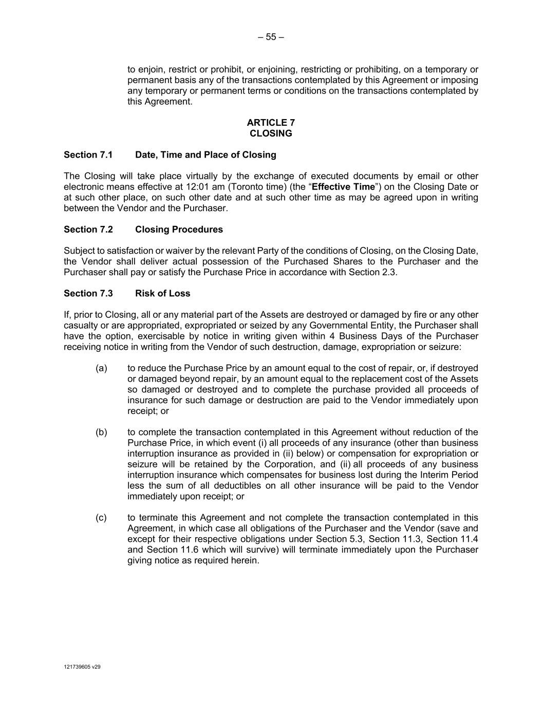 – 55 – 121739605 v29 to enjoin, restrict or prohibit, or enjoining, restricting or prohibiting, on a temporary or permanent basis any of the transactions contemplated by this Agreement or imposing any temporary or permanent terms or conditions on the transactions contemplated by this Agreement. ARTICLE 7 CLOSING Section 7.1 Date, Time and Place of Closing The Closing will take place virtually by the exchange of executed documents by email or other electronic means effective at 12:01 am (Toronto time) (the “Effective Time”) on the Closing Date or at such other place, on such other date and at such other time as may be agreed upon in writing between the Vendor and the Purchaser. Section 7.2 Closing Procedures Subject to satisfaction or waiver by the relevant Party of the conditions of Closing, on the Closing Date, the Vendor shall deliver actual possession of the Purchased Shares to the Purchaser and the Purchaser shall pay or satisfy the Purchase Price in accordance with Section 2.3. Section 7.3 Risk of Loss If, prior to Closing, all or any material part of the Assets are destroyed or damaged by fire or any other casualty or are appropriated, expropriated or seized by any Governmental Entity, the Purchaser shall have the option, exercisable by notice in writing given within 4 Business Days of the Purchaser receiving notice in writing from the Vendor of such destruction, damage, expropriation or seizure: (a) to reduce the Purchase Price by an amount equal to the cost of repair, or, if destroyed or damaged beyond repair, by an amount equal to the replacement cost of the Assets so damaged or destroyed and to complete the purchase provided all proceeds of insurance for such damage or destruction are paid to the Vendor immediately upon receipt; or (b) to complete the transaction contemplated in this Agreement without reduction of the Purchase Price, in which event (i) all proceeds of any insurance (other than business interruption insurance as provided in (ii) below) or compensation for expropriation or seizure will be retained by the Corporation, and (ii) all proceeds of any business interruption insurance which compensates for business lost during the Interim Period less the sum of all deductibles on all other insurance will be paid to the Vendor immediately upon receipt; or (c) to terminate this Agreement and not complete the transaction contemplated in this Agreement, in which case all obligations of the Purchaser and the Vendor (save and except for their respective obligations under Section 5.3, Section 11.3, Section 11.4 and Section 11.6 which will survive) will terminate immediately upon the Purchaser giving notice as required herein.