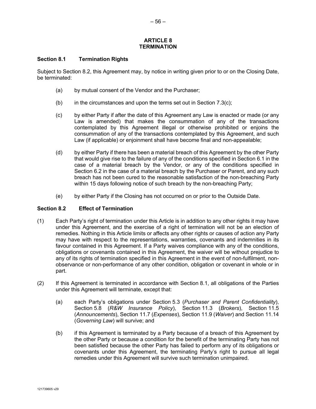 – 56 – 121739605 v29 ARTICLE 8 TERMINATION Section 8.1 Termination Rights Subject to Section 8.2, this Agreement may, by notice in writing given prior to or on the Closing Date, be terminated: (a) by mutual consent of the Vendor and the Purchaser; (b) in the circumstances and upon the terms set out in Section 7.3(c); (c) by either Party if after the date of this Agreement any Law is enacted or made (or any Law is amended) that makes the consummation of any of the transactions contemplated by this Agreement illegal or otherwise prohibited or enjoins the consummation of any of the transactions contemplated by this Agreement, and such Law (if applicable) or enjoinment shall have become final and non-appealable; (d) by either Party if there has been a material breach of this Agreement by the other Party that would give rise to the failure of any of the conditions specified in Section 6.1 in the case of a material breach by the Vendor, or any of the conditions specified in Section 6.2 in the case of a material breach by the Purchaser or Parent, and any such breach has not been cured to the reasonable satisfaction of the non-breaching Party within 15 days following notice of such breach by the non-breaching Party; (e) by either Party if the Closing has not occurred on or prior to the Outside Date. Section 8.2 Effect of Termination (1) Each Party’s right of termination under this Article is in addition to any other rights it may have under this Agreement, and the exercise of a right of termination will not be an election of remedies. Nothing in this Article limits or affects any other rights or causes of action any Party may have with respect to the representations, warranties, covenants and indemnities in its favour contained in this Agreement. If a Party waives compliance with any of the conditions, obligations or covenants contained in this Agreement, the waiver will be without prejudice to any of its rights of termination specified in this Agreement in the event of non-fulfilment, non- observance or non-performance of any other condition, obligation or covenant in whole or in part. (2) If this Agreement is terminated in accordance with Section 8.1, all obligations of the Parties under this Agreement will terminate, except that: (a) each Party’s obligations under Section 5.3 (Purchaser and Parent Confidentiality), Section 5.8 (R&W Insurance Policy), Section 11.3 (Brokers), Section 11.5 (Announcements), Section 11.7 (Expenses), Section 11.9 (Waiver) and Section 11.14 (Governing Law) will survive; and (b) if this Agreement is terminated by a Party because of a breach of this Agreement by the other Party or because a condition for the benefit of the terminating Party has not been satisfied because the other Party has failed to perform any of its obligations or covenants under this Agreement, the terminating Party’s right to pursue all legal remedies under this Agreement will survive such termination unimpaired.