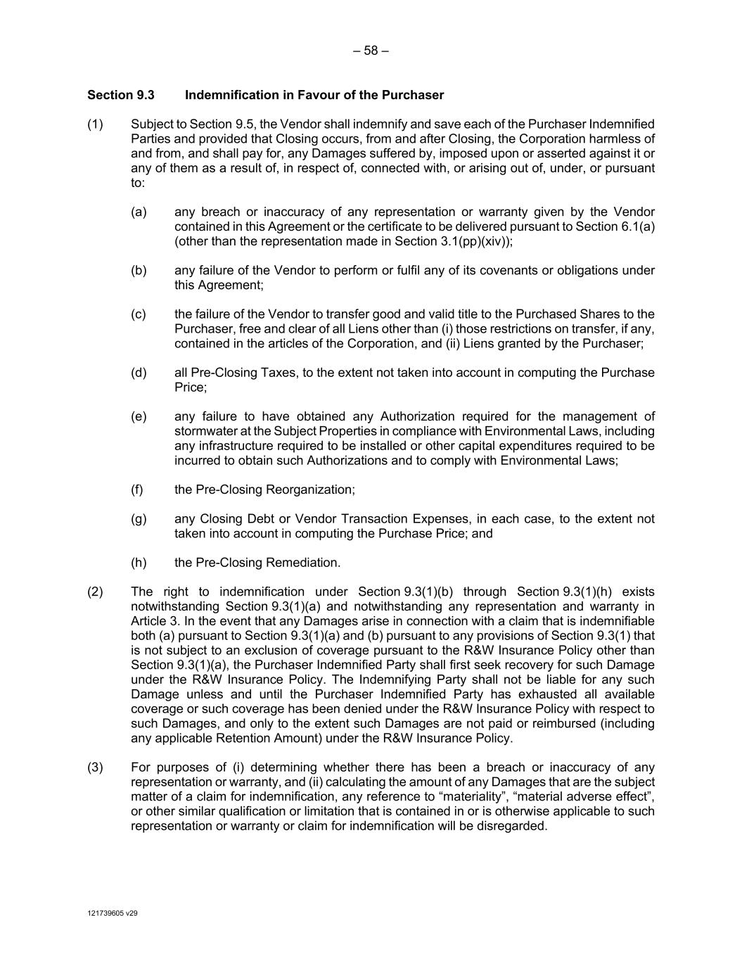 – 58 – 121739605 v29 Section 9.3 Indemnification in Favour of the Purchaser (1) Subject to Section 9.5, the Vendor shall indemnify and save each of the Purchaser Indemnified Parties and provided that Closing occurs, from and after Closing, the Corporation harmless of and from, and shall pay for, any Damages suffered by, imposed upon or asserted against it or any of them as a result of, in respect of, connected with, or arising out of, under, or pursuant to: (a) any breach or inaccuracy of any representation or warranty given by the Vendor contained in this Agreement or the certificate to be delivered pursuant to Section 6.1(a) (other than the representation made in Section 3.1(pp)(xiv)); (b) any failure of the Vendor to perform or fulfil any of its covenants or obligations under this Agreement; (c) the failure of the Vendor to transfer good and valid title to the Purchased Shares to the Purchaser, free and clear of all Liens other than (i) those restrictions on transfer, if any, contained in the articles of the Corporation, and (ii) Liens granted by the Purchaser; (d) all Pre-Closing Taxes, to the extent not taken into account in computing the Purchase Price; (e) any failure to have obtained any Authorization required for the management of stormwater at the Subject Properties in compliance with Environmental Laws, including any infrastructure required to be installed or other capital expenditures required to be incurred to obtain such Authorizations and to comply with Environmental Laws; (f) the Pre-Closing Reorganization; (g) any Closing Debt or Vendor Transaction Expenses, in each case, to the extent not taken into account in computing the Purchase Price; and (h) the Pre-Closing Remediation. (2) The right to indemnification under Section 9.3(1)(b) through Section 9.3(1)(h) exists notwithstanding Section 9.3(1)(a) and notwithstanding any representation and warranty in Article 3. In the event that any Damages arise in connection with a claim that is indemnifiable both (a) pursuant to Section 9.3(1)(a) and (b) pursuant to any provisions of Section 9.3(1) that is not subject to an exclusion of coverage pursuant to the R&W Insurance Policy other than Section 9.3(1)(a), the Purchaser Indemnified Party shall first seek recovery for such Damage under the R&W Insurance Policy. The Indemnifying Party shall not be liable for any such Damage unless and until the Purchaser Indemnified Party has exhausted all available coverage or such coverage has been denied under the R&W Insurance Policy with respect to such Damages, and only to the extent such Damages are not paid or reimbursed (including any applicable Retention Amount) under the R&W Insurance Policy. (3) For purposes of (i) determining whether there has been a breach or inaccuracy of any representation or warranty, and (ii) calculating the amount of any Damages that are the subject matter of a claim for indemnification, any reference to “materiality”, “material adverse effect”, or other similar qualification or limitation that is contained in or is otherwise applicable to such representation or warranty or claim for indemnification will be disregarded.