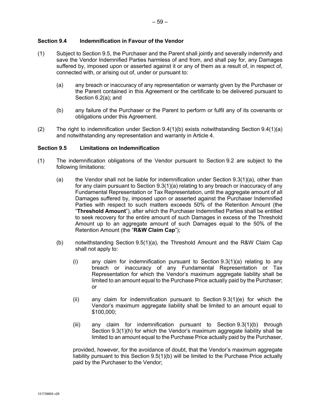 – 59 – 121739605 v29 Section 9.4 Indemnification in Favour of the Vendor (1) Subject to Section 9.5, the Purchaser and the Parent shall jointly and severally indemnify and save the Vendor Indemnified Parties harmless of and from, and shall pay for, any Damages suffered by, imposed upon or asserted against it or any of them as a result of, in respect of, connected with, or arising out of, under or pursuant to: (a) any breach or inaccuracy of any representation or warranty given by the Purchaser or the Parent contained in this Agreement or the certificate to be delivered pursuant to Section 6.2(a); and (b) any failure of the Purchaser or the Parent to perform or fulfil any of its covenants or obligations under this Agreement. (2) The right to indemnification under Section 9.4(1)(b) exists notwithstanding Section 9.4(1)(a) and notwithstanding any representation and warranty in Article 4. Section 9.5 Limitations on Indemnification (1) The indemnification obligations of the Vendor pursuant to Section 9.2 are subject to the following limitations: (a) the Vendor shall not be liable for indemnification under Section 9.3(1)(a), other than for any claim pursuant to Section 9.3(1)(a) relating to any breach or inaccuracy of any Fundamental Representation or Tax Representation, until the aggregate amount of all Damages suffered by, imposed upon or asserted against the Purchaser Indemnified Parties with respect to such matters exceeds 50% of the Retention Amount (the “Threshold Amount”), after which the Purchaser Indemnified Parties shall be entitled to seek recovery for the entire amount of such Damages in excess of the Threshold Amount up to an aggregate amount of such Damages equal to the 50% of the Retention Amount (the “R&W Claim Cap”); (b) notwithstanding Section 9.5(1)(a), the Threshold Amount and the R&W Claim Cap shall not apply to: (i) any claim for indemnification pursuant to Section 9.3(1)(a) relating to any breach or inaccuracy of any Fundamental Representation or Tax Representation for which the Vendor’s maximum aggregate liability shall be limited to an amount equal to the Purchase Price actually paid by the Purchaser; or (ii) any claim for indemnification pursuant to Section 9.3(1)(e) for which the Vendor’s maximum aggregate liability shall be limited to an amount equal to $100,000; (iii) any claim for indemnification pursuant to Section 9.3(1)(b) through Section 9.3(1)(h) for which the Vendor’s maximum aggregate liability shall be limited to an amount equal to the Purchase Price actually paid by the Purchaser, provided, however, for the avoidance of doubt, that the Vendor’s maximum aggregate liability pursuant to this Section 9.5(1)(b) will be limited to the Purchase Price actually paid by the Purchaser to the Vendor;