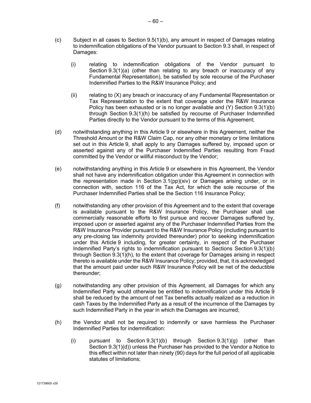– 60 – 121739605 v29 (c) Subject in all cases to Section 9.5(1)(b), any amount in respect of Damages relating to indemnification obligations of the Vendor pursuant to Section 9.3 shall, in respect of Damages: (i) relating to indemnification obligations of the Vendor pursuant to Section 9.3(1)(a) (other than relating to any breach or inaccuracy of any Fundamental Representation), be satisfied by sole recourse of the Purchaser Indemnified Parties to the R&W Insurance Policy; and (ii) relating to (X) any breach or inaccuracy of any Fundamental Representation or Tax Representation to the extent that coverage under the R&W Insurance Policy has been exhausted or is no longer available and (Y) Section 9.3(1)(b) through Section 9.3(1)(h) be satisfied by recourse of Purchaser Indemnified Parties directly to the Vendor pursuant to the terms of this Agreement; (d) notwithstanding anything in this Article 9 or elsewhere in this Agreement, neither the Threshold Amount or the R&W Claim Cap, nor any other monetary or time limitations set out in this Article 9, shall apply to any Damages suffered by, imposed upon or asserted against any of the Purchaser Indemnified Parties resulting from Fraud committed by the Vendor or willful misconduct by the Vendor; (e) notwithstanding anything in this Article 9 or elsewhere in this Agreement, the Vendor shall not have any indemnification obligation under this Agreement in connection with the representation made in Section 3.1(pp)(xiv) or Damages arising under, or in connection with, section 116 of the Tax Act, for which the sole recourse of the Purchaser Indemnified Parties shall be the Section 116 Insurance Policy; (f) notwithstanding any other provision of this Agreement and to the extent that coverage is available pursuant to the R&W Insurance Policy, the Purchaser shall use commercially reasonable efforts to first pursue and recover Damages suffered by, imposed upon or asserted against any of the Purchaser Indemnified Parties from the R&W Insurance Provider pursuant to the R&W Insurance Policy (including pursuant to any pre-closing tax indemnity provided thereunder) prior to seeking indemnification under this Article 9 including, for greater certainty, in respect of the Purchaser Indemnified Party’s rights to indemnification pursuant to Sections Section 9.3(1)(b) through Section 9.3(1)(h), to the extent that coverage for Damages arising in respect thereto is available under the R&W Insurance Policy; provided, that, it is acknowledged that the amount paid under such R&W Insurance Policy will be net of the deductible thereunder; (g) notwithstanding any other provision of this Agreement, all Damages for which any Indemnified Party would otherwise be entitled to indemnification under this Article 9 shall be reduced by the amount of net Tax benefits actually realized as a reduction in cash Taxes by the Indemnified Party as a result of the incurrence of the Damages by such Indemnified Party in the year in which the Damages are incurred; (h) the Vendor shall not be required to indemnify or save harmless the Purchaser Indemnified Parties for indemnification: (i) pursuant to Section 9.3(1)(b) through Section 9.3(1)(g) (other than Section 9.3(1)(d)) unless the Purchaser has provided to the Vendor a Notice to this effect within not later than ninety (90) days for the full period of all applicable statutes of limitations;