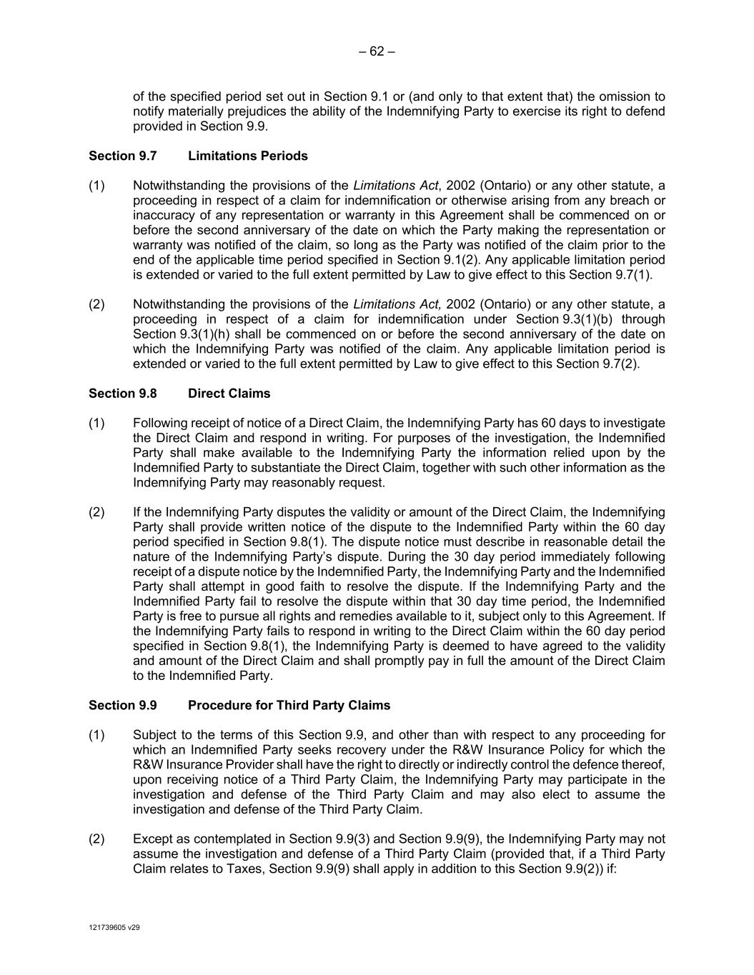 – 62 – 121739605 v29 of the specified period set out in Section 9.1 or (and only to that extent that) the omission to notify materially prejudices the ability of the Indemnifying Party to exercise its right to defend provided in Section 9.9. Section 9.7 Limitations Periods (1) Notwithstanding the provisions of the Limitations Act, 2002 (Ontario) or any other statute, a proceeding in respect of a claim for indemnification or otherwise arising from any breach or inaccuracy of any representation or warranty in this Agreement shall be commenced on or before the second anniversary of the date on which the Party making the representation or warranty was notified of the claim, so long as the Party was notified of the claim prior to the end of the applicable time period specified in Section 9.1(2). Any applicable limitation period is extended or varied to the full extent permitted by Law to give effect to this Section 9.7(1). (2) Notwithstanding the provisions of the Limitations Act, 2002 (Ontario) or any other statute, a proceeding in respect of a claim for indemnification under Section 9.3(1)(b) through Section 9.3(1)(h) shall be commenced on or before the second anniversary of the date on which the Indemnifying Party was notified of the claim. Any applicable limitation period is extended or varied to the full extent permitted by Law to give effect to this Section 9.7(2). Section 9.8 Direct Claims (1) Following receipt of notice of a Direct Claim, the Indemnifying Party has 60 days to investigate the Direct Claim and respond in writing. For purposes of the investigation, the Indemnified Party shall make available to the Indemnifying Party the information relied upon by the Indemnified Party to substantiate the Direct Claim, together with such other information as the Indemnifying Party may reasonably request. (2) If the Indemnifying Party disputes the validity or amount of the Direct Claim, the Indemnifying Party shall provide written notice of the dispute to the Indemnified Party within the 60 day period specified in Section 9.8(1). The dispute notice must describe in reasonable detail the nature of the Indemnifying Party’s dispute. During the 30 day period immediately following receipt of a dispute notice by the Indemnified Party, the Indemnifying Party and the Indemnified Party shall attempt in good faith to resolve the dispute. If the Indemnifying Party and the Indemnified Party fail to resolve the dispute within that 30 day time period, the Indemnified Party is free to pursue all rights and remedies available to it, subject only to this Agreement. If the Indemnifying Party fails to respond in writing to the Direct Claim within the 60 day period specified in Section 9.8(1), the Indemnifying Party is deemed to have agreed to the validity and amount of the Direct Claim and shall promptly pay in full the amount of the Direct Claim to the Indemnified Party. Section 9.9 Procedure for Third Party Claims (1) Subject to the terms of this Section 9.9, and other than with respect to any proceeding for which an Indemnified Party seeks recovery under the R&W Insurance Policy for which the R&W Insurance Provider shall have the right to directly or indirectly control the defence thereof, upon receiving notice of a Third Party Claim, the Indemnifying Party may participate in the investigation and defense of the Third Party Claim and may also elect to assume the investigation and defense of the Third Party Claim. (2) Except as contemplated in Section 9.9(3) and Section 9.9(9), the Indemnifying Party may not assume the investigation and defense of a Third Party Claim (provided that, if a Third Party Claim relates to Taxes, Section 9.9(9) shall apply in addition to this Section 9.9(2)) if: