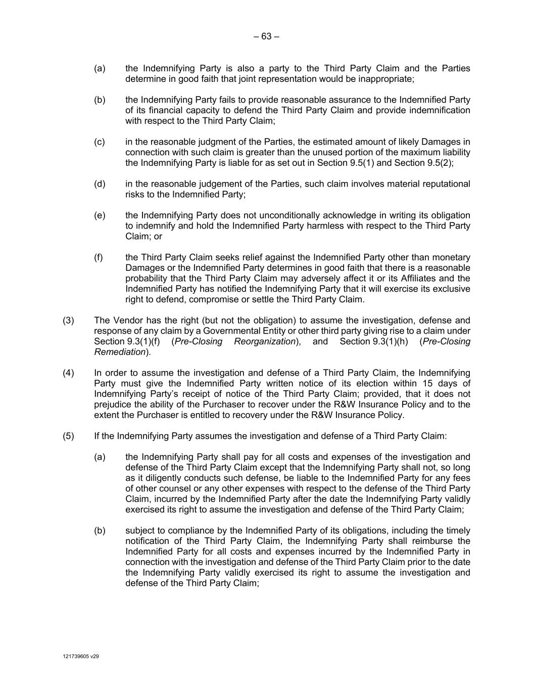 – 63 – 121739605 v29 (a) the Indemnifying Party is also a party to the Third Party Claim and the Parties determine in good faith that joint representation would be inappropriate; (b) the Indemnifying Party fails to provide reasonable assurance to the Indemnified Party of its financial capacity to defend the Third Party Claim and provide indemnification with respect to the Third Party Claim; (c) in the reasonable judgment of the Parties, the estimated amount of likely Damages in connection with such claim is greater than the unused portion of the maximum liability the Indemnifying Party is liable for as set out in Section 9.5(1) and Section 9.5(2); (d) in the reasonable judgement of the Parties, such claim involves material reputational risks to the Indemnified Party; (e) the Indemnifying Party does not unconditionally acknowledge in writing its obligation to indemnify and hold the Indemnified Party harmless with respect to the Third Party Claim; or (f) the Third Party Claim seeks relief against the Indemnified Party other than monetary Damages or the Indemnified Party determines in good faith that there is a reasonable probability that the Third Party Claim may adversely affect it or its Affiliates and the Indemnified Party has notified the Indemnifying Party that it will exercise its exclusive right to defend, compromise or settle the Third Party Claim. (3) The Vendor has the right (but not the obligation) to assume the investigation, defense and response of any claim by a Governmental Entity or other third party giving rise to a claim under Section 9.3(1)(f) (Pre-Closing Reorganization), and Section 9.3(1)(h) (Pre-Closing Remediation). (4) In order to assume the investigation and defense of a Third Party Claim, the Indemnifying Party must give the Indemnified Party written notice of its election within 15 days of Indemnifying Party’s receipt of notice of the Third Party Claim; provided, that it does not prejudice the ability of the Purchaser to recover under the R&W Insurance Policy and to the extent the Purchaser is entitled to recovery under the R&W Insurance Policy. (5) If the Indemnifying Party assumes the investigation and defense of a Third Party Claim: (a) the Indemnifying Party shall pay for all costs and expenses of the investigation and defense of the Third Party Claim except that the Indemnifying Party shall not, so long as it diligently conducts such defense, be liable to the Indemnified Party for any fees of other counsel or any other expenses with respect to the defense of the Third Party Claim, incurred by the Indemnified Party after the date the Indemnifying Party validly exercised its right to assume the investigation and defense of the Third Party Claim; (b) subject to compliance by the Indemnified Party of its obligations, including the timely notification of the Third Party Claim, the Indemnifying Party shall reimburse the Indemnified Party for all costs and expenses incurred by the Indemnified Party in connection with the investigation and defense of the Third Party Claim prior to the date the Indemnifying Party validly exercised its right to assume the investigation and defense of the Third Party Claim;
