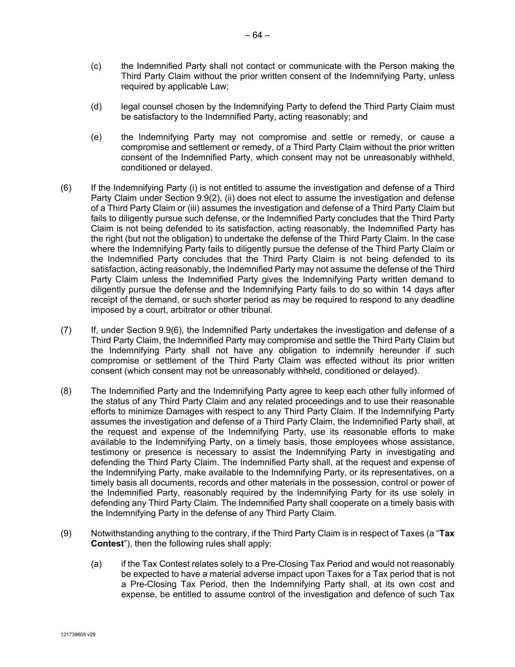 – 64 – 121739605 v29 (c) the Indemnified Party shall not contact or communicate with the Person making the Third Party Claim without the prior written consent of the Indemnifying Party, unless required by applicable Law; (d) legal counsel chosen by the Indemnifying Party to defend the Third Party Claim must be satisfactory to the Indemnified Party, acting reasonably; and (e) the Indemnifying Party may not compromise and settle or remedy, or cause a compromise and settlement or remedy, of a Third Party Claim without the prior written consent of the Indemnified Party, which consent may not be unreasonably withheld, conditioned or delayed. (6) If the Indemnifying Party (i) is not entitled to assume the investigation and defense of a Third Party Claim under Section 9.9(2), (ii) does not elect to assume the investigation and defense of a Third Party Claim or (iii) assumes the investigation and defense of a Third Party Claim but fails to diligently pursue such defense, or the Indemnified Party concludes that the Third Party Claim is not being defended to its satisfaction, acting reasonably, the Indemnified Party has the right (but not the obligation) to undertake the defense of the Third Party Claim. In the case where the Indemnifying Party fails to diligently pursue the defense of the Third Party Claim or the Indemnified Party concludes that the Third Party Claim is not being defended to its satisfaction, acting reasonably, the Indemnified Party may not assume the defense of the Third Party Claim unless the Indemnified Party gives the Indemnifying Party written demand to diligently pursue the defense and the Indemnifying Party fails to do so within 14 days after receipt of the demand, or such shorter period as may be required to respond to any deadline imposed by a court, arbitrator or other tribunal. (7) If, under Section 9.9(6), the Indemnified Party undertakes the investigation and defense of a Third Party Claim, the Indemnified Party may compromise and settle the Third Party Claim but the Indemnifying Party shall not have any obligation to indemnify hereunder if such compromise or settlement of the Third Party Claim was effected without its prior written consent (which consent may not be unreasonably withheld, conditioned or delayed). (8) The Indemnified Party and the Indemnifying Party agree to keep each other fully informed of the status of any Third Party Claim and any related proceedings and to use their reasonable efforts to minimize Damages with respect to any Third Party Claim. If the Indemnifying Party assumes the investigation and defense of a Third Party Claim, the Indemnified Party shall, at the request and expense of the Indemnifying Party, use its reasonable efforts to make available to the Indemnifying Party, on a timely basis, those employees whose assistance, testimony or presence is necessary to assist the Indemnifying Party in investigating and defending the Third Party Claim. The Indemnified Party shall, at the request and expense of the Indemnifying Party, make available to the Indemnifying Party, or its representatives, on a timely basis all documents, records and other materials in the possession, control or power of the Indemnified Party, reasonably required by the Indemnifying Party for its use solely in defending any Third Party Claim. The Indemnified Party shall cooperate on a timely basis with the Indemnifying Party in the defense of any Third Party Claim. (9) Notwithstanding anything to the contrary, if the Third Party Claim is in respect of Taxes (a “Tax Contest”), then the following rules shall apply: (a) if the Tax Contest relates solely to a Pre-Closing Tax Period and would not reasonably be expected to have a material adverse impact upon Taxes for a Tax period that is not a Pre-Closing Tax Period, then the Indemnifying Party shall, at its own cost and expense, be entitled to assume control of the investigation and defence of such Tax