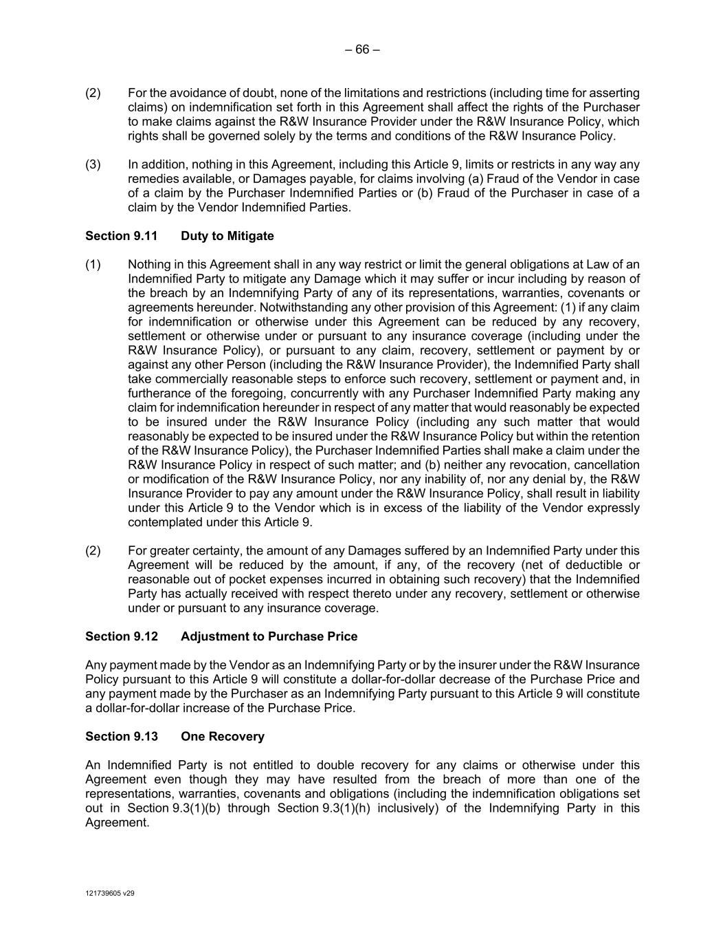 – 66 – 121739605 v29 (2) For the avoidance of doubt, none of the limitations and restrictions (including time for asserting claims) on indemnification set forth in this Agreement shall affect the rights of the Purchaser to make claims against the R&W Insurance Provider under the R&W Insurance Policy, which rights shall be governed solely by the terms and conditions of the R&W Insurance Policy. (3) In addition, nothing in this Agreement, including this Article 9, limits or restricts in any way any remedies available, or Damages payable, for claims involving (a) Fraud of the Vendor in case of a claim by the Purchaser Indemnified Parties or (b) Fraud of the Purchaser in case of a claim by the Vendor Indemnified Parties. Section 9.11 Duty to Mitigate (1) Nothing in this Agreement shall in any way restrict or limit the general obligations at Law of an Indemnified Party to mitigate any Damage which it may suffer or incur including by reason of the breach by an Indemnifying Party of any of its representations, warranties, covenants or agreements hereunder. Notwithstanding any other provision of this Agreement: (1) if any claim for indemnification or otherwise under this Agreement can be reduced by any recovery, settlement or otherwise under or pursuant to any insurance coverage (including under the R&W Insurance Policy), or pursuant to any claim, recovery, settlement or payment by or against any other Person (including the R&W Insurance Provider), the Indemnified Party shall take commercially reasonable steps to enforce such recovery, settlement or payment and, in furtherance of the foregoing, concurrently with any Purchaser Indemnified Party making any claim for indemnification hereunder in respect of any matter that would reasonably be expected to be insured under the R&W Insurance Policy (including any such matter that would reasonably be expected to be insured under the R&W Insurance Policy but within the retention of the R&W Insurance Policy), the Purchaser Indemnified Parties shall make a claim under the R&W Insurance Policy in respect of such matter; and (b) neither any revocation, cancellation or modification of the R&W Insurance Policy, nor any inability of, nor any denial by, the R&W Insurance Provider to pay any amount under the R&W Insurance Policy, shall result in liability under this Article 9 to the Vendor which is in excess of the liability of the Vendor expressly contemplated under this Article 9. (2) For greater certainty, the amount of any Damages suffered by an Indemnified Party under this Agreement will be reduced by the amount, if any, of the recovery (net of deductible or reasonable out of pocket expenses incurred in obtaining such recovery) that the Indemnified Party has actually received with respect thereto under any recovery, settlement or otherwise under or pursuant to any insurance coverage. Section 9.12 Adjustment to Purchase Price Any payment made by the Vendor as an Indemnifying Party or by the insurer under the R&W Insurance Policy pursuant to this Article 9 will constitute a dollar-for-dollar decrease of the Purchase Price and any payment made by the Purchaser as an Indemnifying Party pursuant to this Article 9 will constitute a dollar-for-dollar increase of the Purchase Price. Section 9.13 One Recovery An Indemnified Party is not entitled to double recovery for any claims or otherwise under this Agreement even though they may have resulted from the breach of more than one of the representations, warranties, covenants and obligations (including the indemnification obligations set out in Section 9.3(1)(b) through Section 9.3(1)(h) inclusively) of the Indemnifying Party in this Agreement.