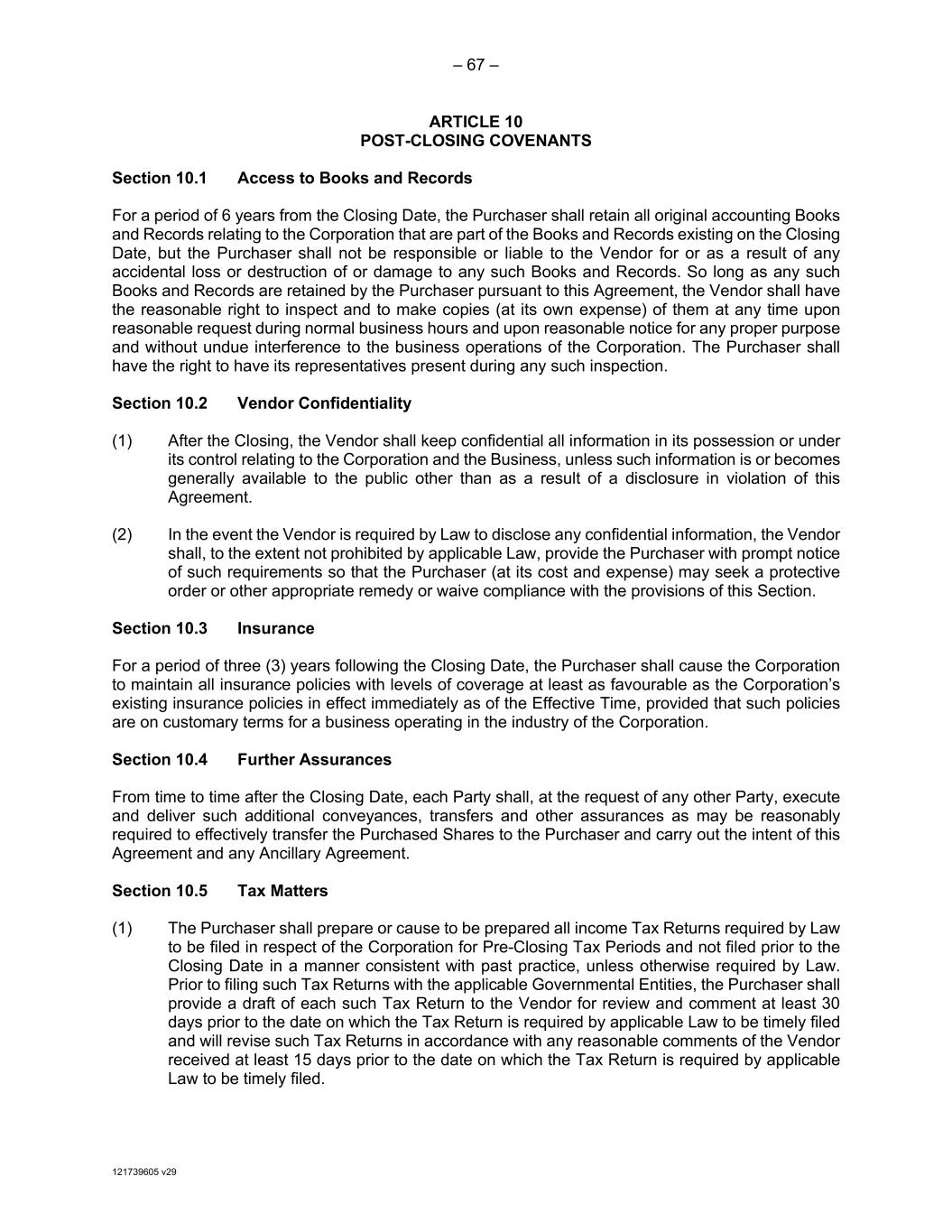 – 67 – 121739605 v29 ARTICLE 10 POST-CLOSING COVENANTS Section 10.1 Access to Books and Records For a period of 6 years from the Closing Date, the Purchaser shall retain all original accounting Books and Records relating to the Corporation that are part of the Books and Records existing on the Closing Date, but the Purchaser shall not be responsible or liable to the Vendor for or as a result of any accidental loss or destruction of or damage to any such Books and Records. So long as any such Books and Records are retained by the Purchaser pursuant to this Agreement, the Vendor shall have the reasonable right to inspect and to make copies (at its own expense) of them at any time upon reasonable request during normal business hours and upon reasonable notice for any proper purpose and without undue interference to the business operations of the Corporation. The Purchaser shall have the right to have its representatives present during any such inspection. Section 10.2 Vendor Confidentiality (1) After the Closing, the Vendor shall keep confidential all information in its possession or under its control relating to the Corporation and the Business, unless such information is or becomes generally available to the public other than as a result of a disclosure in violation of this Agreement. (2) In the event the Vendor is required by Law to disclose any confidential information, the Vendor shall, to the extent not prohibited by applicable Law, provide the Purchaser with prompt notice of such requirements so that the Purchaser (at its cost and expense) may seek a protective order or other appropriate remedy or waive compliance with the provisions of this Section. Section 10.3 Insurance For a period of three (3) years following the Closing Date, the Purchaser shall cause the Corporation to maintain all insurance policies with levels of coverage at least as favourable as the Corporation’s existing insurance policies in effect immediately as of the Effective Time, provided that such policies are on customary terms for a business operating in the industry of the Corporation. Section 10.4 Further Assurances From time to time after the Closing Date, each Party shall, at the request of any other Party, execute and deliver such additional conveyances, transfers and other assurances as may be reasonably required to effectively transfer the Purchased Shares to the Purchaser and carry out the intent of this Agreement and any Ancillary Agreement. Section 10.5 Tax Matters (1) The Purchaser shall prepare or cause to be prepared all income Tax Returns required by Law to be filed in respect of the Corporation for Pre-Closing Tax Periods and not filed prior to the Closing Date in a manner consistent with past practice, unless otherwise required by Law. Prior to filing such Tax Returns with the applicable Governmental Entities, the Purchaser shall provide a draft of each such Tax Return to the Vendor for review and comment at least 30 days prior to the date on which the Tax Return is required by applicable Law to be timely filed and will revise such Tax Returns in accordance with any reasonable comments of the Vendor received at least 15 days prior to the date on which the Tax Return is required by applicable Law to be timely filed.