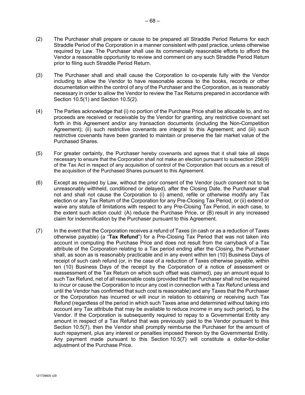 – 68 – 121739605 v29 (2) The Purchaser shall prepare or cause to be prepared all Straddle Period Returns for each Straddle Period of the Corporation in a manner consistent with past practice, unless otherwise required by Law. The Purchaser shall use its commercially reasonable efforts to afford the Vendor a reasonable opportunity to review and comment on any such Straddle Period Return prior to filing such Straddle Period Return. (3) The Purchaser shall and shall cause the Corporation to co-operate fully with the Vendor including to allow the Vendor to have reasonable access to the books, records or other documentation within the control of any of the Purchaser and the Corporation, as is reasonably necessary in order to allow the Vendor to review the Tax Returns prepared in accordance with Section 10.5(1) and Section 10.5(2). (4) The Parties acknowledge that (i) no portion of the Purchase Price shall be allocable to, and no proceeds are received or receivable by the Vendor for granting, any restrictive covenant set forth in this Agreement and/or any transaction documents (including the Non-Competition Agreement); (ii) such restrictive covenants are integral to this Agreement; and (iii) such restrictive covenants have been granted to maintain or preserve the fair market value of the Purchased Shares. (5) For greater certainty, the Purchaser hereby covenants and agrees that it shall take all steps necessary to ensure that the Corporation shall not make an election pursuant to subsection 256(9) of the Tax Act in respect of any acquisition of control of the Corporation that occurs as a result of the acquisition of the Purchased Shares pursuant to this Agreement. (6) Except as required by Law, without the prior consent of the Vendor (such consent not to be unreasonably withheld, conditioned or delayed), after the Closing Date, the Purchaser shall not and shall not cause the Corporation to (i) amend, refile or otherwise modify any Tax election or any Tax Return of the Corporation for any Pre-Closing Tax Period, or (ii) extend or waive any statute of limitations with respect to any Pre-Closing Tax Period, in each case, to the extent such action could: (A) reduce the Purchase Price, or (B) result in any increased claim for indemnification by the Purchaser pursuant to this Agreement. (7) In the event that the Corporation receives a refund of Taxes (in cash or as a reduction of Taxes otherwise payable) (a “Tax Refund”) for a Pre-Closing Tax Period that was not taken into account in computing the Purchase Price and does not result from the carryback of a Tax attribute of the Corporation relating to a Tax period ending after the Closing, the Purchaser shall, as soon as is reasonably practicable and in any event within ten (10) Business Days of receipt of such cash refund (or, in the case of a reduction of Taxes otherwise payable, within ten (10) Business Days of the receipt by the Corporation of a notice of assessment or reassessment of the Tax Return on which such offset was claimed), pay an amount equal to such Tax Refund, net of all reasonable costs (provided that the Purchaser shall not be required to incur or cause the Corporation to incur any cost in connection with a Tax Refund unless and until the Vendor has confirmed that such cost is reasonable) and any Taxes that the Purchaser or the Corporation has incurred or will incur in relation to obtaining or receiving such Tax Refund (regardless of the period in which such Taxes arise and determined without taking into account any Tax attribute that may be available to reduce income in any such period), to the Vendor. If the Corporation is subsequently required to repay to a Governmental Entity any amount in respect of a Tax Refund that was previously paid to the Vendor pursuant to this Section 10.5(7), then the Vendor shall promptly reimburse the Purchaser for the amount of such repayment, plus any interest or penalties imposed thereon by the Governmental Entity. Any payment made pursuant to this Section 10.5(7) will constitute a dollar-for-dollar adjustment of the Purchase Price.